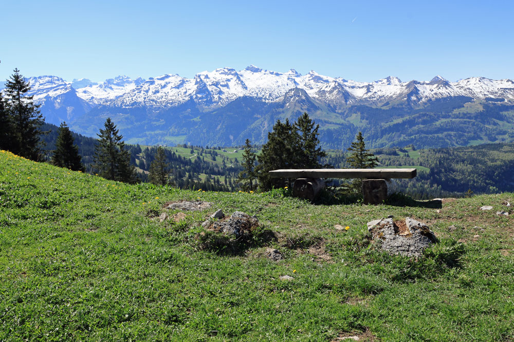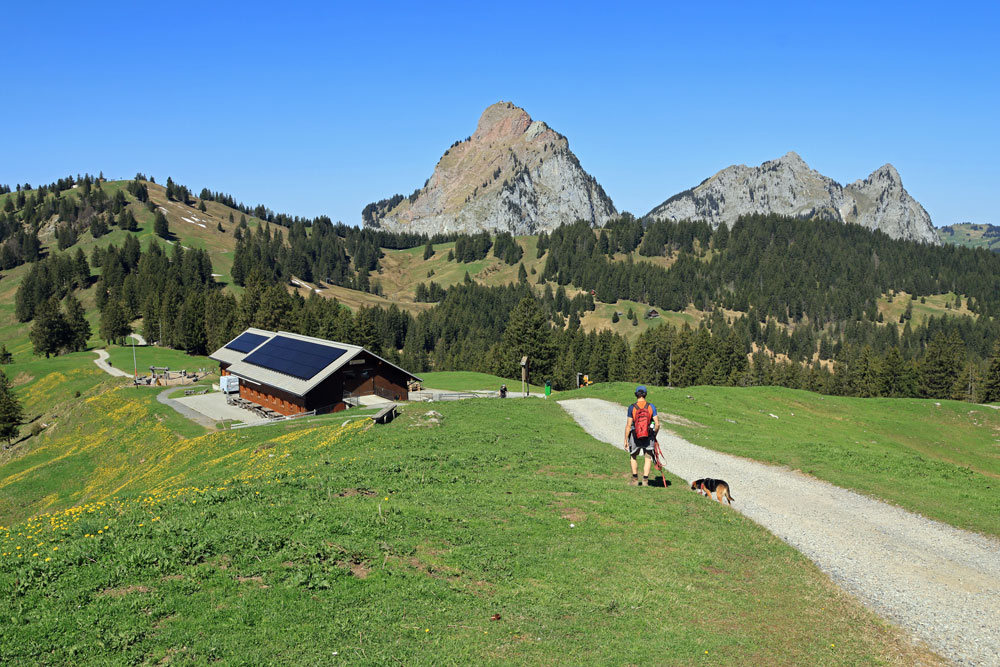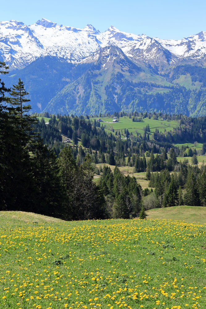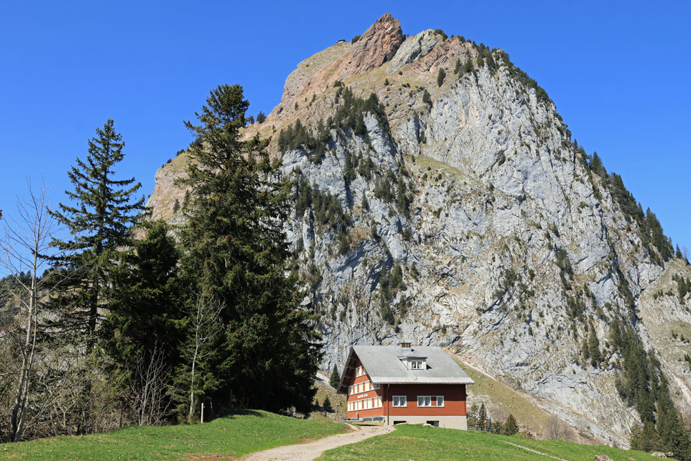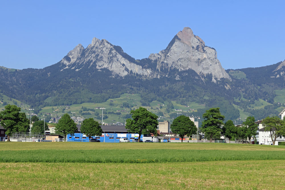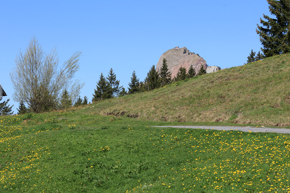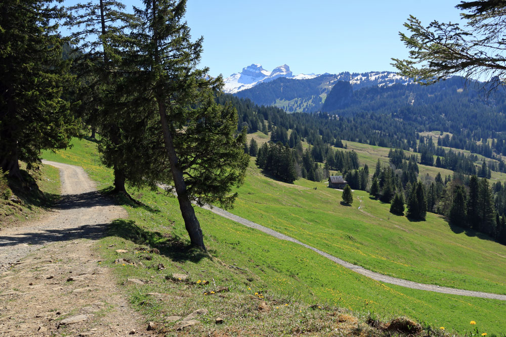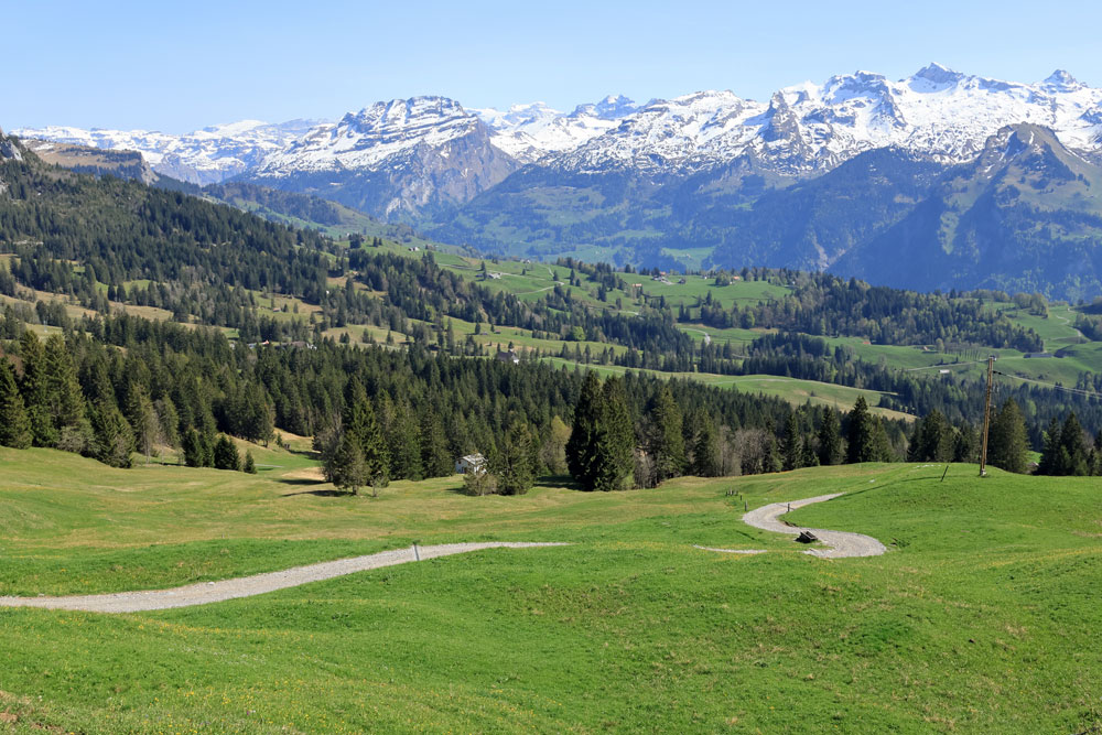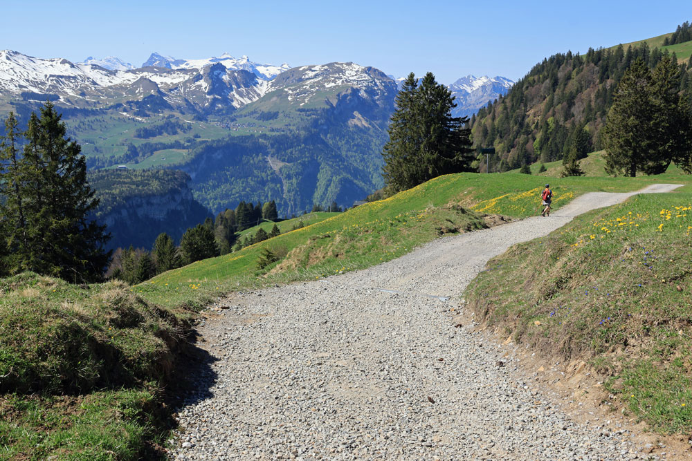 Al na enkele minuten wandelen passeren we de Sonnenhütte, die overigens gesloten is die dag. We lopen verder naar de Alpwirtschaft Zwäcken. Het wandelpad is een brede gravelweg met schitterende uitzichten links van ons en voor ons. Links hebben we namelijk uitzicht op onder andere Stoos en de daarboven gelegen Stoos Ridge Hike. De nog besneeuwde bergen vormen een prachtig contrast met het frisse groene gras vol paardenbloemen en de blauwe lucht. Het is er echt schitterend! Voor ons komt de Grosser Mythen steeds dichterbij en die ziet er echt wel heel imposant uit. Via de kruispunten Müsliegg en Staglerenegg wandelen we naar Holzegg. Een gedeelte van deze route gaat door het bos en ook de weg is af en toe wat saai, dus we zijn blij als we bij Holzegg arriveren.