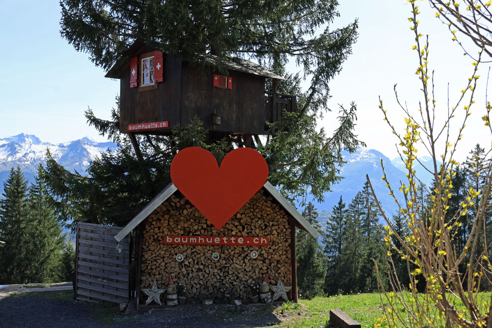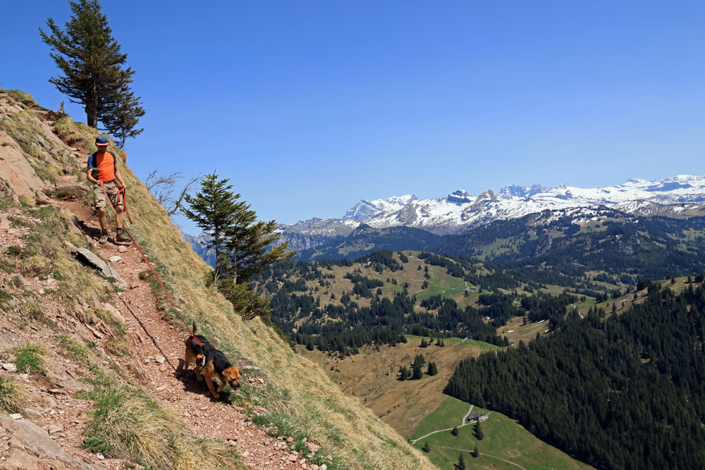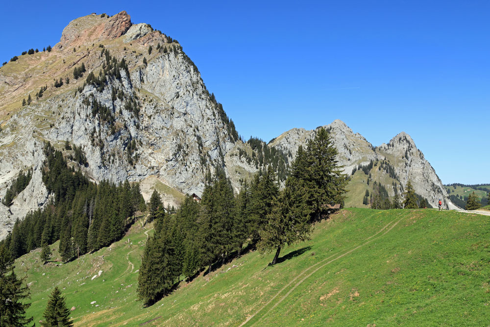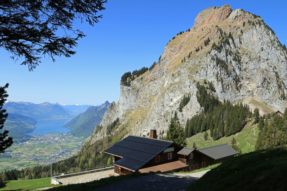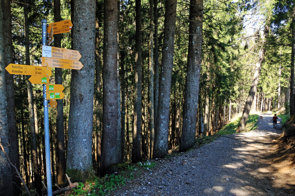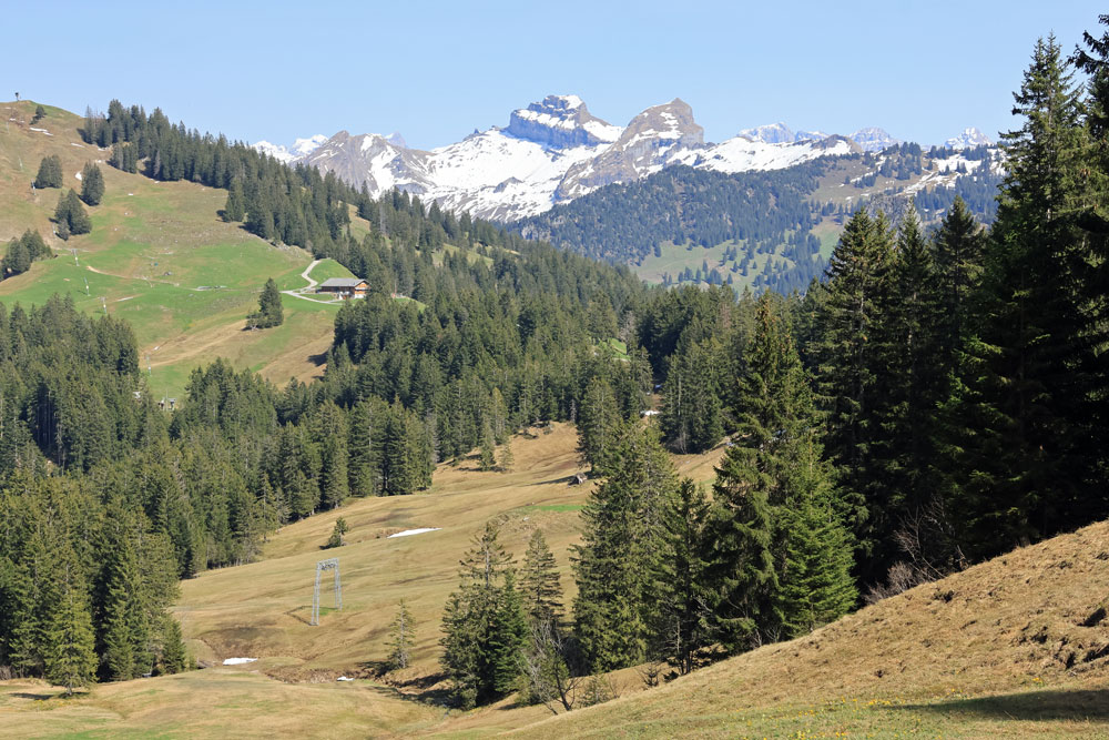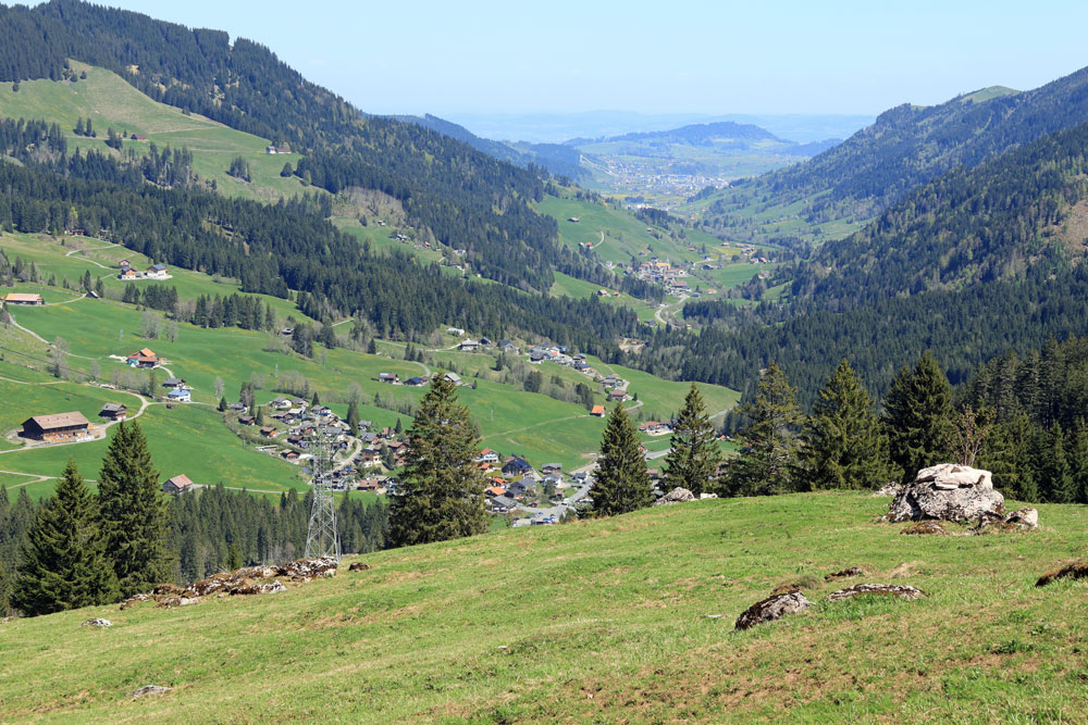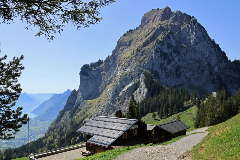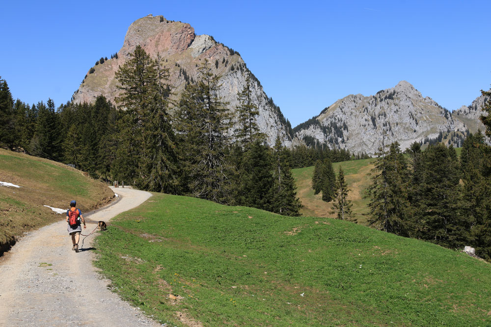 Al na enkele minuten wandelen passeren we de Sonnenhütte, die overigens gesloten is die dag. We lopen verder naar de Alpwirtschaft Zwäcken. Het wandelpad is een brede gravelweg met schitterende uitzichten links van ons en voor ons. Links hebben we namelijk uitzicht op onder andere Stoos en de daarboven gelegen Stoos Ridge Hike. De nog besneeuwde bergen vormen een prachtig contrast met het frisse groene gras vol paardenbloemen en de blauwe lucht. Het is er echt schitterend! Voor ons komt de Grosser Mythen steeds dichterbij en die ziet er echt wel heel imposant uit. Via de kruispunten Müsliegg en Staglerenegg wandelen we naar Holzegg. Een gedeelte van deze route gaat door het bos en ook de weg is af en toe wat saai, dus we zijn blij als we bij Holzegg arriveren.
