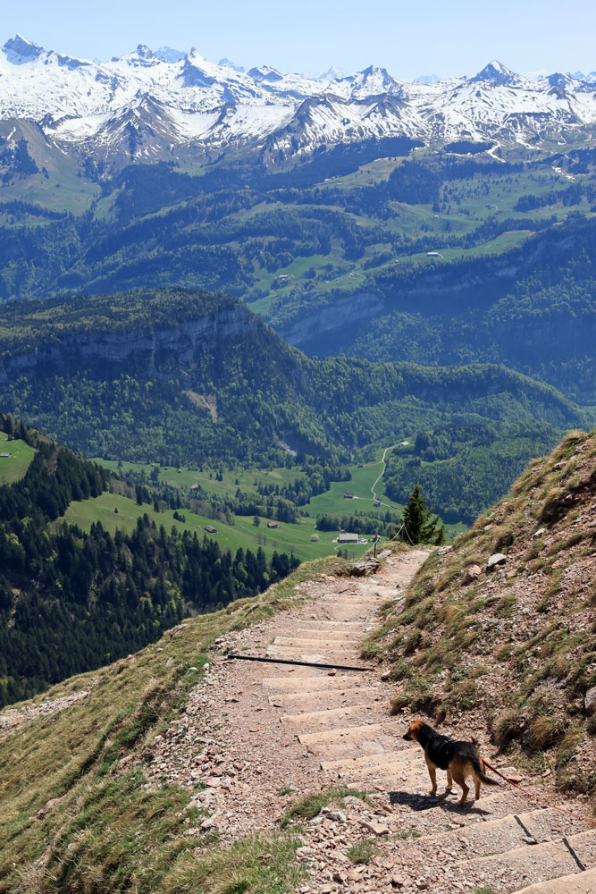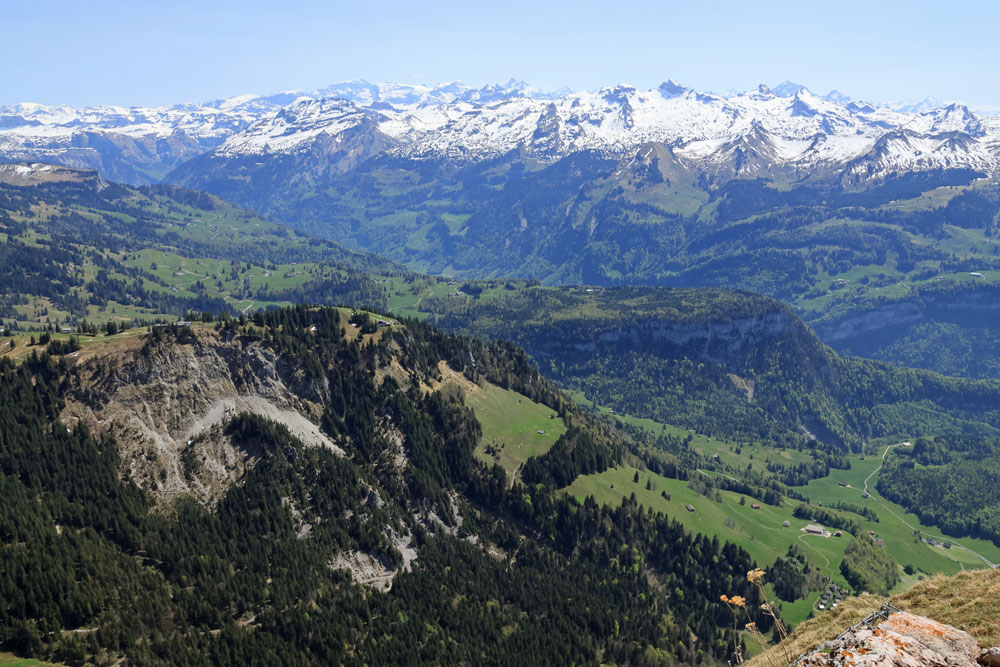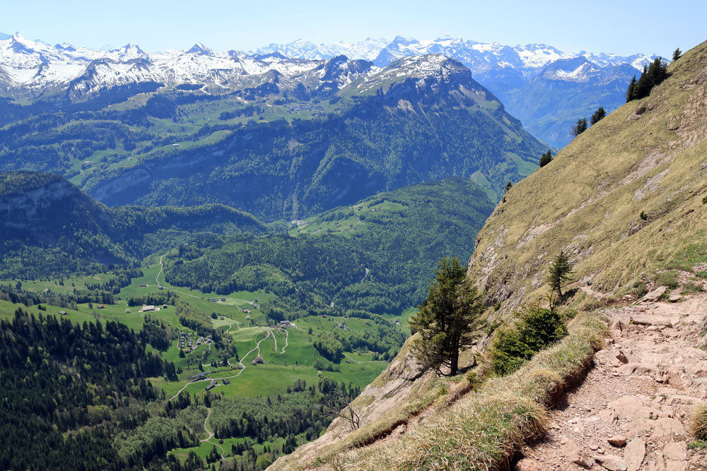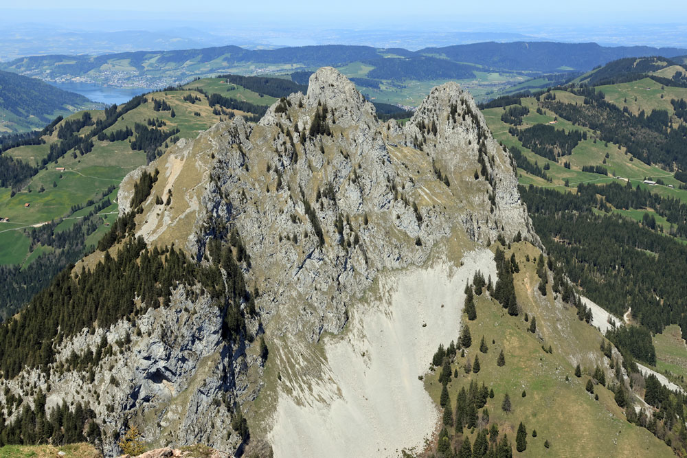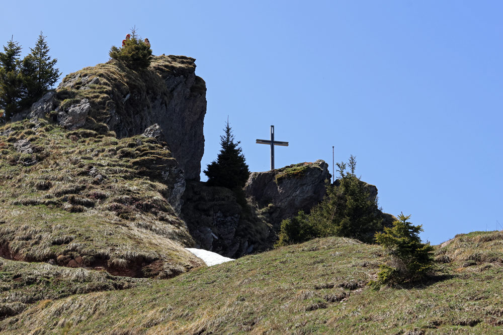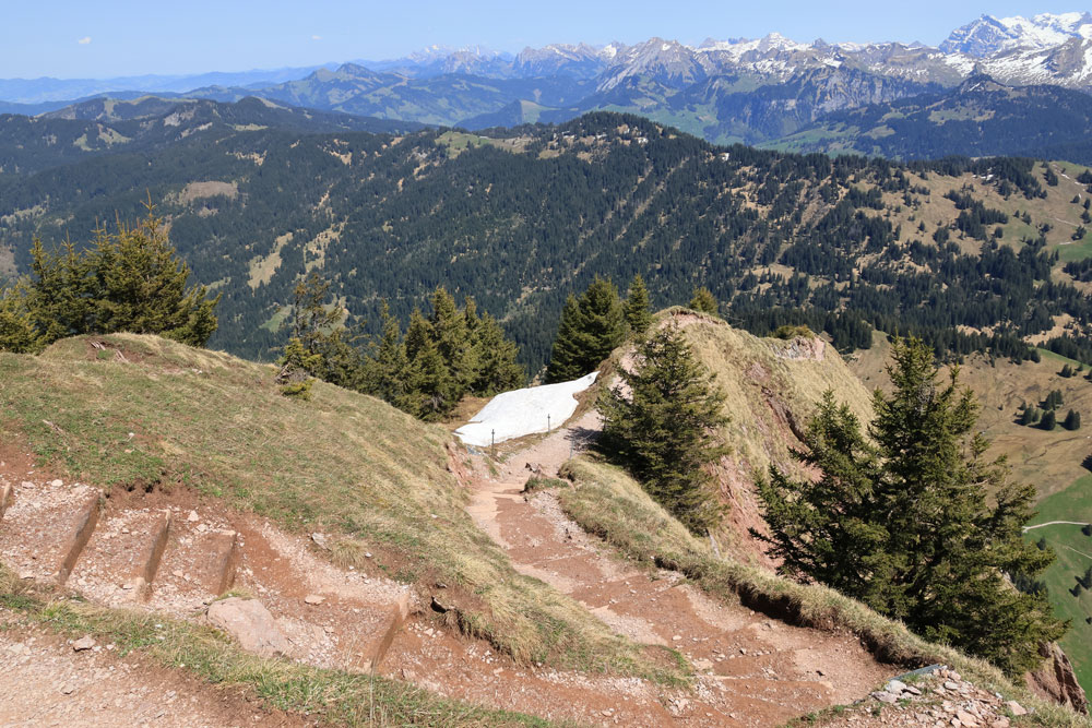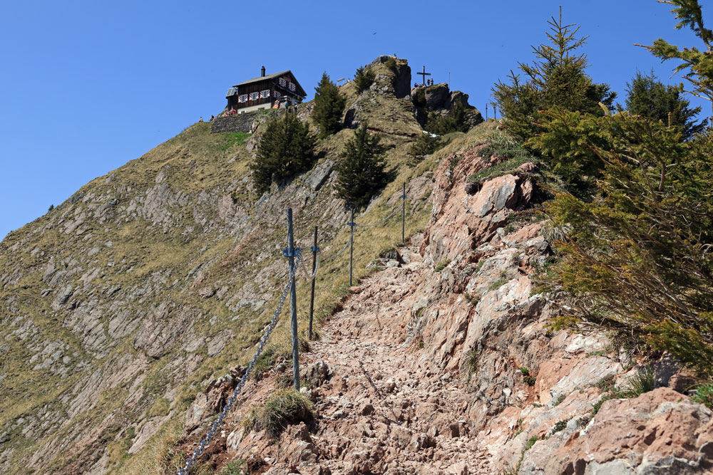 Omdat de top van de berg nog onder de 2000 meter is, is de route al best vroeg in het jaar (voor bergbegrippen dan) begaanbaar en sneeuwvrij. Pas vlak voor de top, wanneer de route om de berg heen draait komen we wat sneeuw tegen. Op het moment dat de route naar de noordkant van de berg draait hebben we ook een mooi uitzicht op de Kleiner Mythen, de naastgelegen bergformatie. Ook het dal waarin Brunni ligt is prachtig te zien nu; wat is het daar groen! In de winter is de Mythenregio een geliefd skigebied, maar in de zomer en het voorjaar is het evengoed een heel mooi gebied. Het is een flinke klim geweest de berg op, maar we zijn er nu echt bijna. Het bergrestaurant en het topkruis zijn nu zichtbaar, hoera!