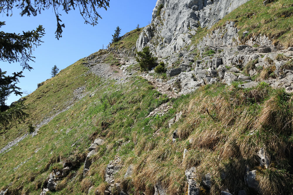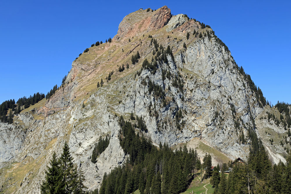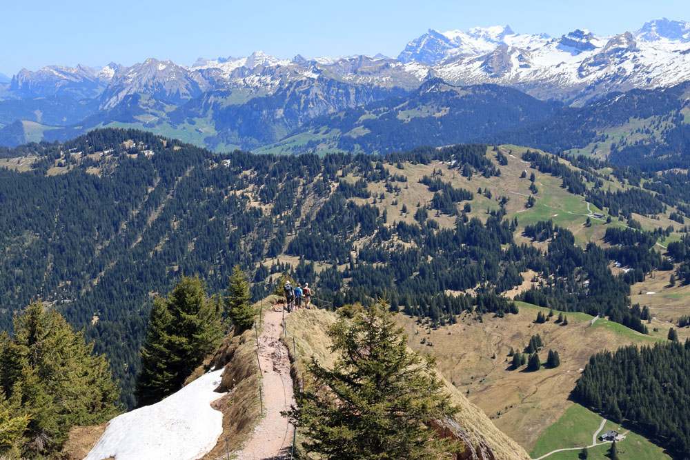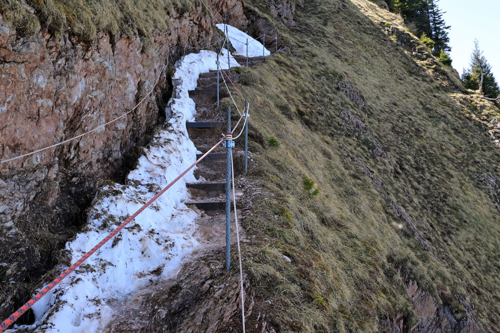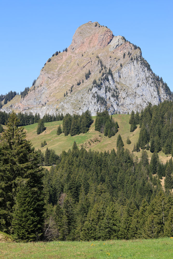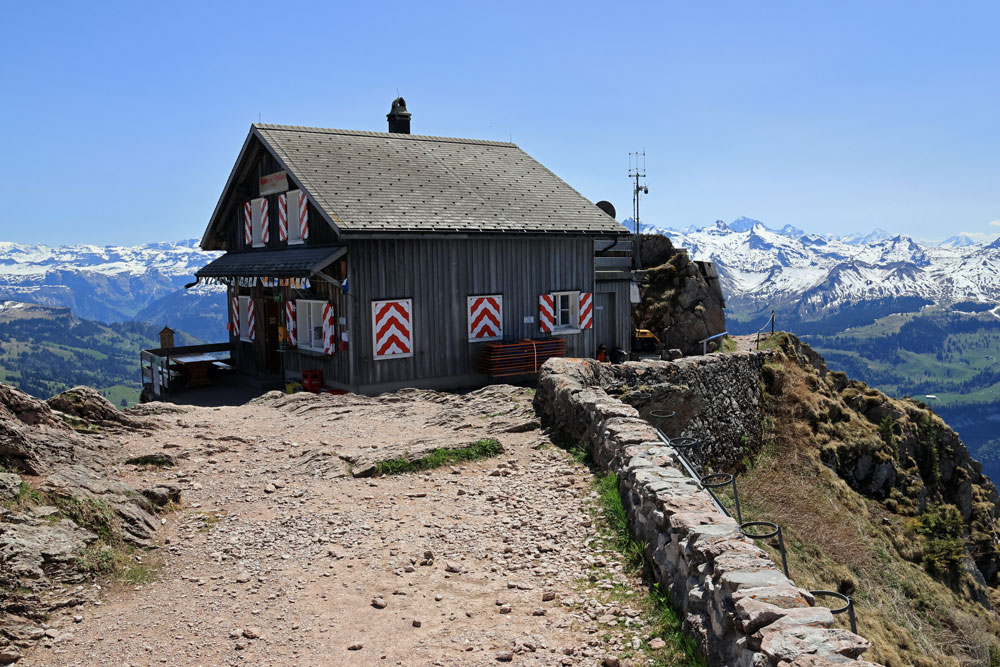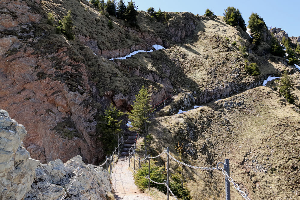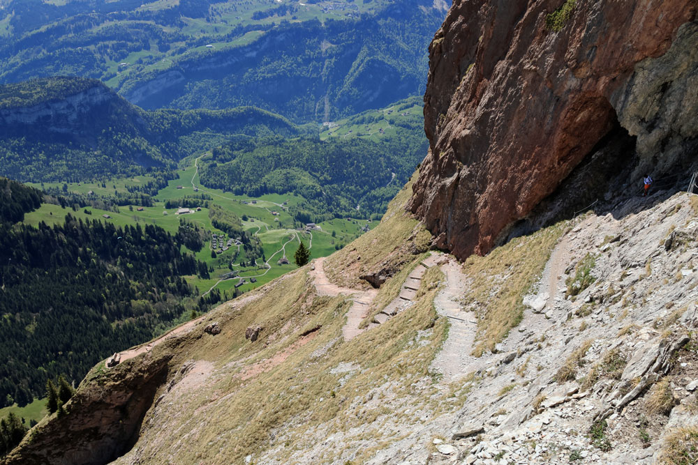 Omdat de top van de berg nog onder de 2000 meter is, is de route al best vroeg in het jaar (voor bergbegrippen dan) begaanbaar en sneeuwvrij. Pas vlak voor de top, wanneer de route om de berg heen draait komen we wat sneeuw tegen. Op het moment dat de route naar de noordkant van de berg draait hebben we ook een mooi uitzicht op de Kleiner Mythen, de naastgelegen bergformatie. Ook het dal waarin Brunni ligt is prachtig te zien nu; wat is het daar groen! In de winter is de Mythenregio een geliefd skigebied, maar in de zomer en het voorjaar is het evengoed een heel mooi gebied. Het is een flinke klim geweest de berg op, maar we zijn er nu echt bijna. Het bergrestaurant en het topkruis zijn nu zichtbaar, hoera!
