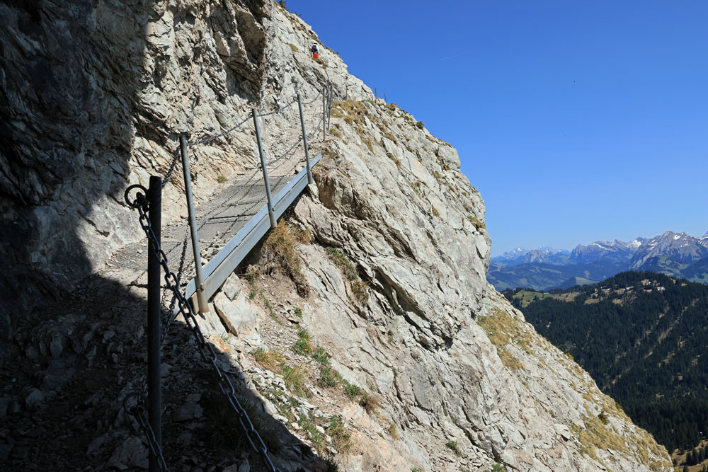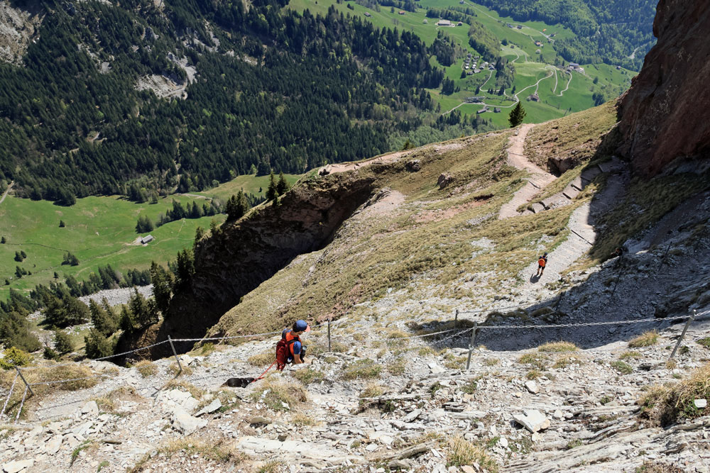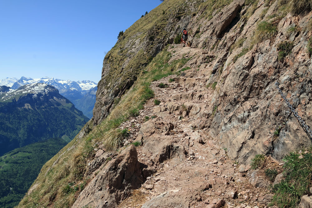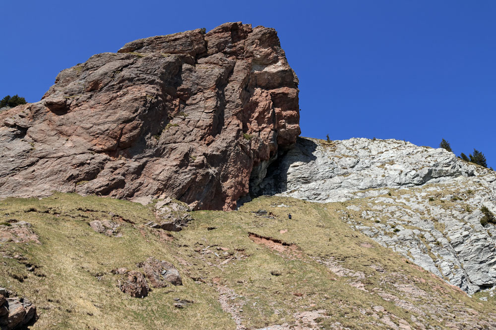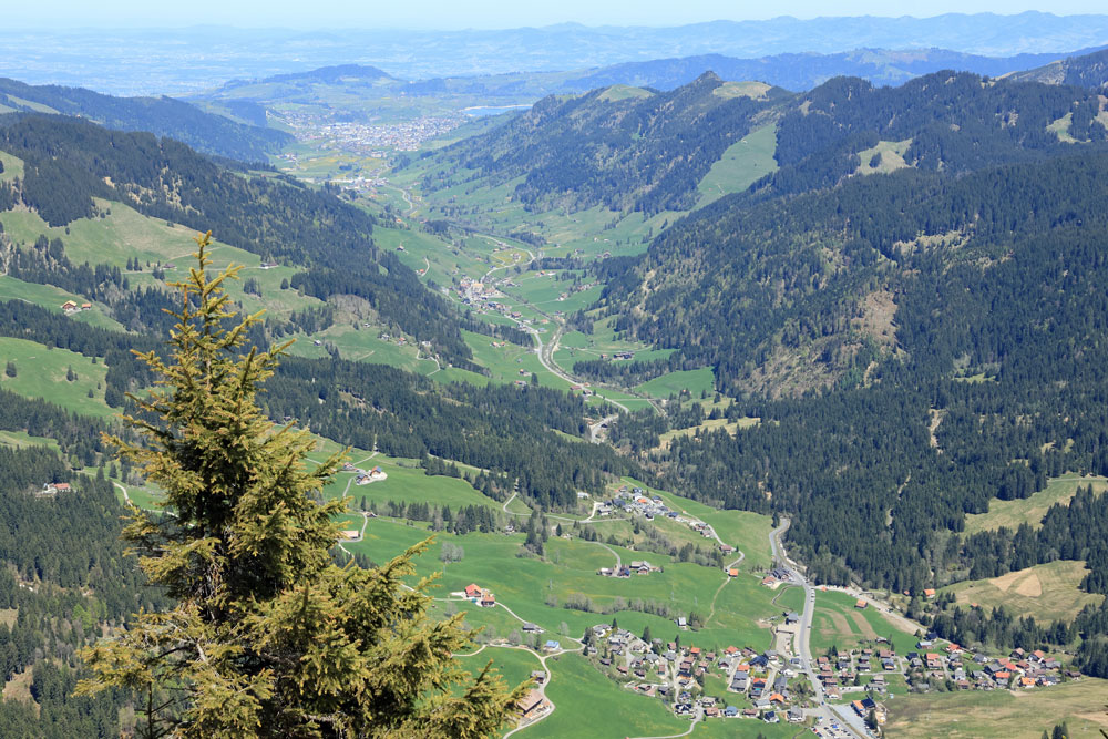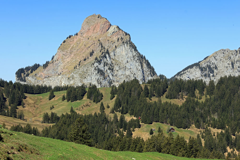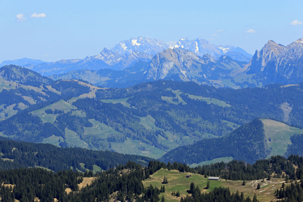 Omdat de top van de berg nog onder de 2000 meter is, is de route al best vroeg in het jaar (voor bergbegrippen dan) begaanbaar en sneeuwvrij. Pas vlak voor de top, wanneer de route om de berg heen draait komen we wat sneeuw tegen. Op het moment dat de route naar de noordkant van de berg draait hebben we ook een mooi uitzicht op de Kleiner Mythen, de naastgelegen bergformatie. Ook het dal waarin Brunni ligt is prachtig te zien nu; wat is het daar groen! In de winter is de Mythenregio een geliefd skigebied, maar in de zomer en het voorjaar is het evengoed een heel mooi gebied. Het is een flinke klim geweest de berg op, maar we zijn er nu echt bijna. Het bergrestaurant en het topkruis zijn nu zichtbaar, hoera!