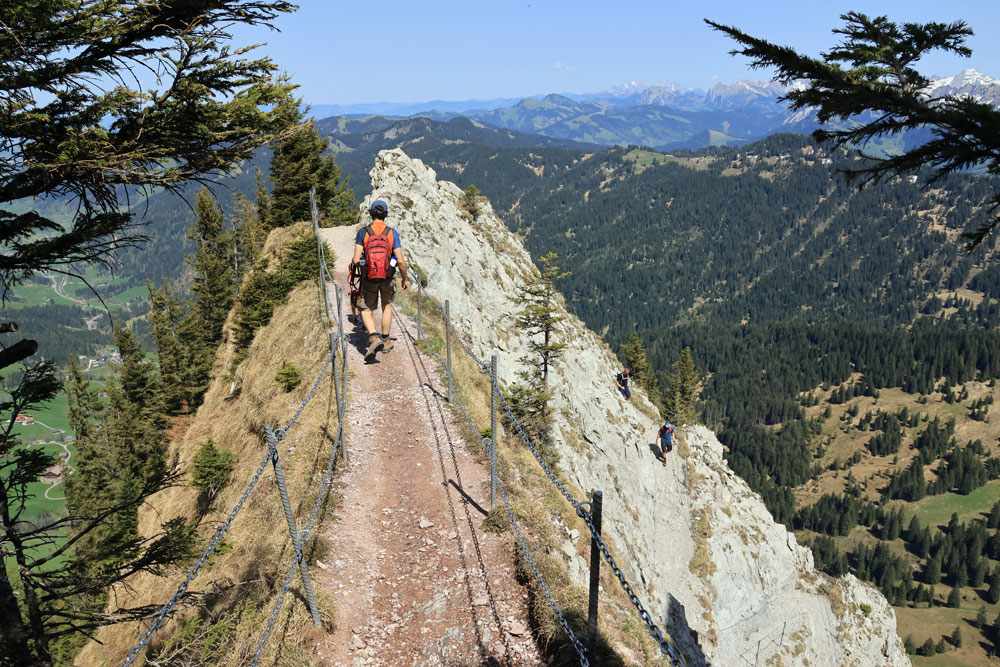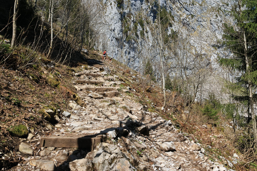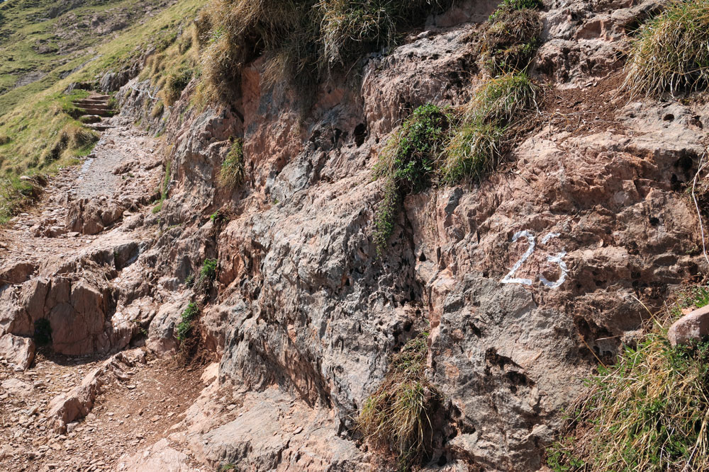 Na een korte aanloop beginnen de vele haarspeldbochten de berg op. Het zijn er maar liefst 47 tot de top en in veel bochten staat ook het nummer erbij, zodat we een beetje een idee hoe ver we al zijn. Het wandelpad is hier een echt wandelpad geworden in plaats van de brede gravelwegen die we net hadden. Soms is het pad beveiligd met een hekje, maar vaak ook niet. Het is dan ook een T2- en T3-wandelpad, zoals we op deze kaart kunnen zien. Wij vinden het niet eng, maar we hebben ook gelezen dat hier enkele jaren geleden meerdere mensen dodelijk zijn gevallen, dus het is zeker belangrijk om goed op te passen. Al snel hebben we van bovenaf mooi uitzicht op Berggasthaus Holzegg.