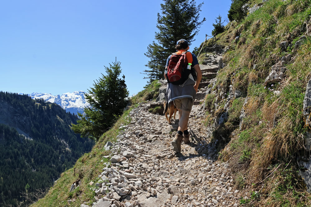 Na een lange pauze op de top is het dan toch echt tijd om weer aan de afdaling te beginnen. We zijn heel blij dat we zo’n mooi uitzicht hadden vanaf de top en dat het zo’n heldere dag is! Daardoor is het helemaal niet zo erg meer dat we precies dezelfde route terug moeten lopen. Normaal gesproken lopen we graag een rondwandeling, maar omdat we in Ibergeregg geparkeerd staan, moeten we wat verder lopen dan als we met de Rotenfluebahn gekomen waren. Anders is het wel een leuke tip om vanaf Bergstation Brunni of Bergstation Rotenfluebahn de Mythen Rundwanderweg te doen. Wij wandelen dus dezelfde weg terug en genieten nogmaals van de vele mooie uitzichten. Wat is het voorjaar toch mooi in de bergen! Na een lange wandeldag komen we voldaan weer terug bij de auto. De hike naar de bergtop Grosser Mythen was echt enorm de moeite waard!