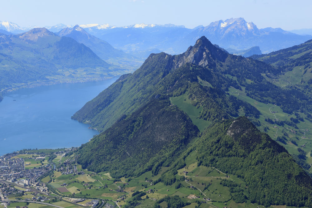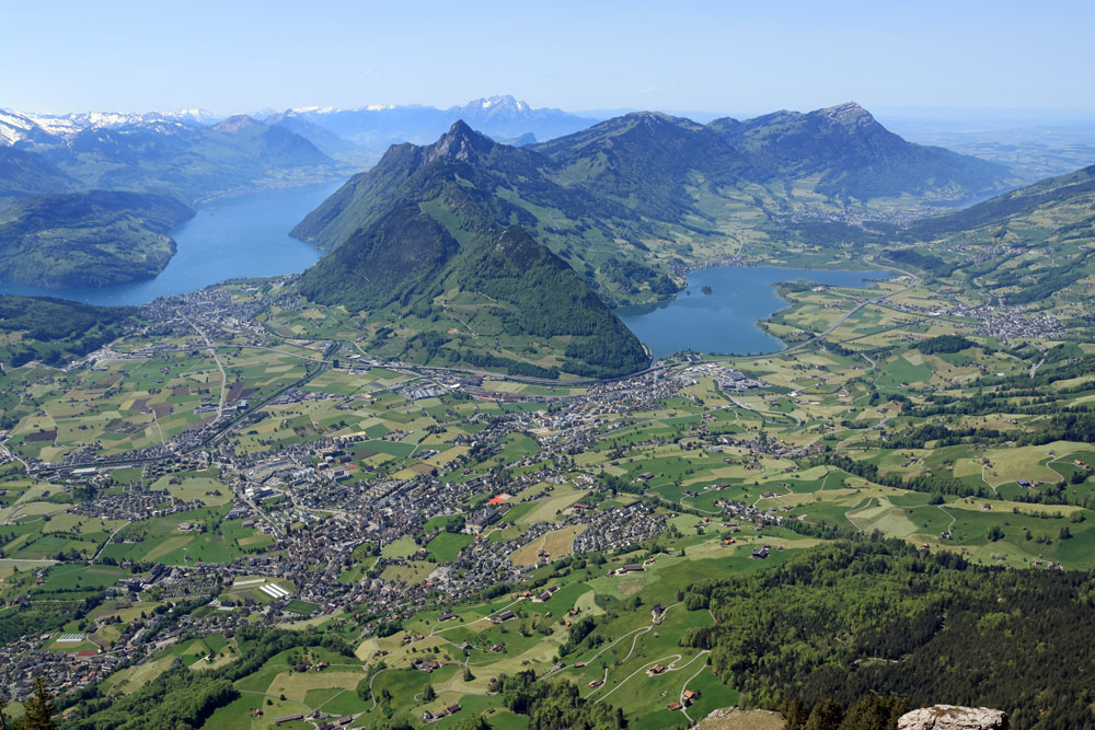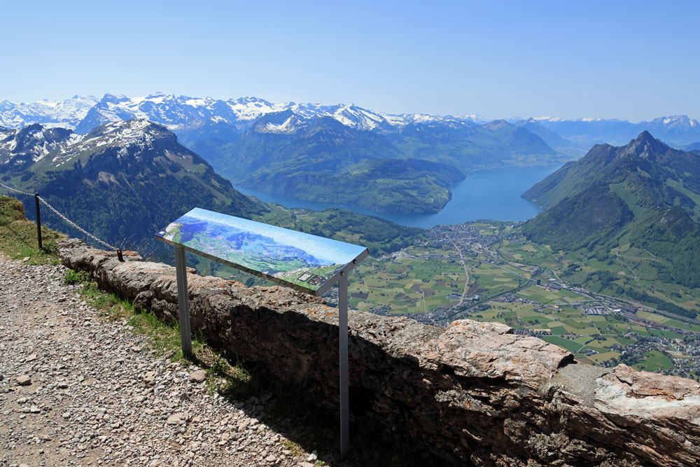 Oh, wat is het ongelofelijk mooi op de top van de Grosser Mythen! Het uitzicht in de richting van het Vierwoudstrekenmeer vinden we het mooist. De lager gelegen weides en bergen zijn al helemaal groen en steken prachtig af tegen de besneeuwde bergtoppen erachter. Het is ook zo leuk dat we allemaal plekken zien waar we al eerder geweest zijn. Tussen het Vierwoudstrekenmeer en de Zugersee ligt het Rigimassief met van links naar rechts Rigi Hochflue, Rigi Scheidegg en Rigi Kulm. Links van Brunnen waar we verblijven zien we Morschach liggen aan de voet van de Fronalpstock waar we ook al gewandeld hebben. En als we ons 180 graden omdraaien zien we helemaal in de verte zelfs de Säntis liggen en de rotsformatie bij Saxer Lücke die zich in het Alpsteingebergte bevinden. Dat is het leuke aan zo’n vrijstaande bergformatie; je hebt dan zo’n vrij uitzicht!