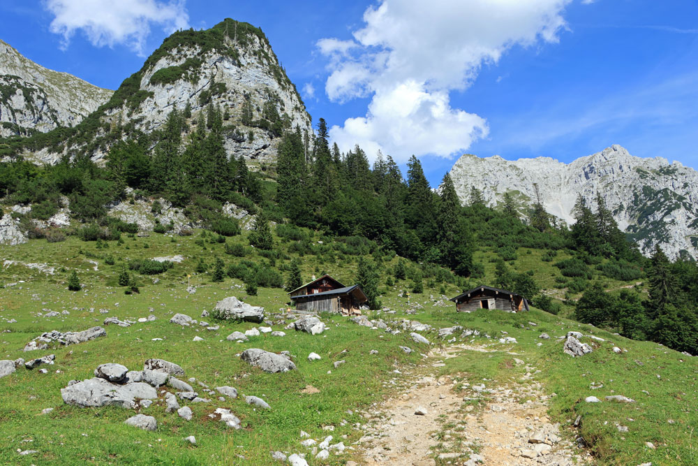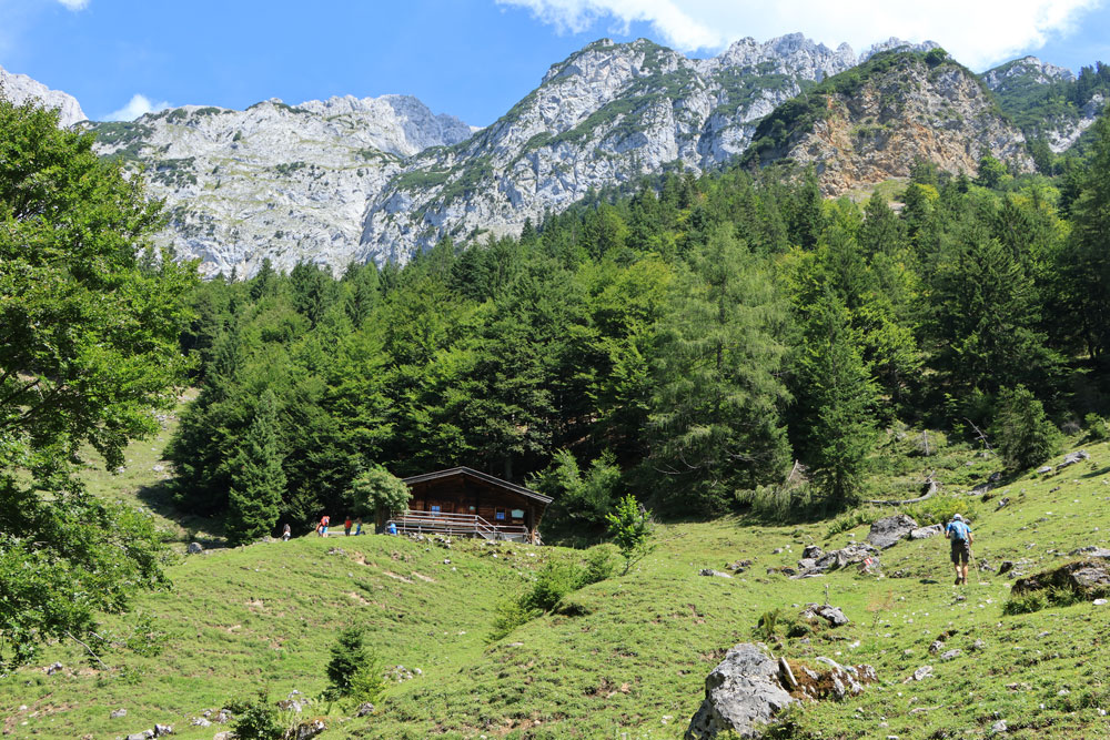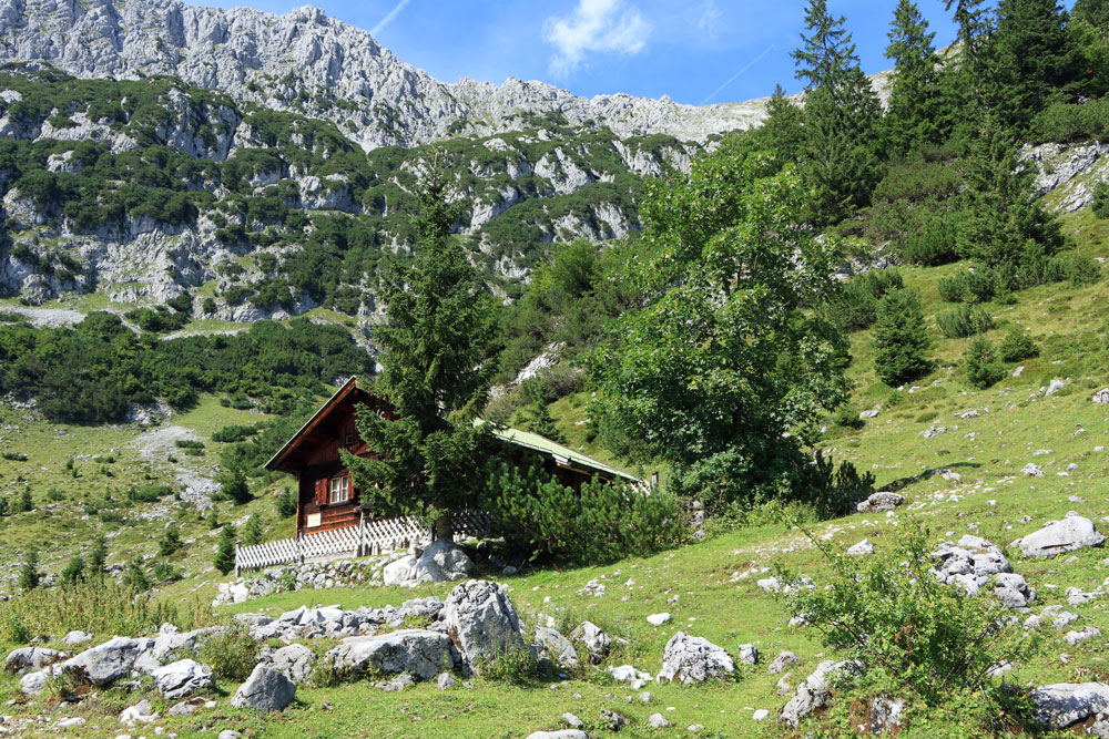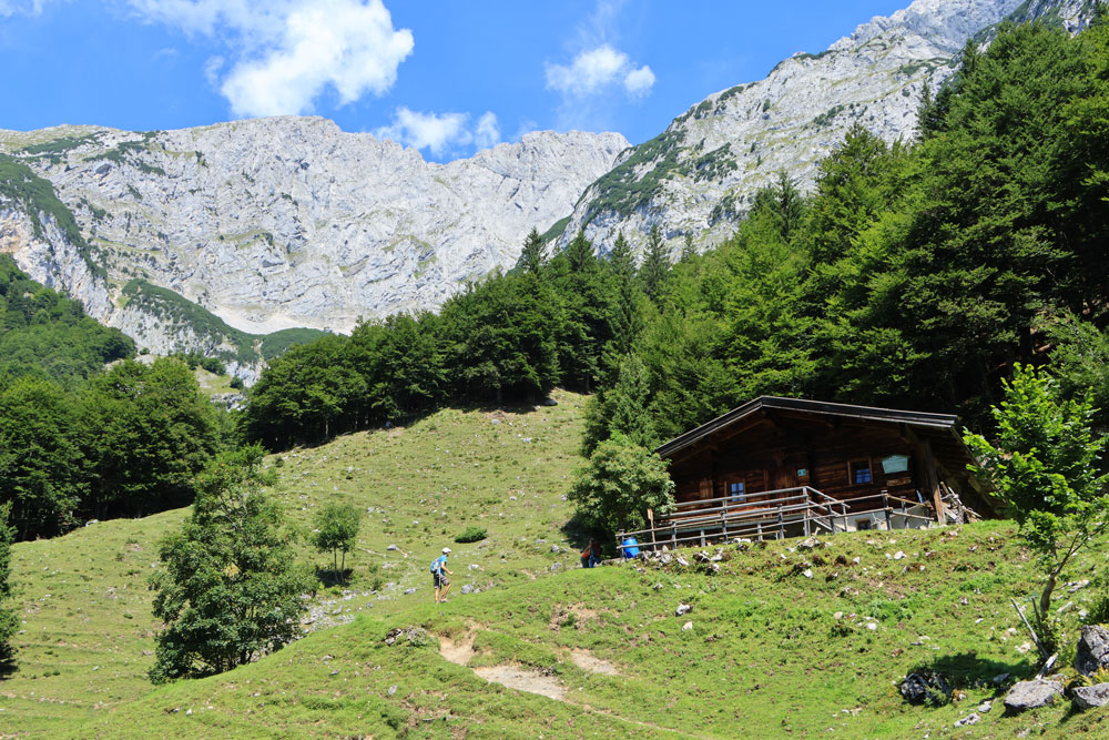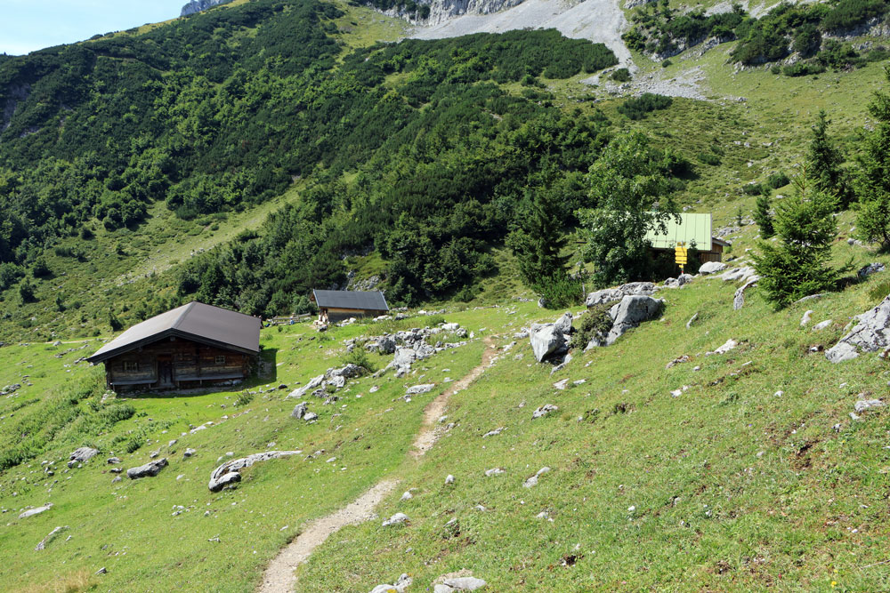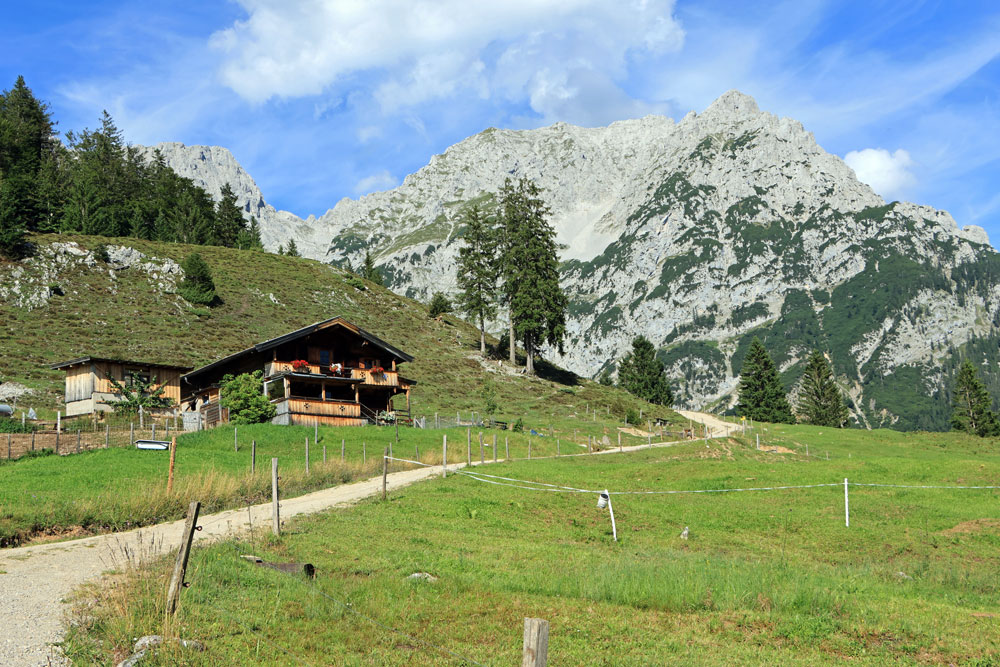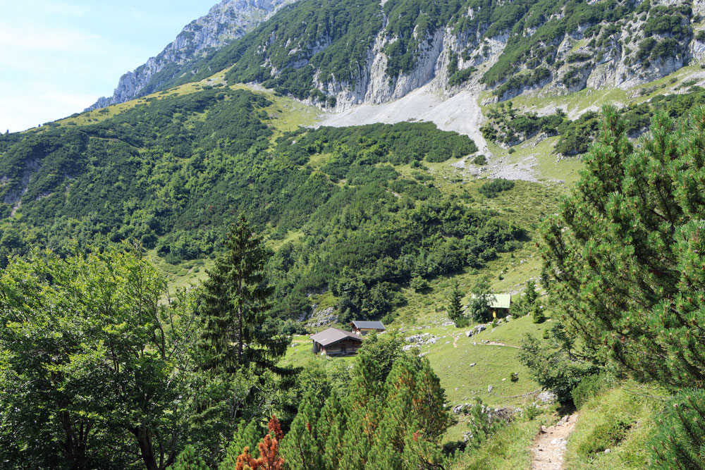 De Wilder-Kaiser-Steig (WKS) is een van de oudste en mooiste hoogtepaden in het Tiroler Unterland en doorkruist het gehele Wilder Kaiser-gebergte. De hele WKS is 33 kilometer lang, dus het stukje waar we nu overheen lopen is maar een kort gedeelte van de Steig. Dit gedeelte loopt hier praktisch over de hoogtelijn, dus dat betekent dat we niet noemenswaardig hoeven te stijgen en dalen. Heerlijk! Ongeveer 1,5 kilometer later zien we de hutten op de Kaiser Hochalm in beeld verschijnen.