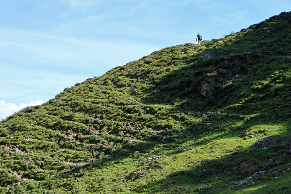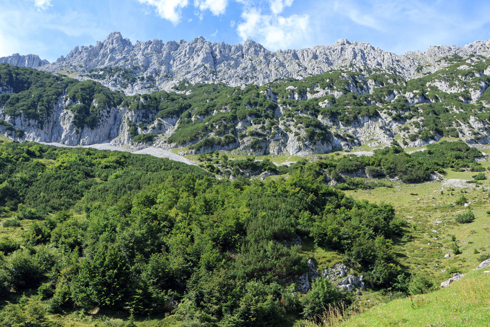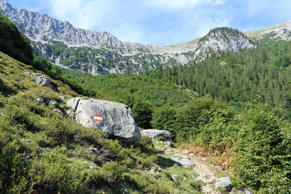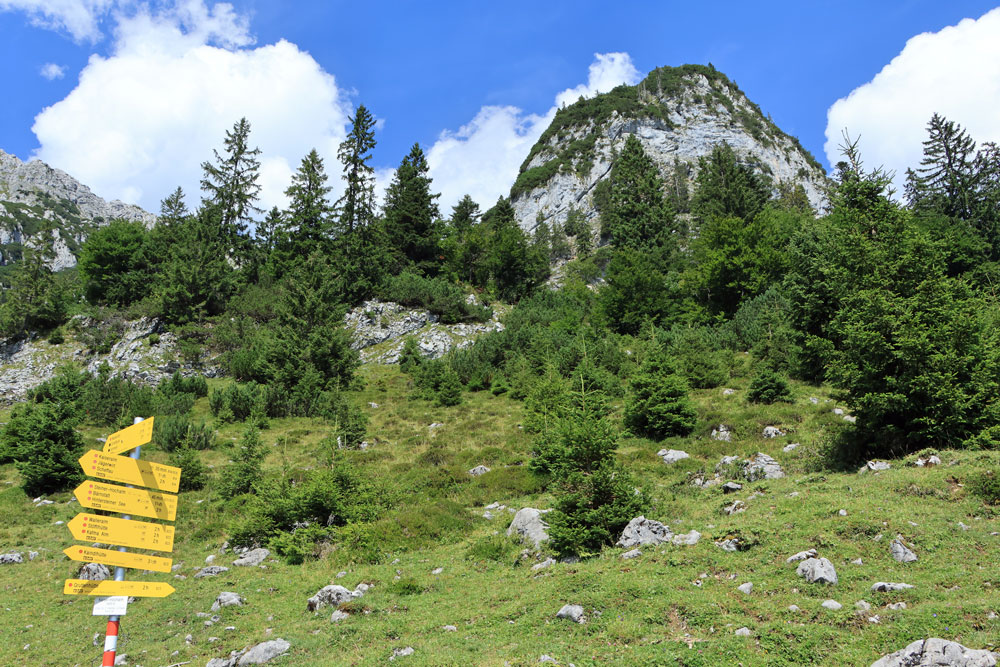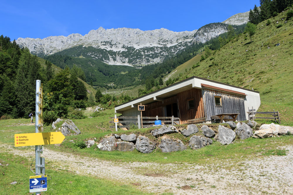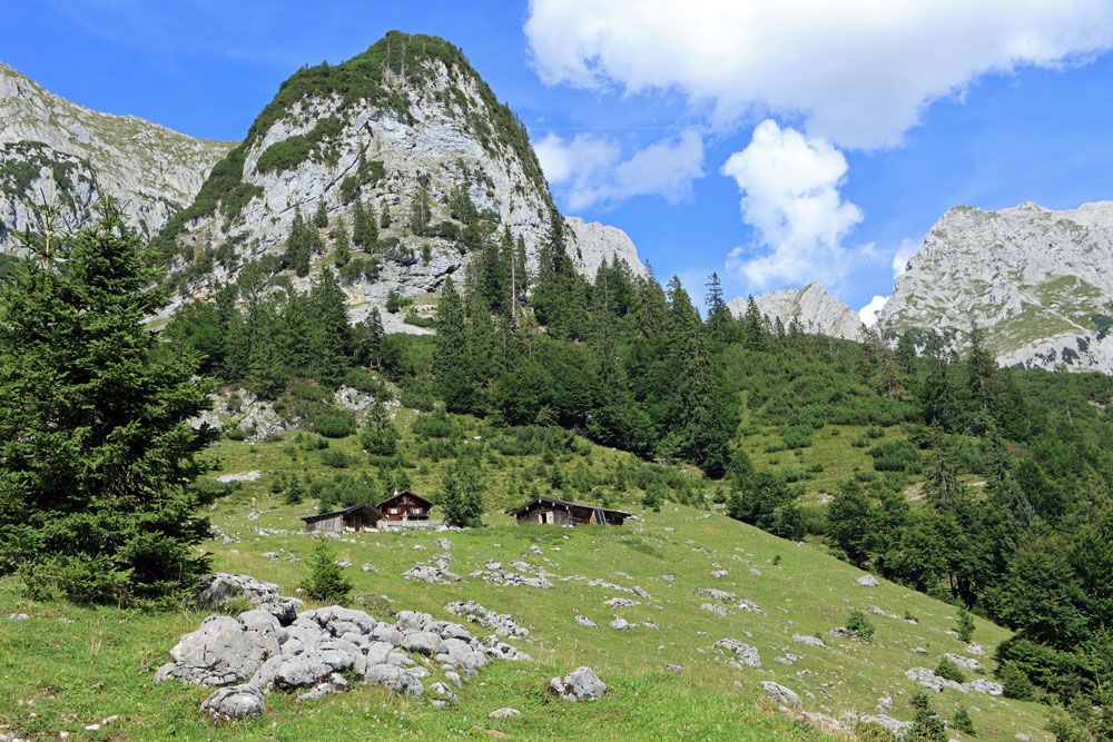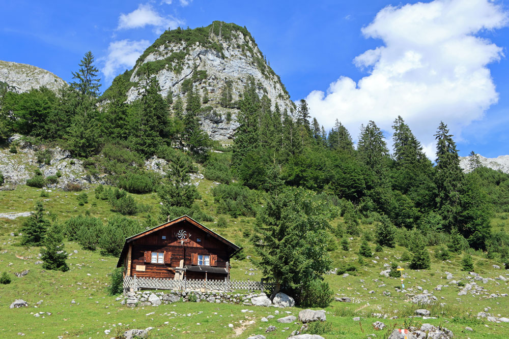 De Wilder-Kaiser-Steig (WKS) is een van de oudste en mooiste hoogtepaden in het Tiroler Unterland en doorkruist het gehele Wilder Kaiser-gebergte. De hele WKS is 33 kilometer lang, dus het stukje waar we nu overheen lopen is maar een kort gedeelte van de Steig. Dit gedeelte loopt hier praktisch over de hoogtelijn, dus dat betekent dat we niet noemenswaardig hoeven te stijgen en dalen. Heerlijk! Ongeveer 1,5 kilometer later zien we de hutten op de Kaiser Hochalm in beeld verschijnen.