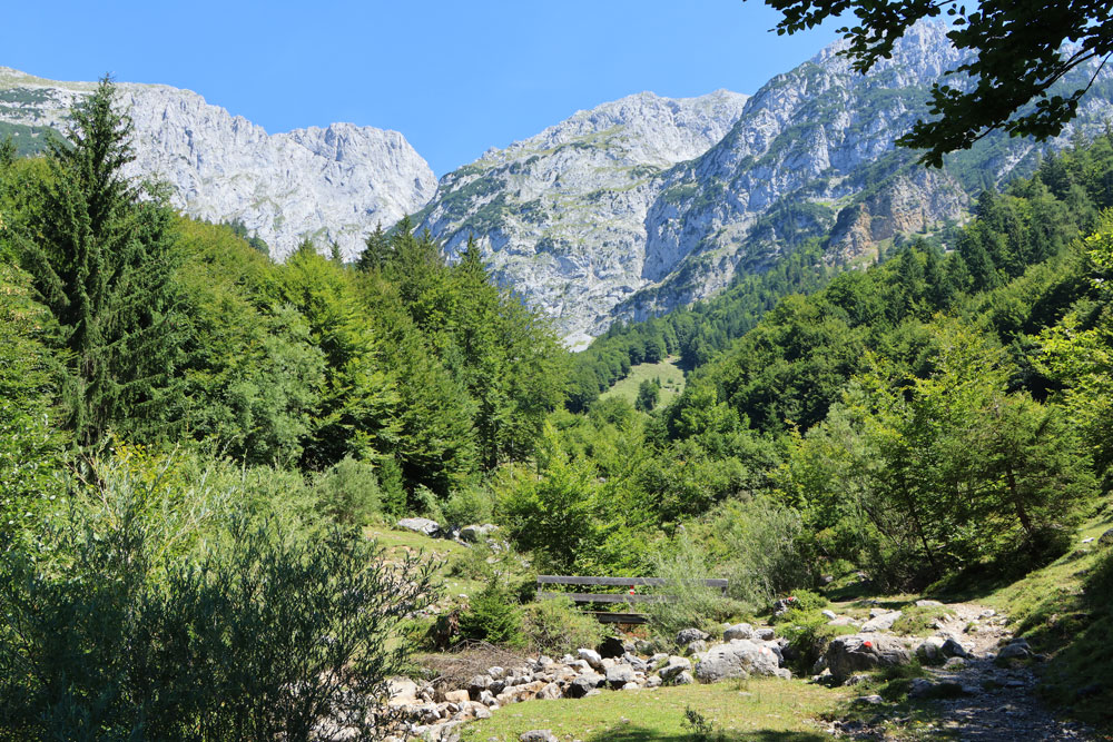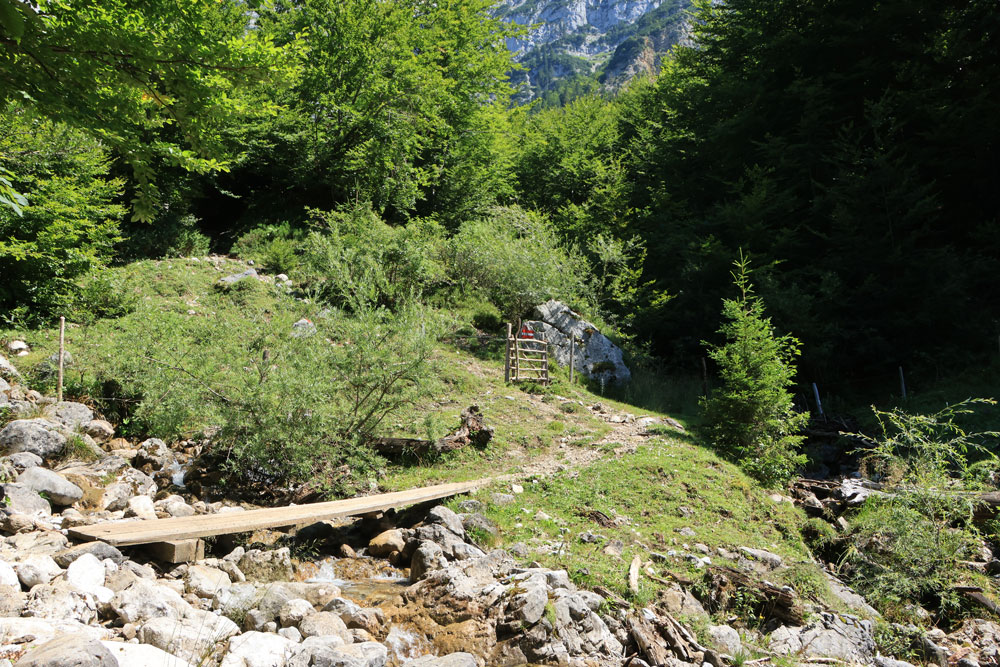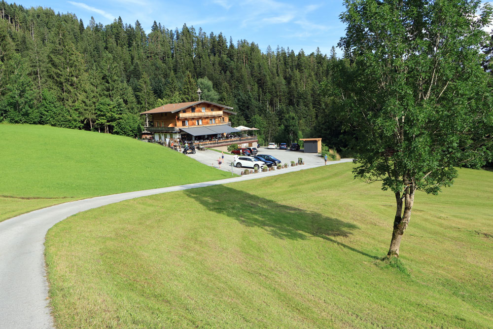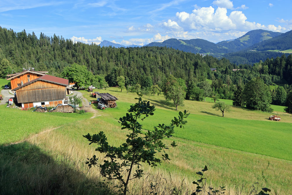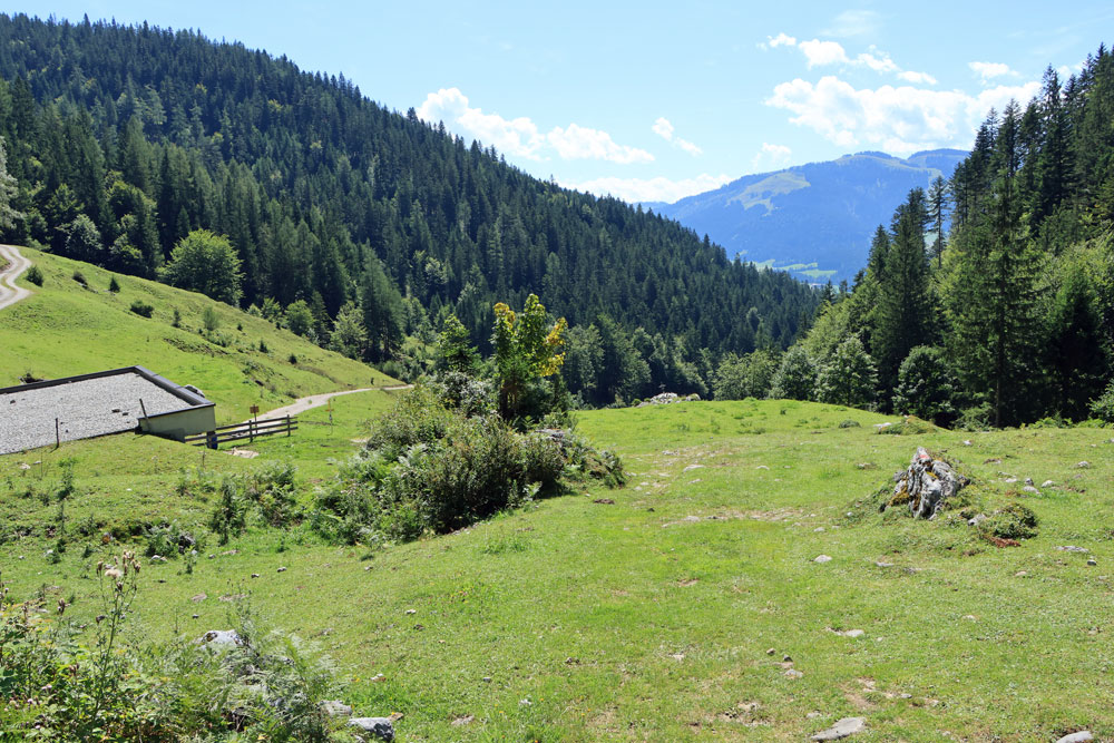 Na een tijdje moeten we even voor een kruising over een prachtig gelegen bruggetje heen. De omlijsting van de omgeving met de bergen van de Wilder Kaiser is erg mooi om te zien. Na het bruggetje over de Wegscheidbach komt dan het kruispunt Kaiseregg waar we rechtsaf slaan op pad 826. Het is nu flink stijgen naar de Wegscheid Hochalm. Jammer genoeg hebben we geen contant geld bij ons, want bij de alm kun je een blikje ijskoud drinken kopen (self-service). We lopen daarom na de alm maar gelijk door in de richting van het bos.