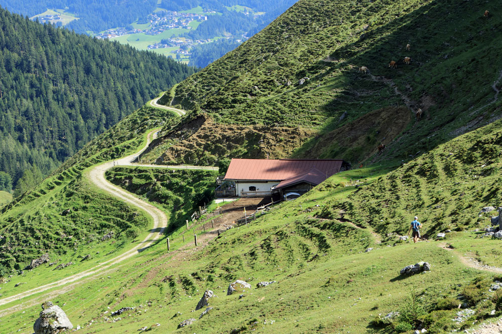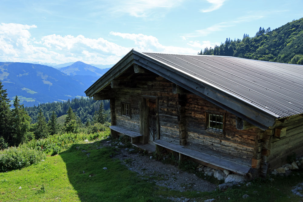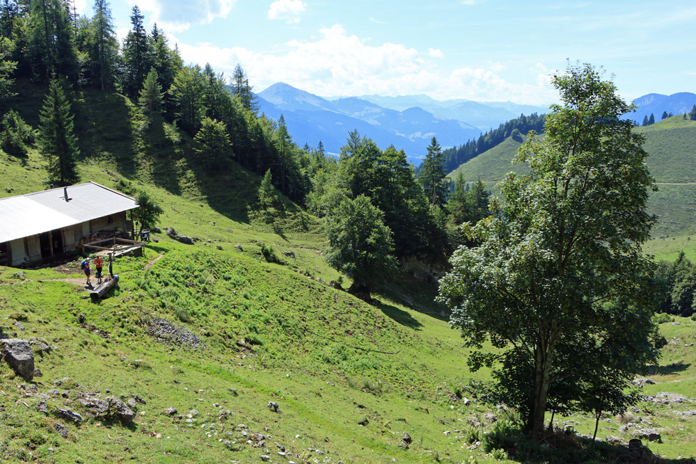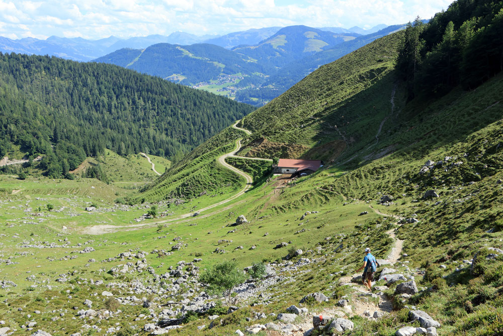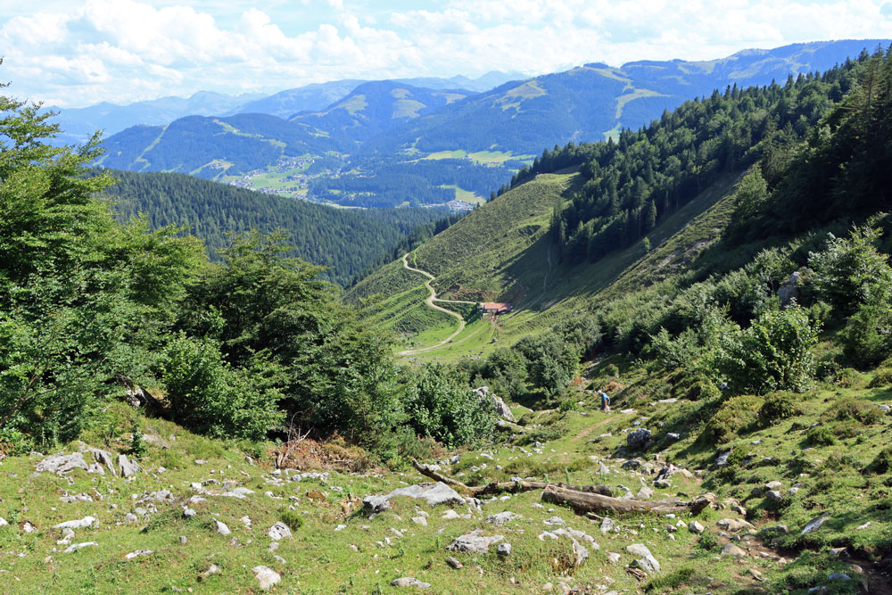 Na een heerlijke pauze begint de steile afdaling naar de Kaiseralm. We dalen hierbij bijna 300 meter in een afstand van een kilometer. Terwijl we aan de afdaling beginnen hebben we achter ons een schitterend uitzicht op de Wilder Kaiser en de almhutten op de Kaiser Hochalm. Onder ons komt de Kaiseralm steeds dichterbij. We moeten onze aandacht goed bij de afdaling houden, maar voor we het weten lopen we de Kaiseralm op. De alpenhut op de Kaiseralm is wél geopend, maar omdat we net geluncht hebben slaan we een terrasje hier over. Je schijnt er wel heel goed te kunnen eten!