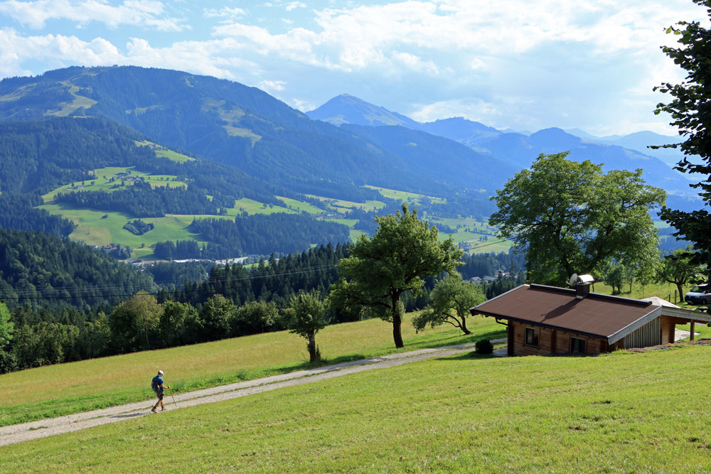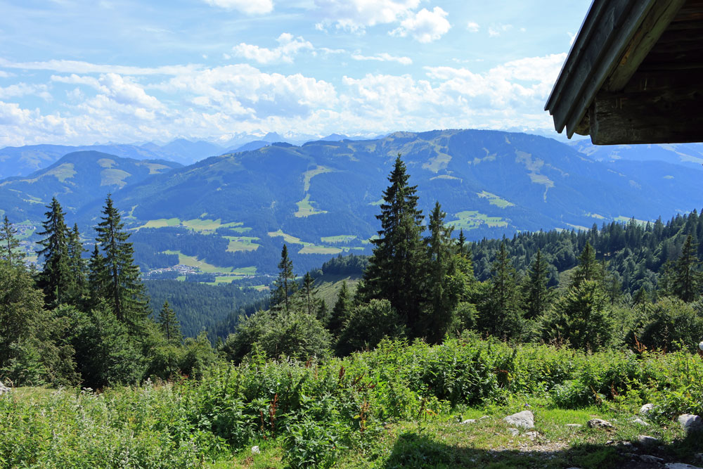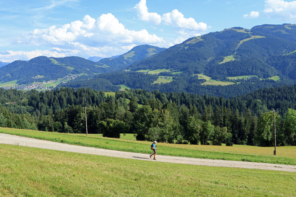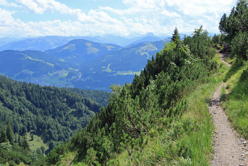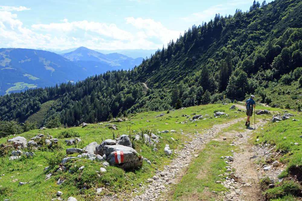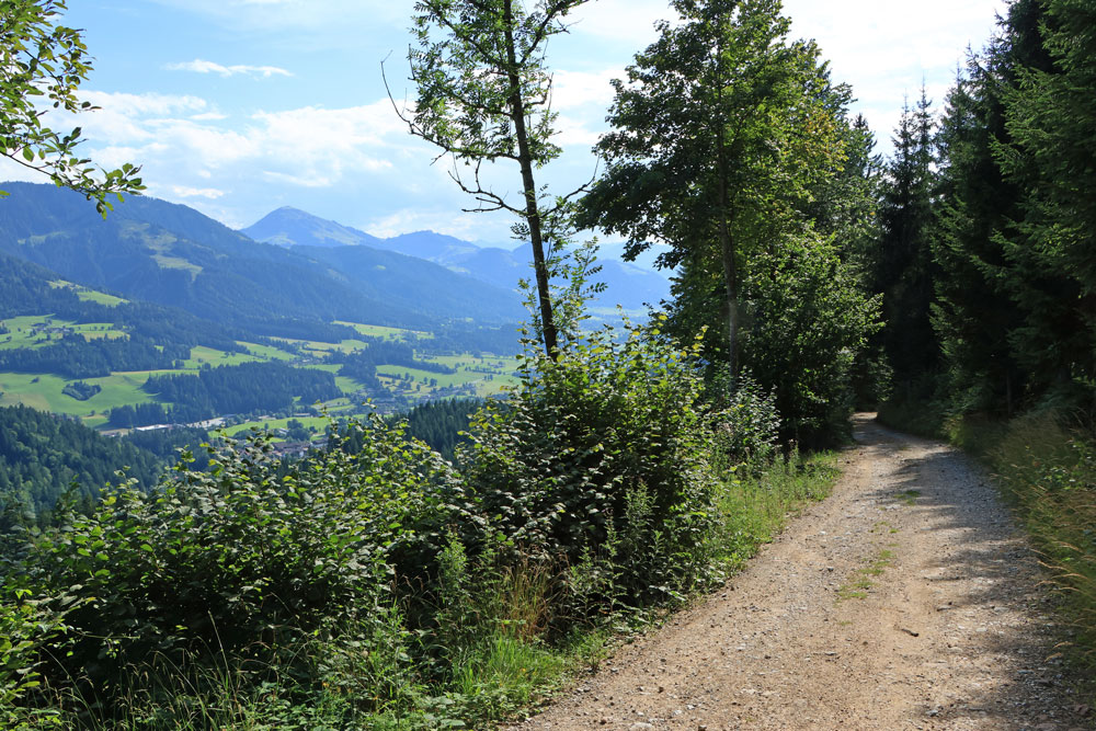 Na de Wegscheid Hochalm gaat het wandelpad verder omhoog richting de bergen van de Wilder Kaiser. We hebben nu ongeveer de helft van de hoogtemeters gehad. Het is nog zo’n 250 meter klimmen tot we op de Wilder-Kaiser-Steig zullen komen. Gelukkig gaat een stukje van dit gedeelte door het bos, want het is toch wel erg warm vandaag! Hoe hoger we komen hoe meer de Kitzbüheler Alpen in beeld komen. Eenmaal bij de volgende kruising aangekomen slaan we linksaf. We wandelen nu op de Wilder-Kaiser-Steig.