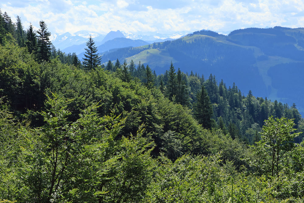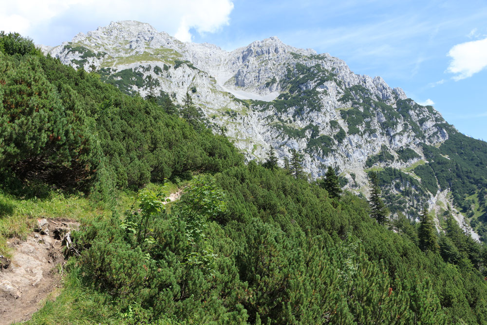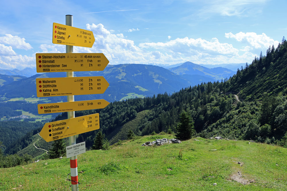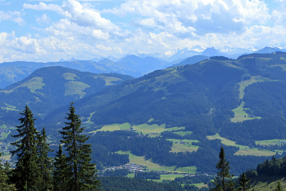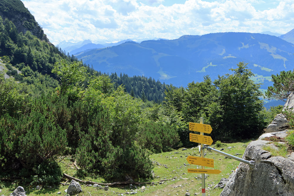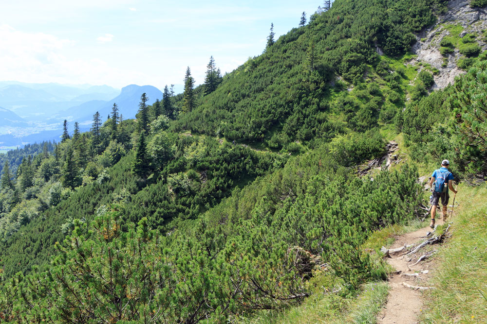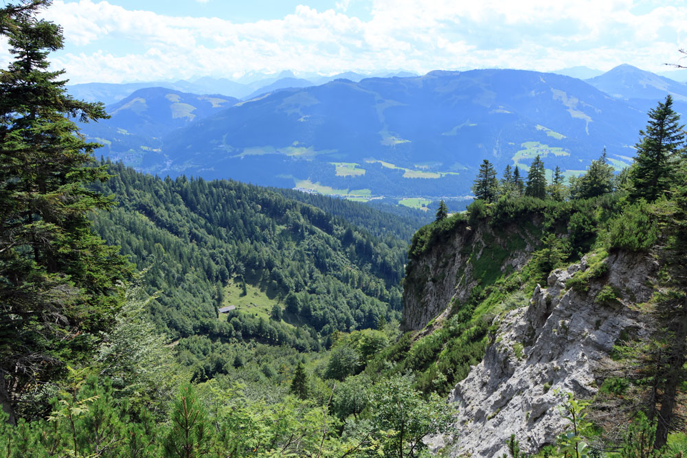 Na de Wegscheid Hochalm gaat het wandelpad verder omhoog richting de bergen van de Wilder Kaiser. We hebben nu ongeveer de helft van de hoogtemeters gehad. Het is nog zo’n 250 meter klimmen tot we op de Wilder-Kaiser-Steig zullen komen. Gelukkig gaat een stukje van dit gedeelte door het bos, want het is toch wel erg warm vandaag! Hoe hoger we komen hoe meer de Kitzbüheler Alpen in beeld komen. Eenmaal bij de volgende kruising aangekomen slaan we linksaf. We wandelen nu op de Wilder-Kaiser-Steig.