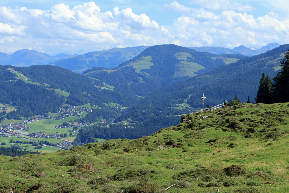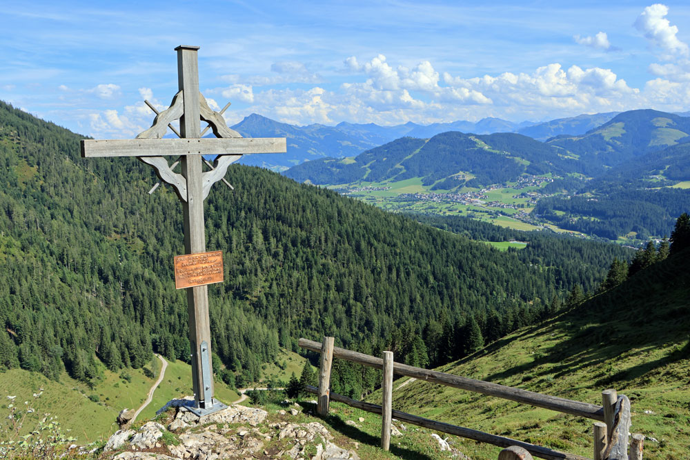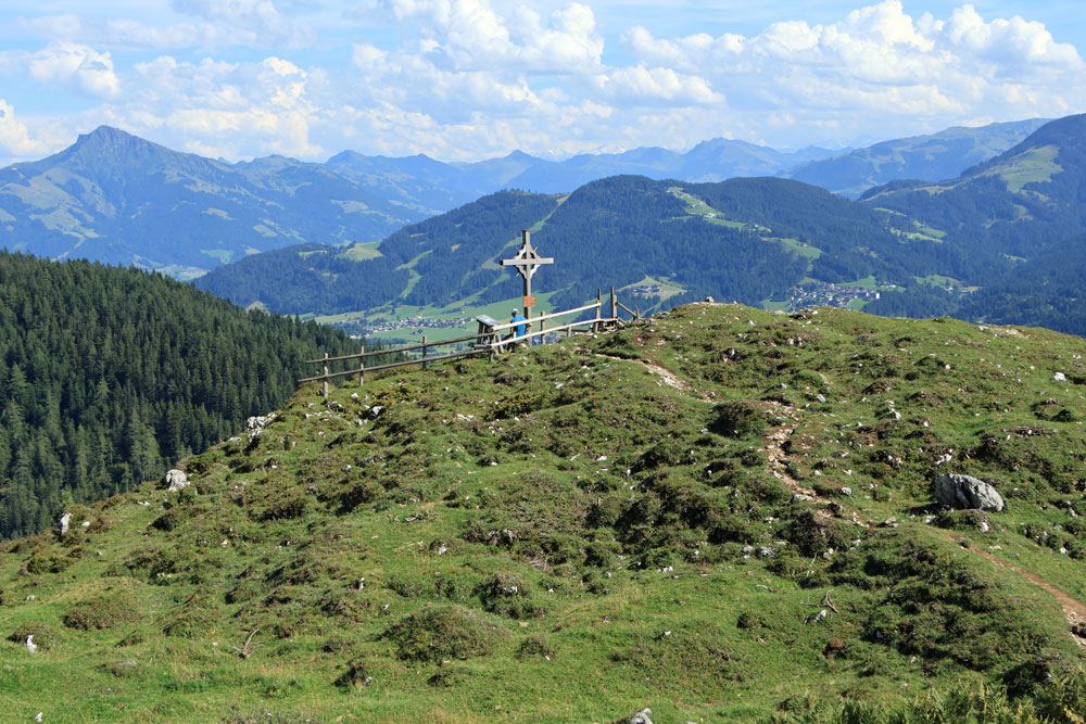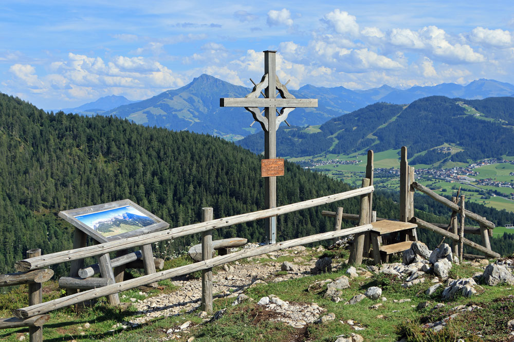 Vanaf de Kaiseralm kun je via wandelpad 814 weer afdalen naar Wegscheid-Niederalm om zo terug te gaan naar Jagerwirt. Dan sla je echter het uitkijkpunt Seilabodenkreuz over en die willen wij graag zien! Wij gaan dus achter de hut van de Kaiseralm verder rechtdoor richting de Kaiser Niederalm. We klimmen enkele tientallen meters en komen dan al snel aan bij het uitkijkpunt. Er is niet veel informatie over dit uitkijkpunt te vinden online, want het is nog vrij onbekend. Daardoor is het er superrustig en kunnen we helemaal alleen van het panoramische uitzicht genieten. Het is erg mooi en we zijn blij dat we het niet overgeslagen hebben. Met aan de ene kant de bergen van de Wilder Kaiser en aan de overkant van het dal de Kitzbüheler Alpen is dit een prachtig plekje.