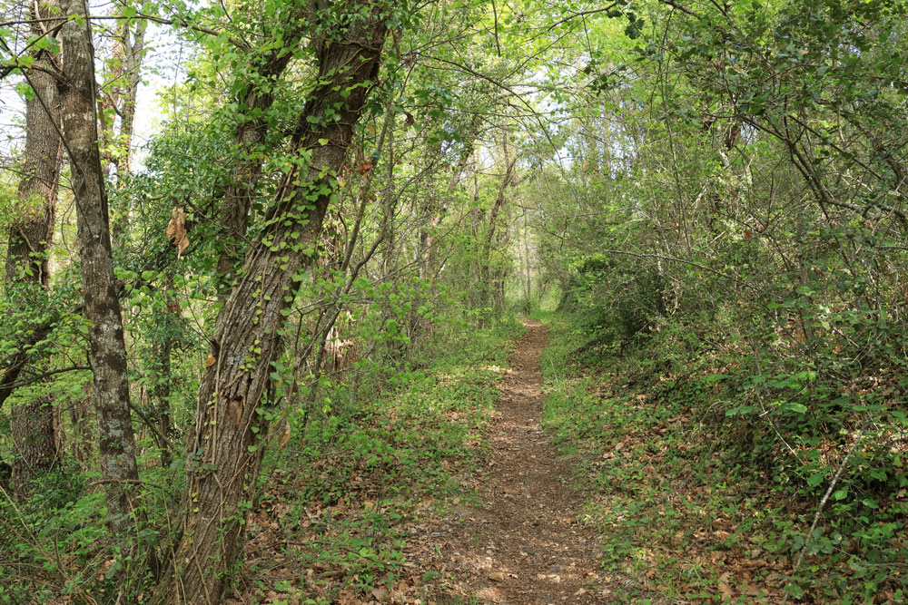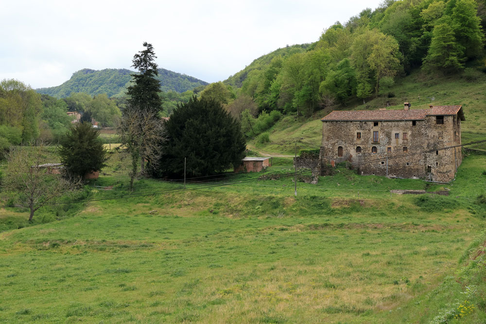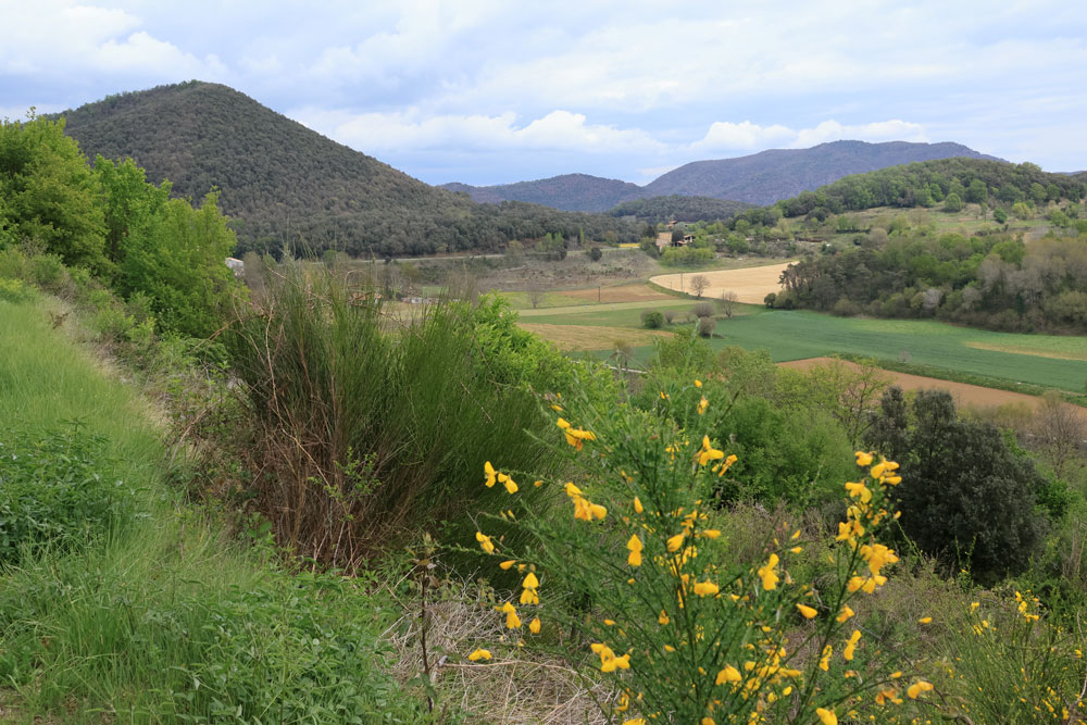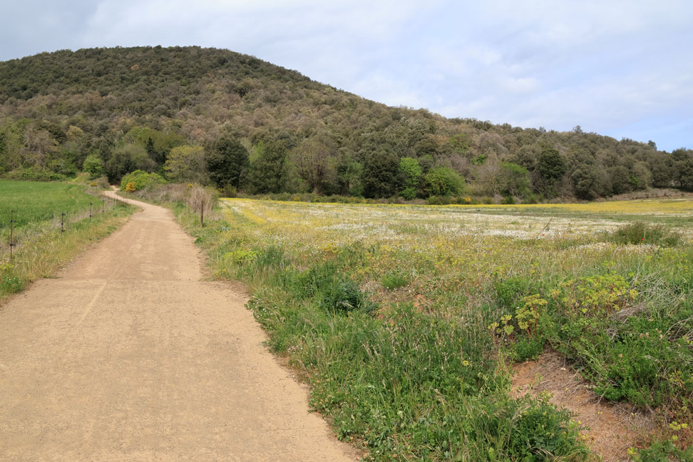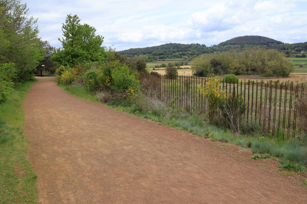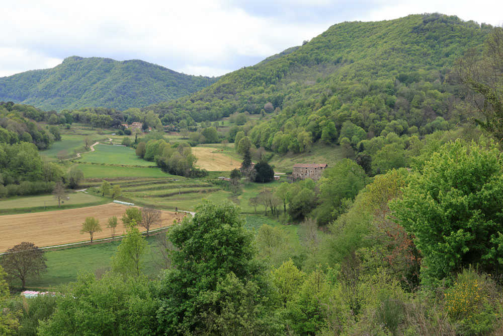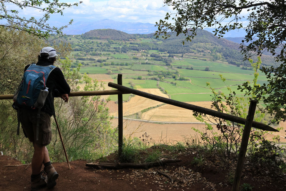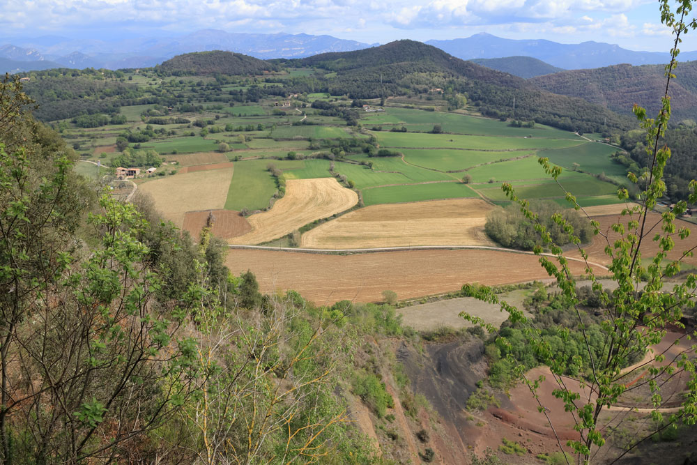 Nadat we van het uitzicht hebben genoten vervolgen we onze weg over het wandelpad dat nu weer steil naar beneden gaat. Het pad brengt ons naar een iets bredere onverharde weg tussen weilanden door. Omdat we de krater van Volcà del Croscat ook van dichtbij willen zien, slaan we op het eerste kruispunt linksaf. We komen nu vanzelf uit bij het wandelpad dat een klein stukje door de krater gaat.