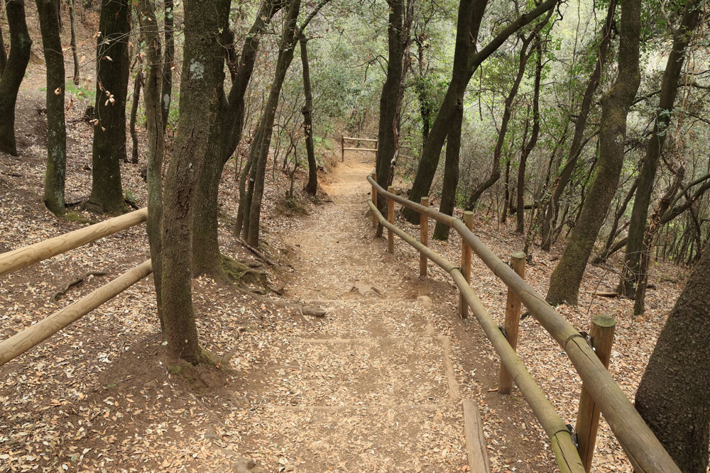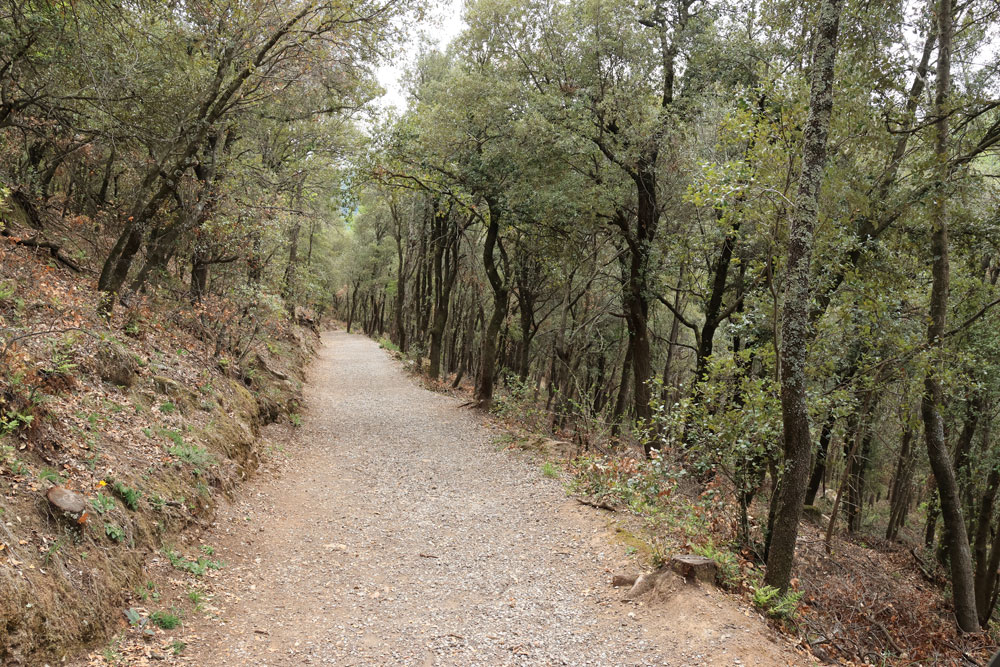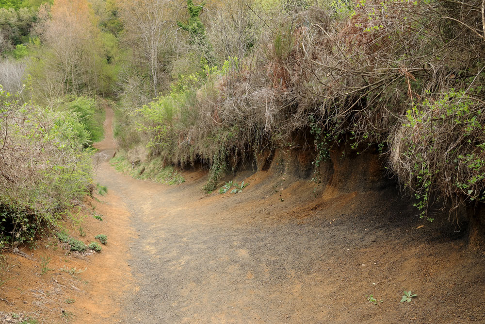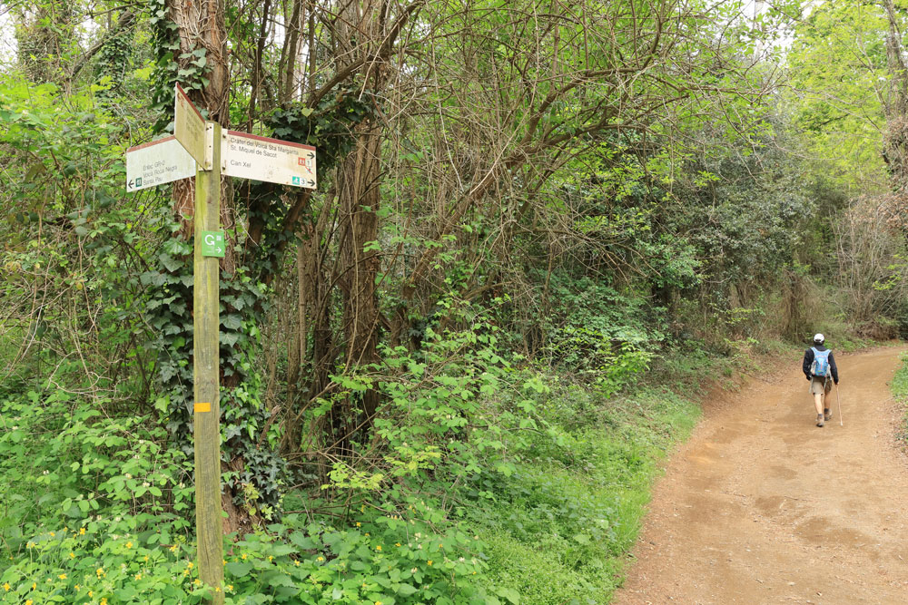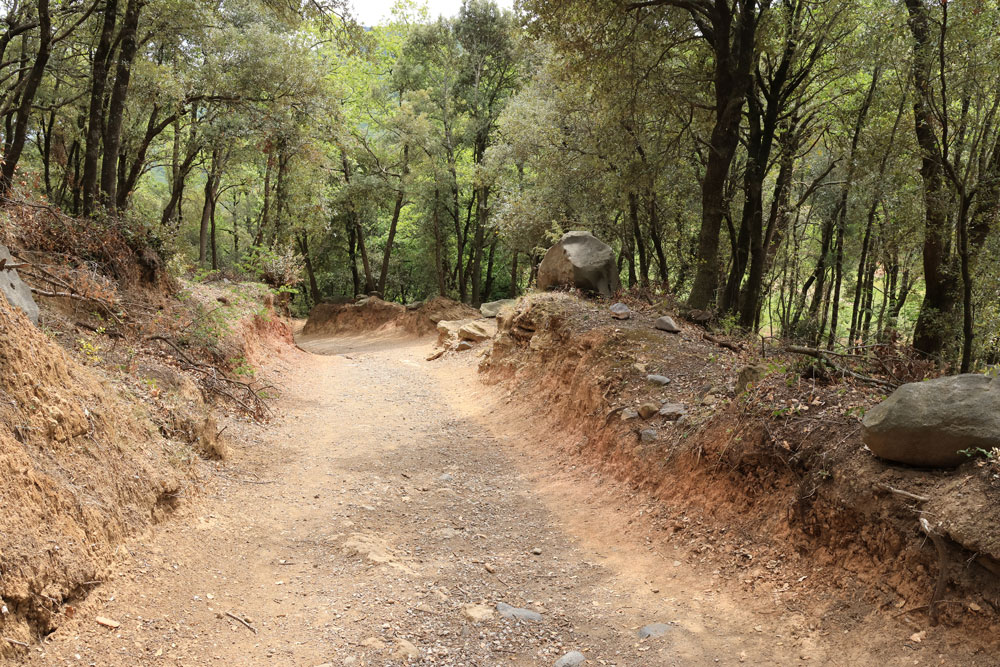 Vanaf Volcà del Croscat volgen we de wandelbordjes naar de volgende vulkaan: Volcà de Santa Margarida. We wandelen eerst weer terug naar het wandelpad waar we net afsloegen en lopen dan een stukje langs de weg, om vervolgens rechtsaf het bos weer in te slaan. Dit staat steeds goed aangegeven op wandelbordjes. Nadat we het bos zijn ingegaan moeten we zo’n 100 meter stijgen tot we weer bij de vulkaanrand aankomen. Hier kunnen we de krater echter nog niet echt zien. We moeten eerst nog een stukje door het bos afdalen.