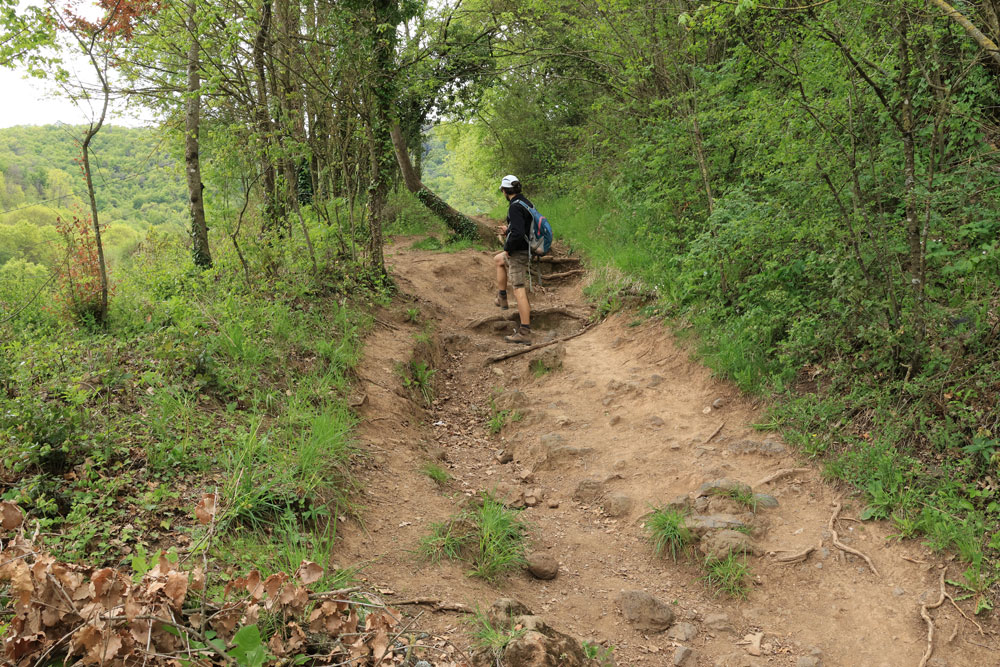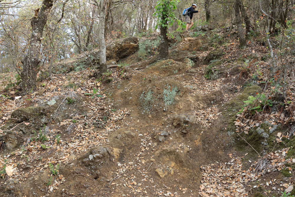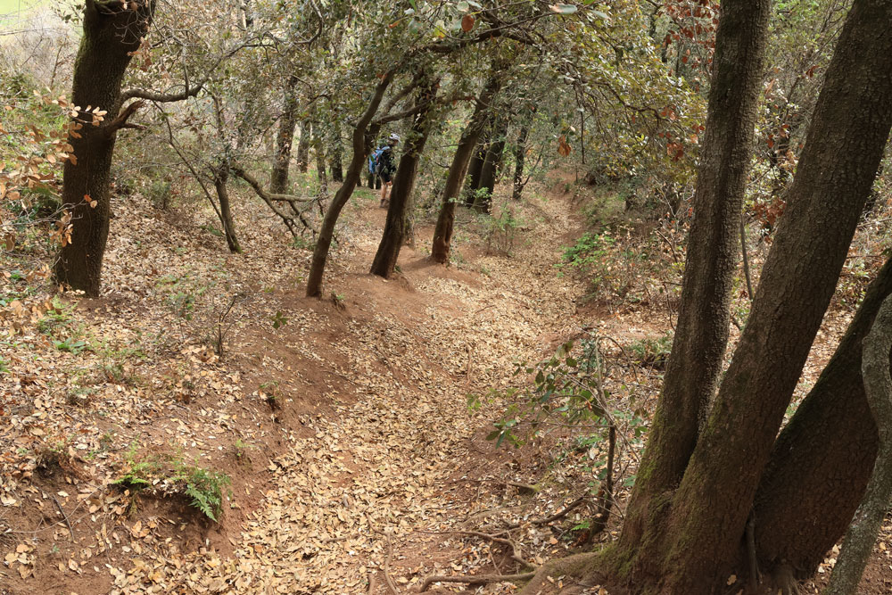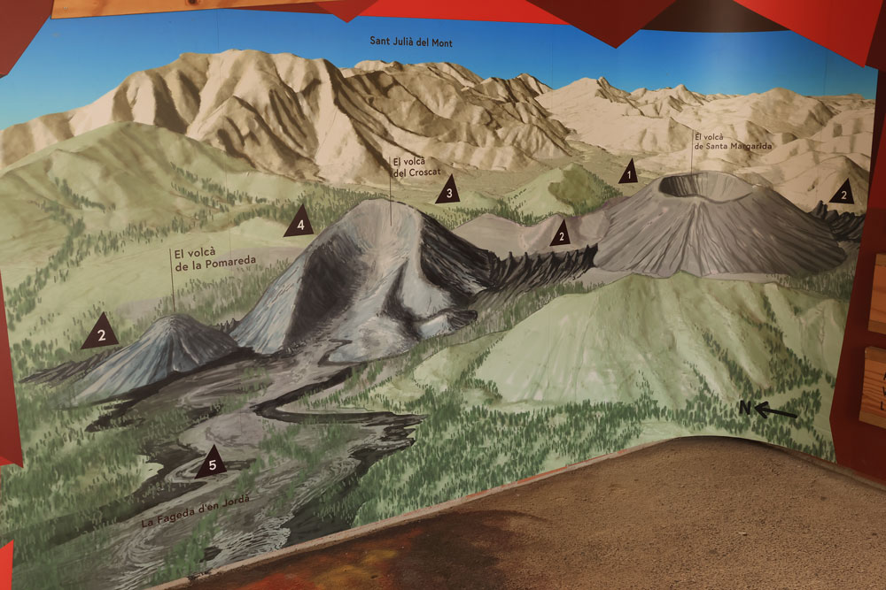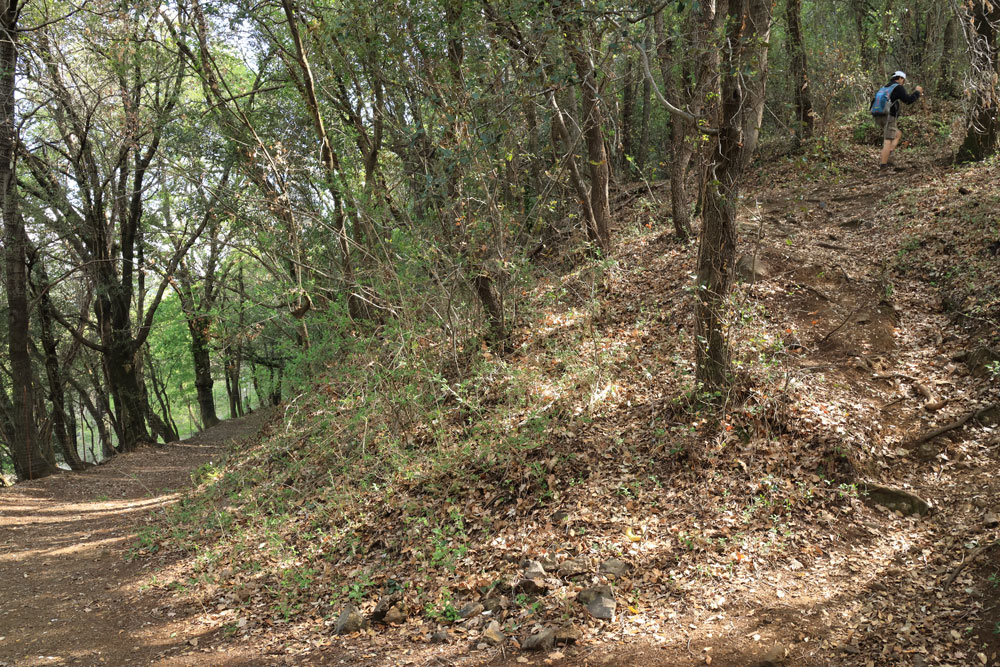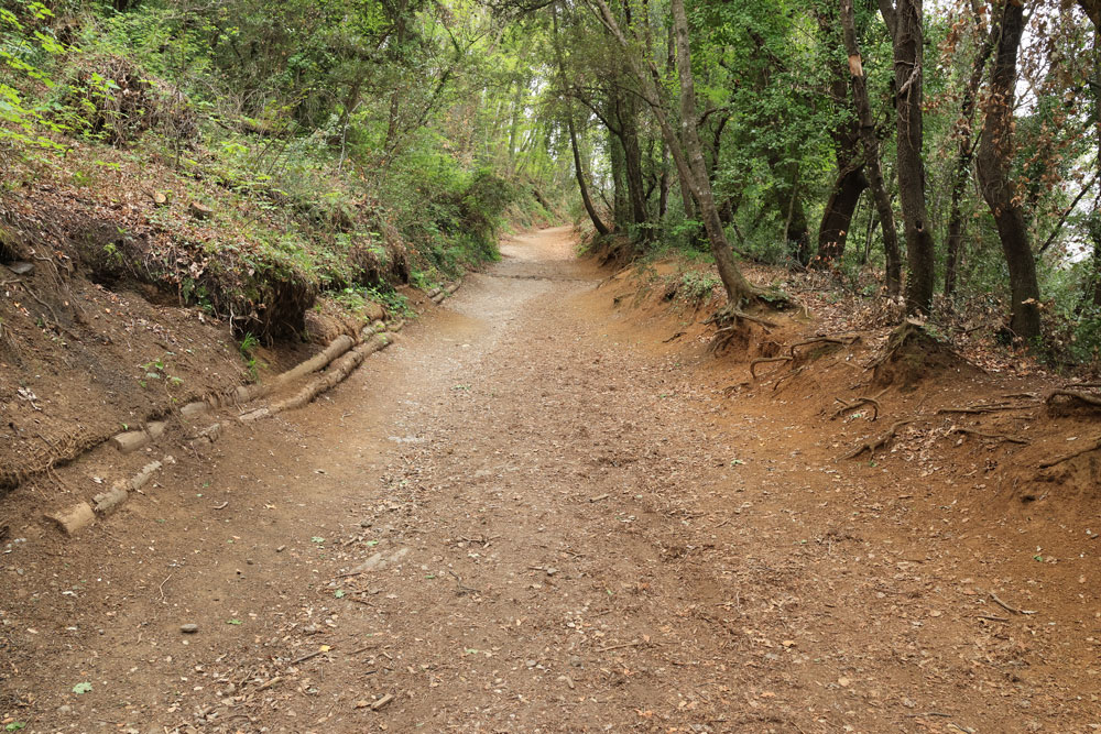 Vanaf Volcà del Croscat volgen we de wandelbordjes naar de volgende vulkaan: Volcà de Santa Margarida. We wandelen eerst weer terug naar het wandelpad waar we net afsloegen en lopen dan een stukje langs de weg, om vervolgens rechtsaf het bos weer in te slaan. Dit staat steeds goed aangegeven op wandelbordjes. Nadat we het bos zijn ingegaan moeten we zo’n 100 meter stijgen tot we weer bij de vulkaanrand aankomen. Hier kunnen we de krater echter nog niet echt zien. We moeten eerst nog een stukje door het bos afdalen.