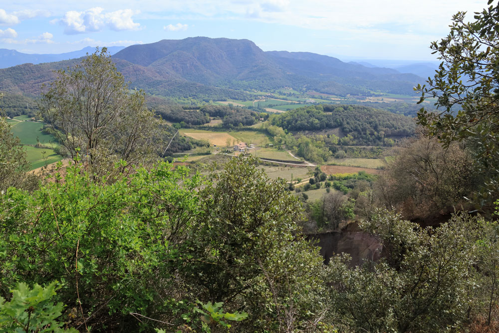 Na een klim van 150 hoogtemeters komen we aan op de vulkaanrand van Volcà del Croscat. Het uitzicht is prachtig vanaf hier! We zien bossen, weilanden, vulkanen en in de verte de Pyreneeën. De voormalige vulkaan is helemaal begroeid met bomen, maar we kijken nu eigenlijk neer op waar ooit de uitbarsting geweest is en naar beneden is gestroomd. Tof om te zien!