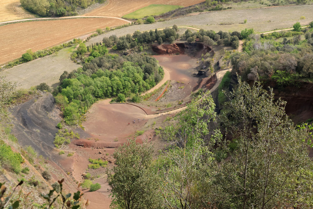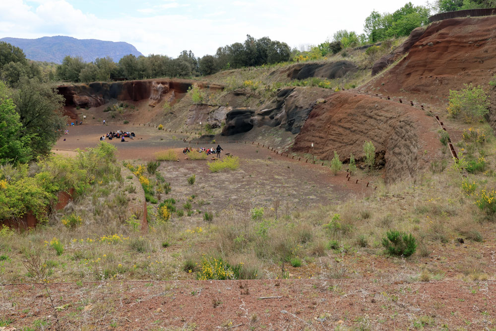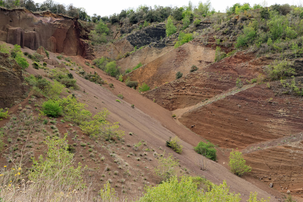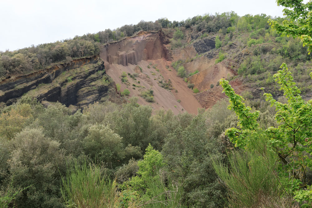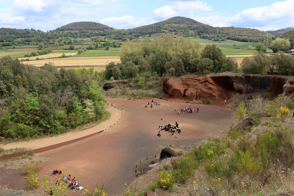 Het bospad brengt ons naar de bodem van de krater van Volcà de Santa Margarida. Het is goed te zien dat de krater een ronde vorm heeft, maar verder is het hier een stuk minder duidelijk dan net bij de vulkaan van Croscat dat we op vulkanische grond lopen. Middenin de krater is een kleine kapel te vinden, die overigens helaas gesloten is als wij er zijn. Net als de vele scholieren om ons heen genieten we hier van onze lunch. Daarna vervolgen we onze weg en volgen het wandelpad aan de linkerkant van de kapel om zo weer terug uit te komen bij de vulkaanrand. Op weg naar boven zien we toch wel wat vulkanisch gekleurde grond.