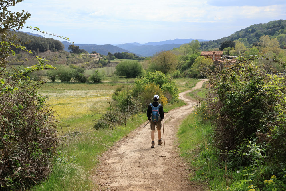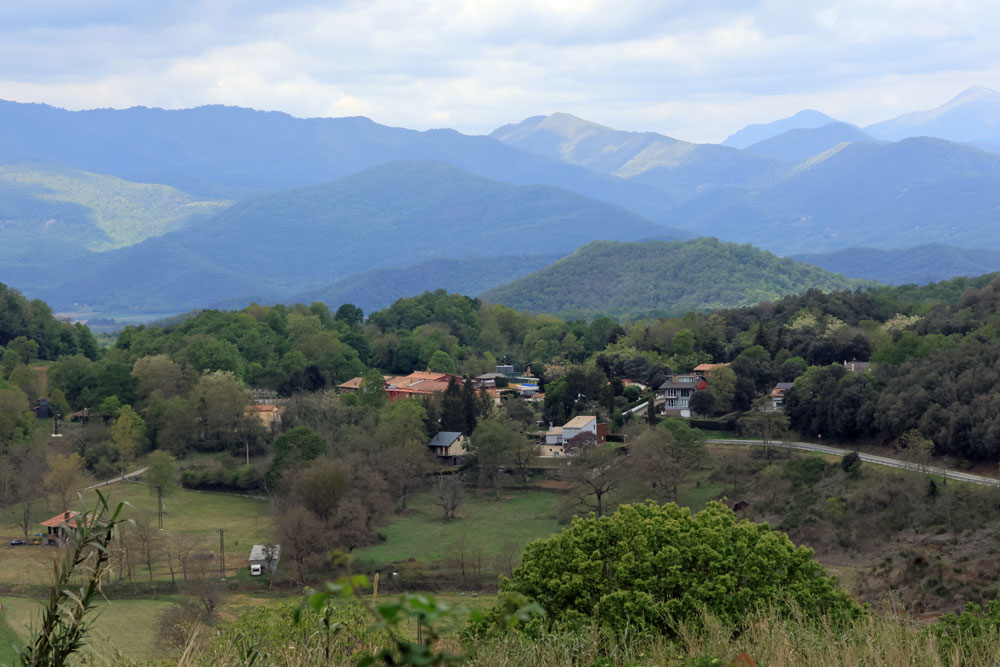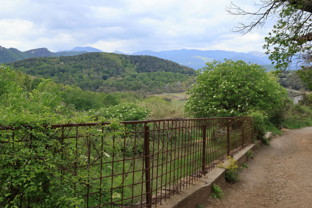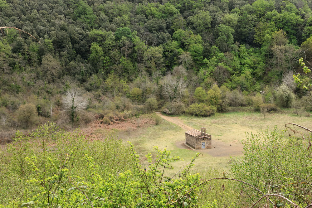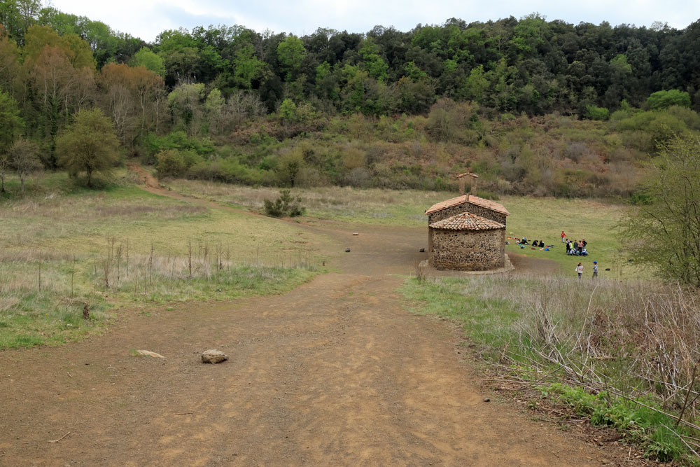 Als we weer bovenaan de vulkaan zijn aanbeland slaan we linksaf en dalen vervolgens door het bos af naar de weilanden onderaan de kerk Sant Miquel Sacot. Daarna klimmen we naar boven naar de kerk. Hier volgen we de asfaltweg terug naar de parkeerplaats. Het uitzicht tijdens deze laatste kilometer is echt weer heel erg mooi. Het is prachtig groen om ons heen. Na drie uur wandelen komen we voldaan weer terug bij de parkeerplaats. Het was leuk wandelen langs de vulkanen in de streek La Garrotxa!