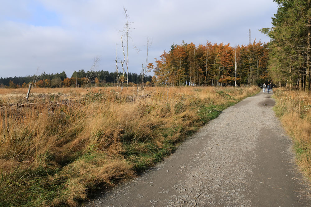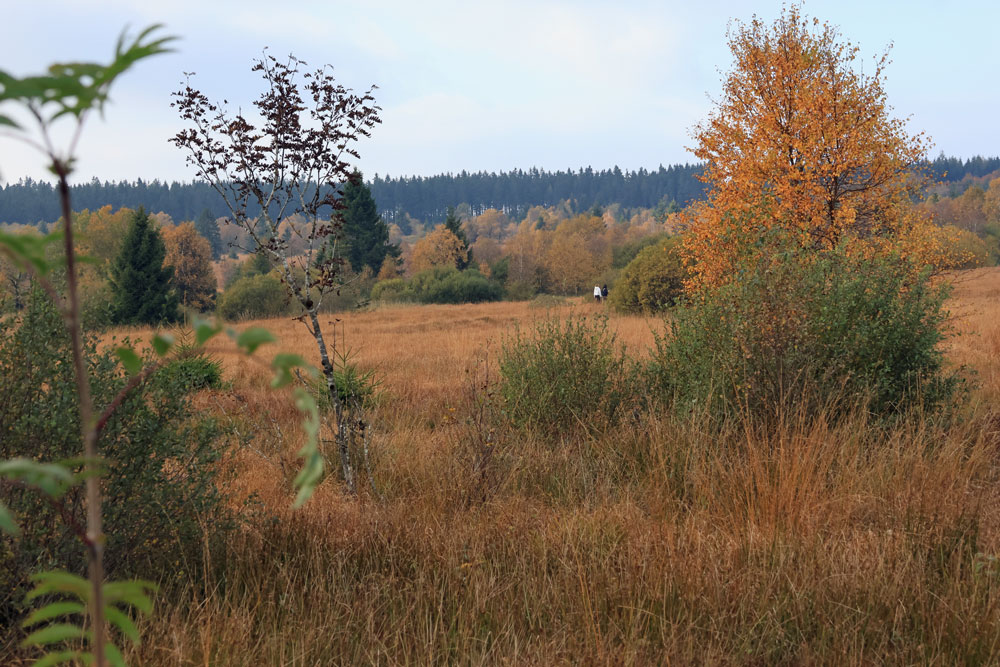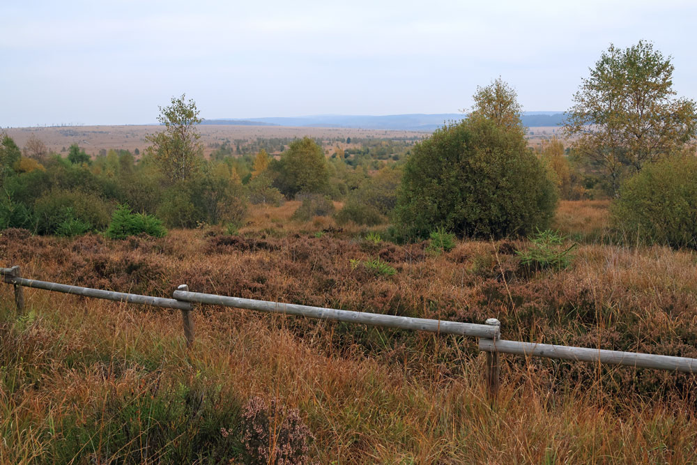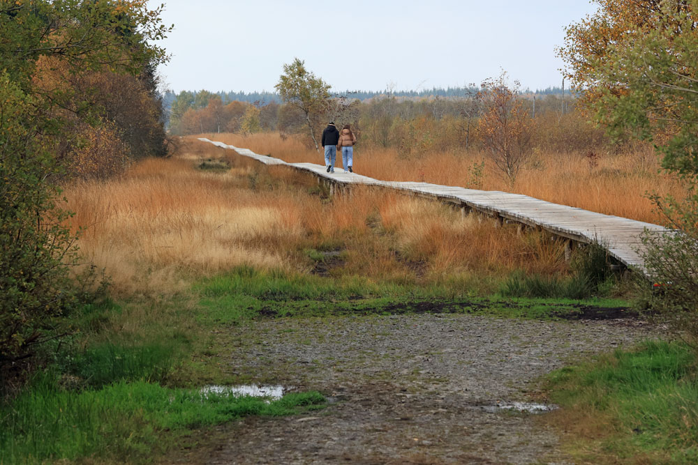 Het is goed zichtbaar dat het herfst is. Als je foto’s ziet van de Hoge Venen in de zomer is alles groen, maar nu is veel van de begroeiing (onder andere pijpenstrootjes) bruingekleurd. De Hoge Venen heeft een overwegend somber en vochtig klimaat. Jaarlijks valt er ongeveer 202 dagen neerslag en de ongeveer 150 mistige dagen per jaar kunnen het een sombere boel maken. Vandaag is daar echter niks van te merken! Het regent en mist niet en zo af en toe komt zelfs de zon eventjes door. Bij Fagne de la Poleûr is het best druk met wandelaars, omdat dit gedeelte makkelijk te bereiken is vanaf verschillende parkeerplaatsen. Vanaf Mont Rigi kun je bijvoorbeeld hier een korte rondwandeling van 3 kilometer maken. Het is er prachtig!