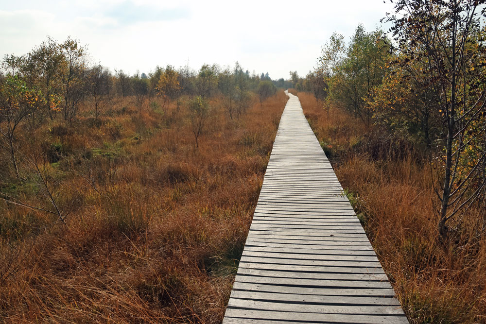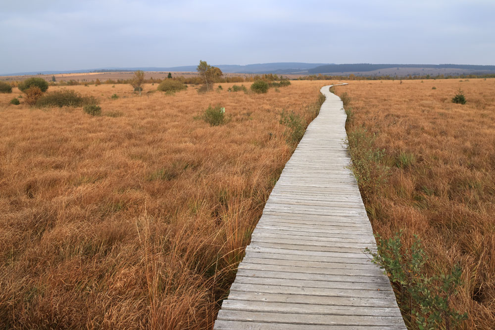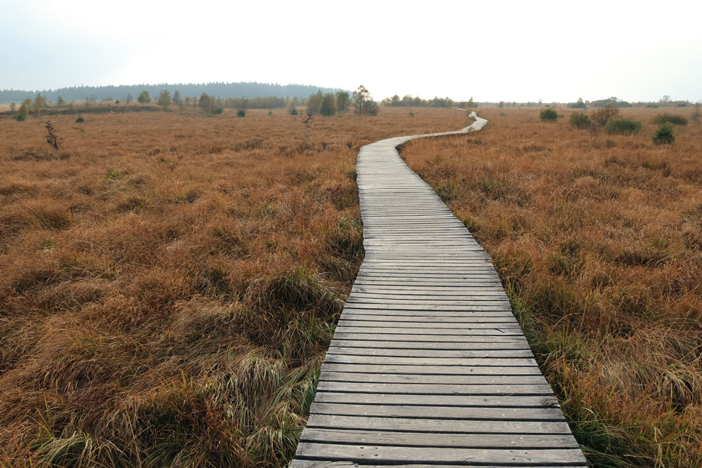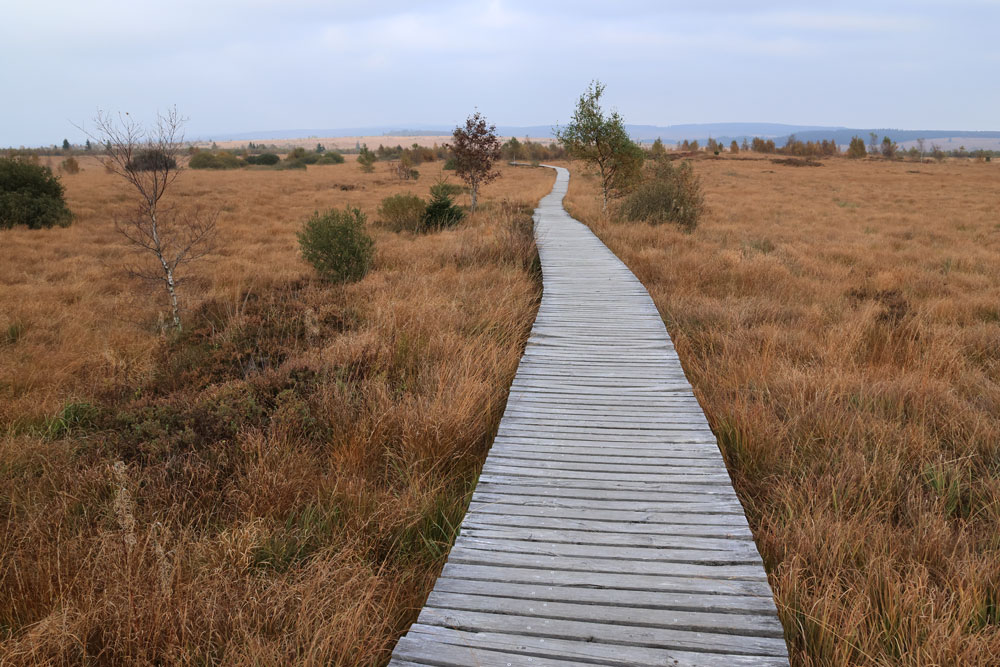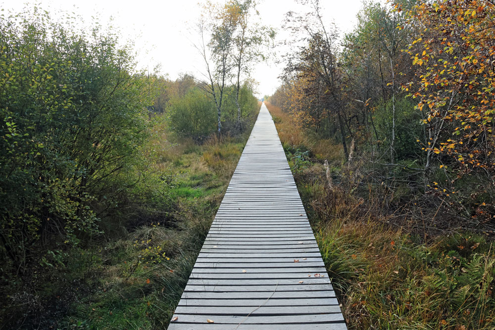 Hoewel het nu bij Baraque Michel een komen en gaan is van bezoekers, was dat in de 19e eeuw wel anders. De herberg bevond zich toen midden tussen de heidevelden. Op mistige dagen (en die waren er dus veel) werd een klok geluid zodat reizigers toch de herberg konden vinden. Als ik vanaf Baraque Michel mijn weg vervolg loop ik al snel langs La Croix du Prieur, een oude grenspaal. Eigenlijk wandel ik gewoon de hele tijd over voormalige grensgebieden. In dit gebied bevond zich vroeger ook de Via Mansuerica, een belangrijke handelsweg die bijna 1000 jaar werd gebruikt. Op informatiepanelen langs de route vind je meer uitleg over de geschiedenis van de Hoge Venen. Het gravelpad gaat over in een vlonderpad en ik werp mijn eerste blikken over een enorm uitgestrekt veengebied.