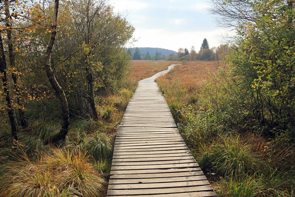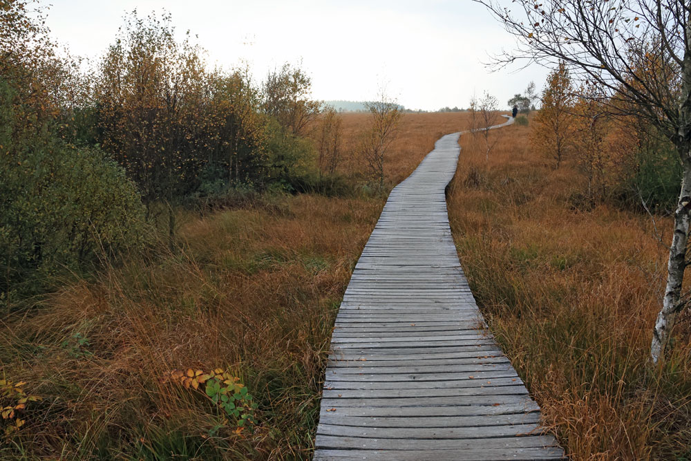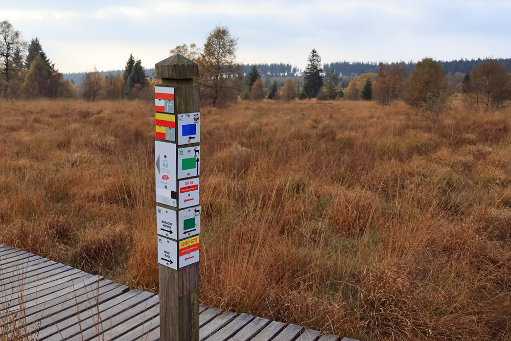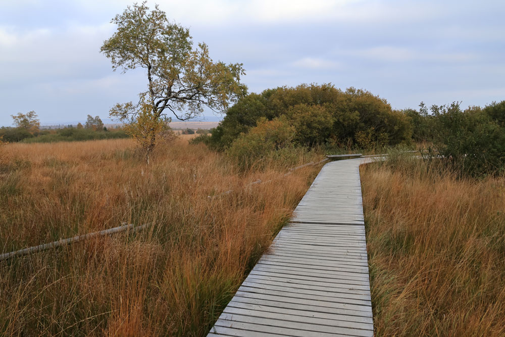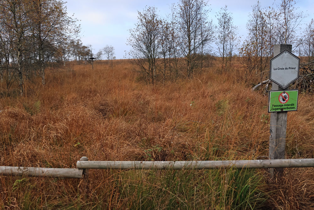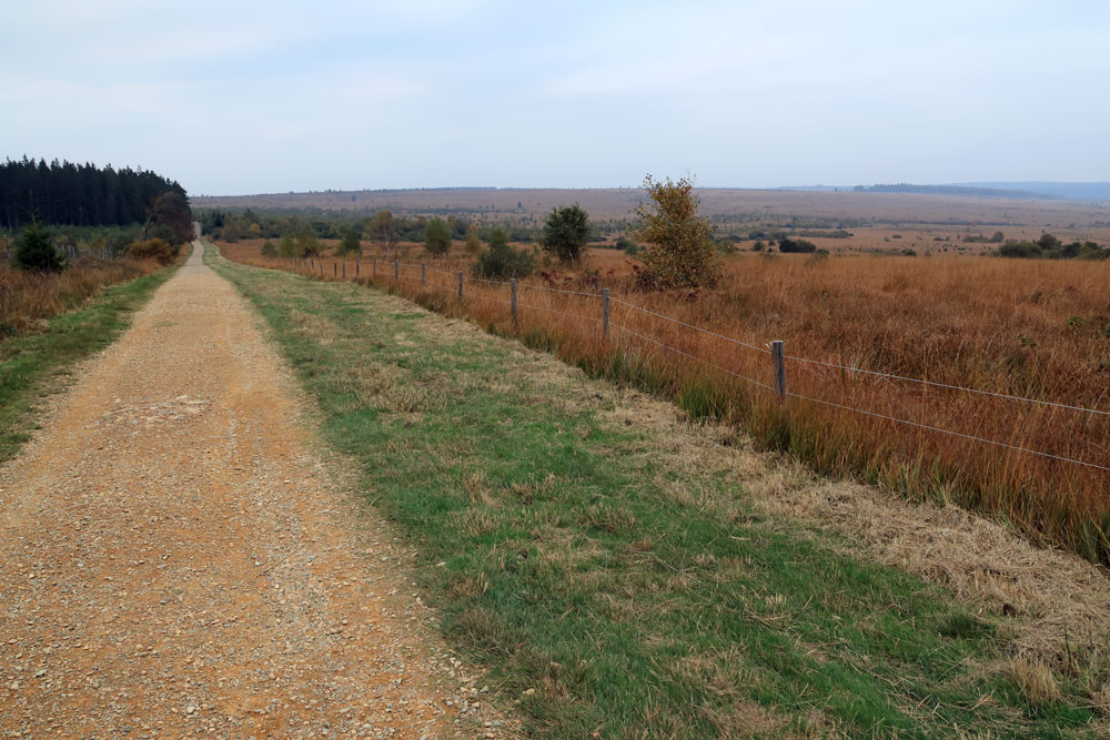 Hoewel het nu bij Baraque Michel een komen en gaan is van bezoekers, was dat in de 19e eeuw wel anders. De herberg bevond zich toen midden tussen de heidevelden. Op mistige dagen (en die waren er dus veel) werd een klok geluid zodat reizigers toch de herberg konden vinden. Als ik vanaf Baraque Michel mijn weg vervolg loop ik al snel langs La Croix du Prieur, een oude grenspaal. Eigenlijk wandel ik gewoon de hele tijd over voormalige grensgebieden. In dit gebied bevond zich vroeger ook de Via Mansuerica, een belangrijke handelsweg die bijna 1000 jaar werd gebruikt. Op informatiepanelen langs de route vind je meer uitleg over de geschiedenis van de Hoge Venen. Het gravelpad gaat over in een vlonderpad en ik werp mijn eerste blikken over een enorm uitgestrekt veengebied.