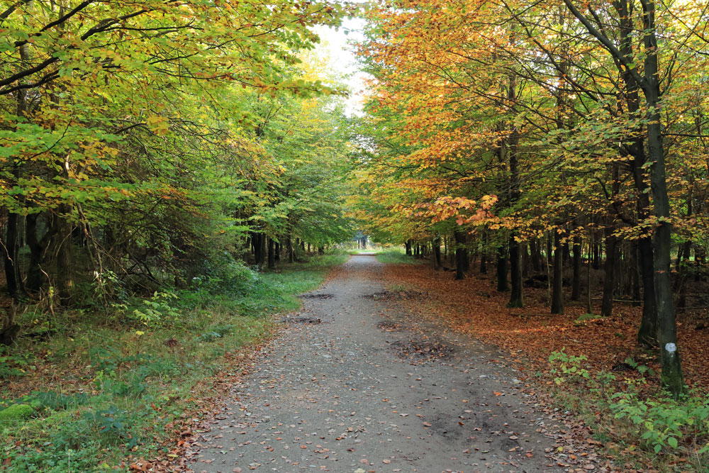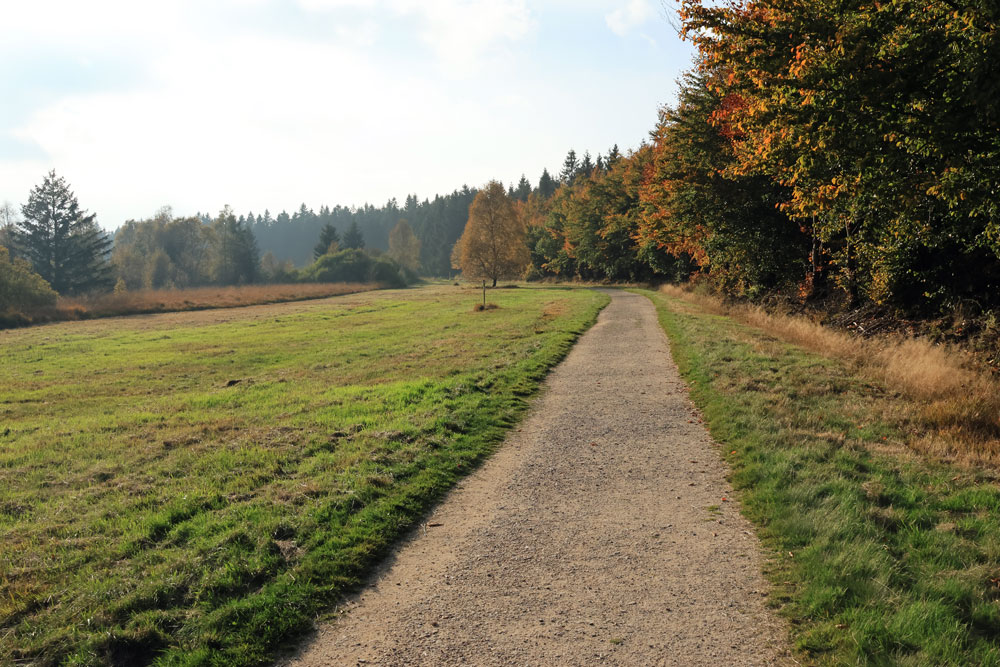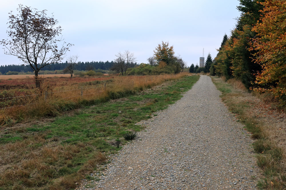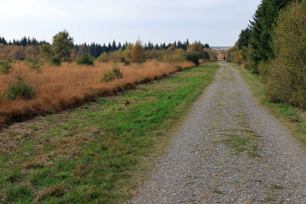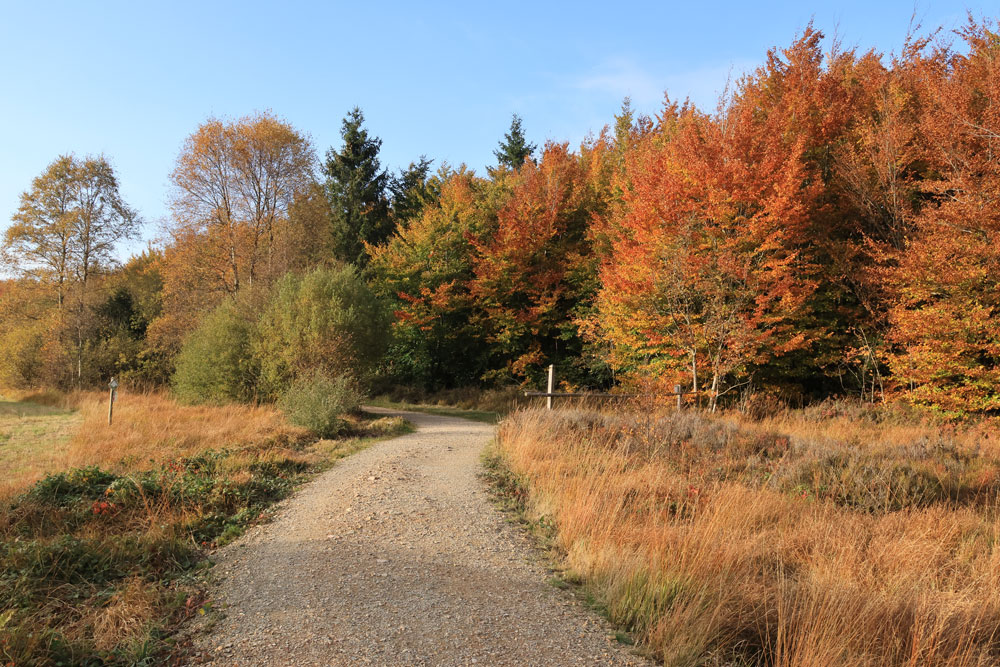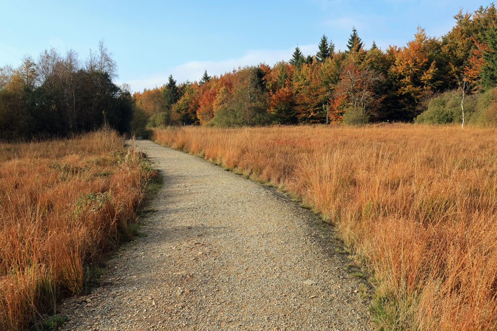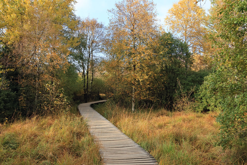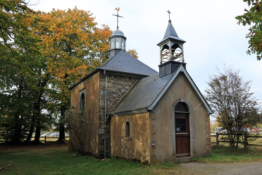 Vanaf Fagne de la Poleûr vervolg ik mijn weg richting Baraque Michel en Chapelle Fischbach. Voor een kort stukje verlaat ik even de vlonderpaden en wacht een gewoon grindpad op mij. De bomen om mij heen vertonen prachtige herfstkleuren en de zon komt precies even door. Heerlijk! Niet lang daarna stuit ik op de kapel Fischbach. De toren van deze kapel diende tot 1856 als lantaarn en was zo een herkenningspunt voor verdwaalde wandelaars in de Hoge Venen. Zo’n 100 meter verderop bevindt zich Baraque Michel, een bekende herberg.