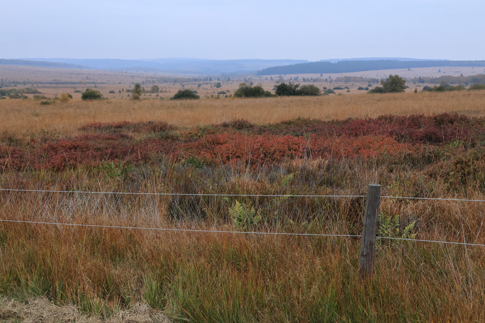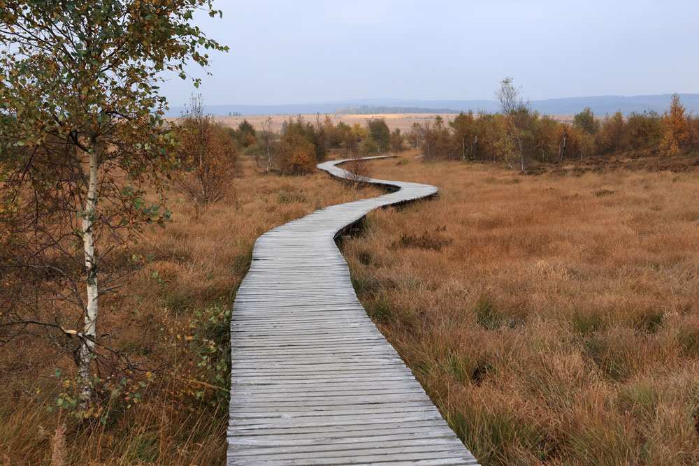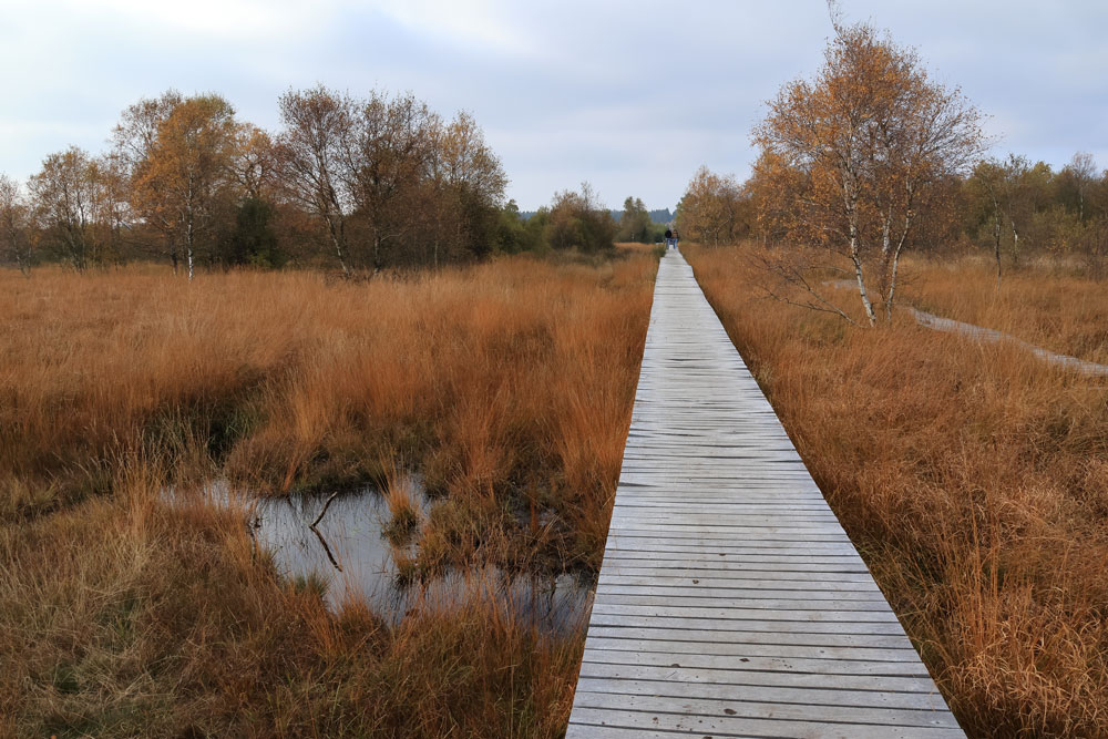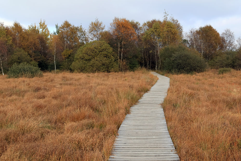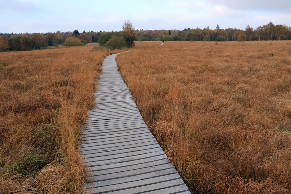 Wauw, wat is het hier schitterend! De uitgestrektheid en weidsheid is eigenlijk niet vast te leggen op foto’s en alleen te beleven als je erdoorheen wandelt. De vlonderpaden zijn meestal in hele goede staat, heel wat anders dan sommige vlonderpaden bij het Veen van Malchamps. In de verte heb ik zicht op een soort eilandje van pijnbomen, Noir Flohay. Door het bruine landschap waan ik me soms net in Afrika en voor mijn gevoel zou ik zo in de verte een giraf kunnen zien lopen. Wat een verschil met alle bossen die ik normaal gewend ben in de Ardennen. In de winter is het hier ongelofelijk koud en kan de temperatuur wel tot -20 schieten. Het is een bijzondere ervaring om in het hart van de Hoge Venen langs deze uitgestrekte veenlandschappen te wandelen.