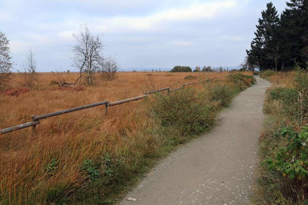 Bij het eerstvolgende kruispunt sla ik rechtsaf naar een nieuw vlonderpad. Dit is ook een gedeelte van de derde etappe van de mooie langeafstandsroute Venntrilogie. Even loop ik tussen wat bomen door, maar al snel heb ik links van me weer vrij uitzicht. Ik kijk nu uit op Fagne Wallonne, een immens groot veenmoeras. Het is al rond etenstijd ’s avonds en dus wordt langzaam al wat donkerder. Sommige gedeeltes zijn niet even mooi met hekken, maar ik blijf maar gewoon genieten van het veenlandschap. Het laatste gedeelte van de wandelroute gaat langs de bosrand en een klein stukje door het bos. Ik eindig met een uitkijkpunt over de Hoge Venen. De echte route begint dus juist met dit uitkijkpunt. Omdat het al eind van de middag is, kom ik bijna niemand meer tegen nu. Heerlijk! Ik heb genoten van deze leuke wandelroute.