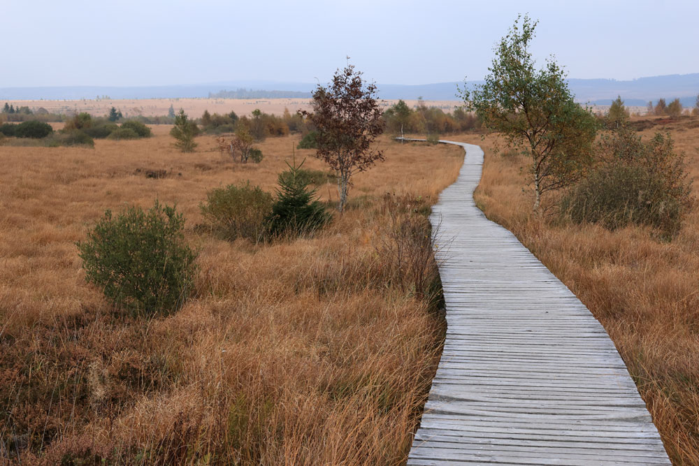 Wauw, wat is het hier schitterend! De uitgestrektheid en weidsheid is eigenlijk niet vast te leggen op foto’s en alleen te beleven als je erdoorheen wandelt. De vlonderpaden zijn meestal in hele goede staat, heel wat anders dan sommige vlonderpaden bij het Veen van Malchamps. In de verte heb ik zicht op een soort eilandje van pijnbomen, Noir Flohay. Door het bruine landschap waan ik me soms net in Afrika en voor mijn gevoel zou ik zo in de verte een giraf kunnen zien lopen. Wat een verschil met alle bossen die ik normaal gewend ben in de Ardennen. In de winter is het hier ongelofelijk koud en kan de temperatuur wel tot -20 schieten. Het is een bijzondere ervaring om in het hart van de Hoge Venen langs deze uitgestrekte veenlandschappen te wandelen.