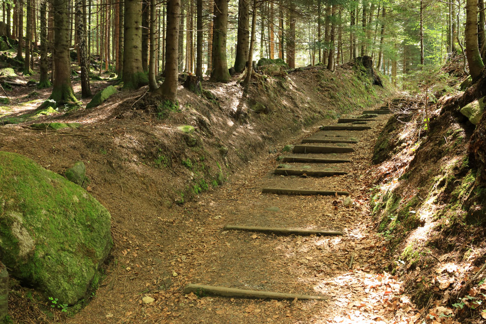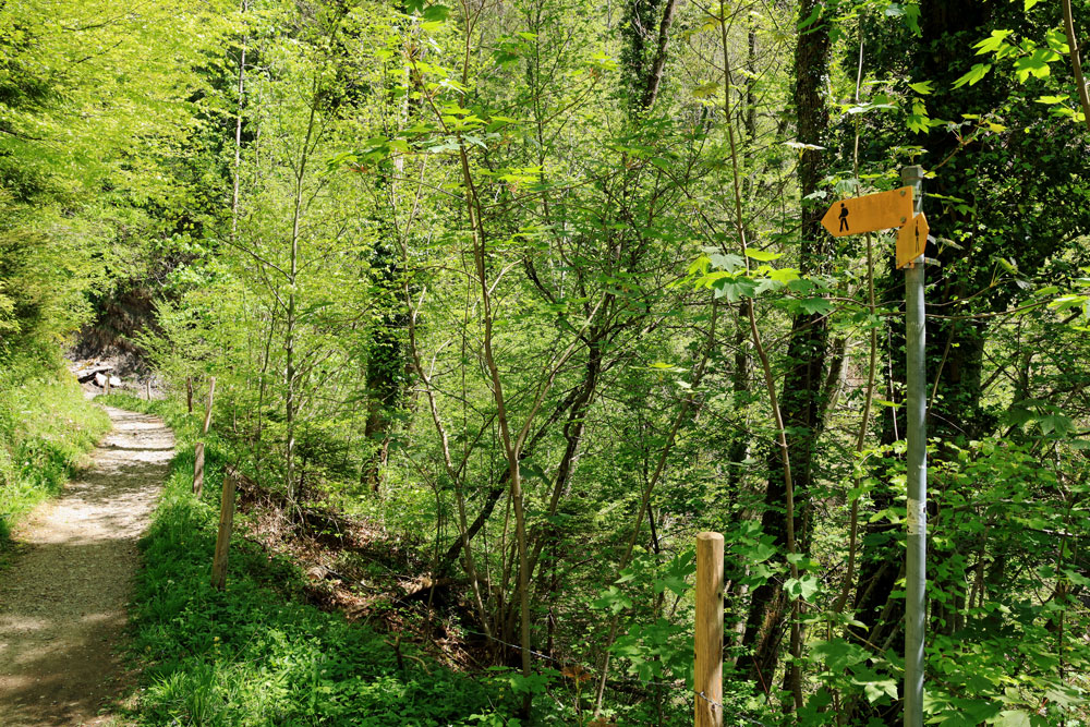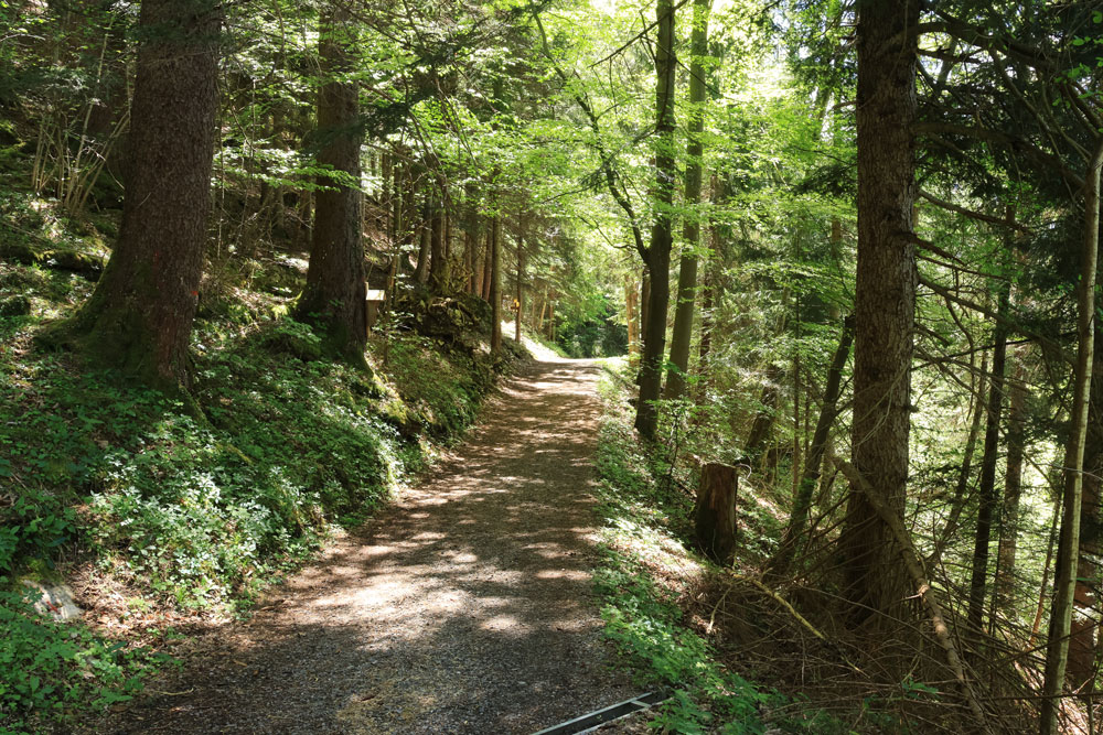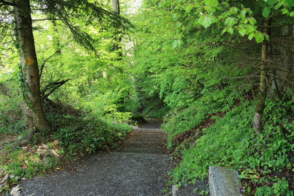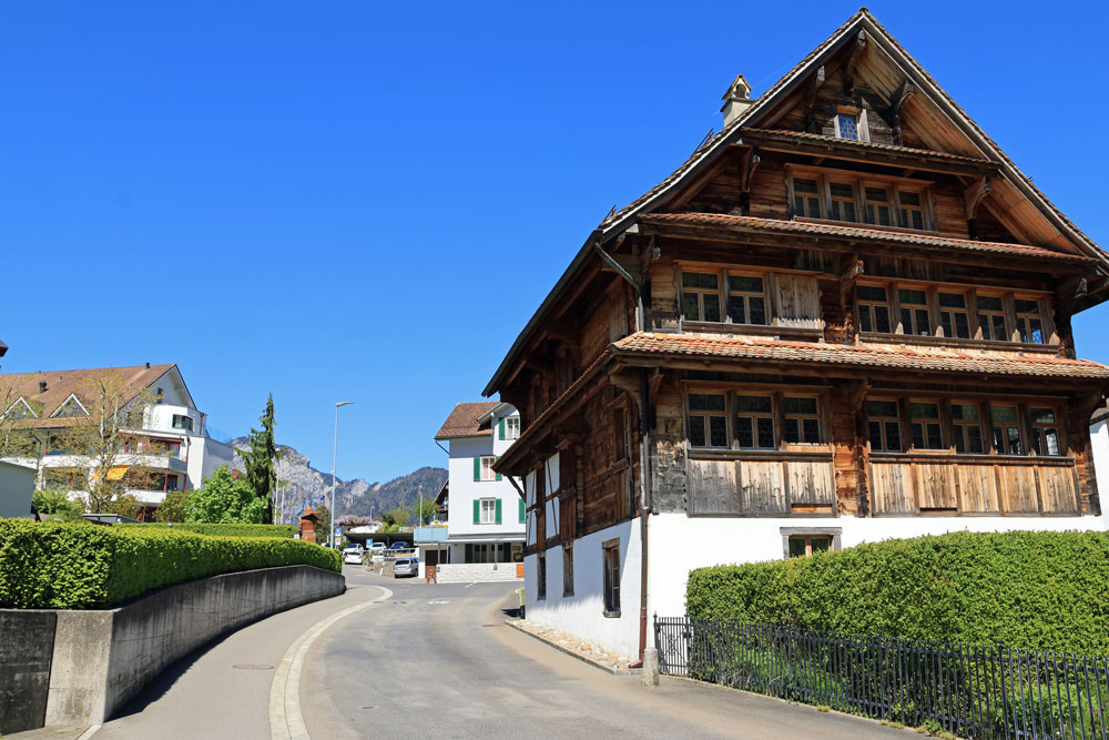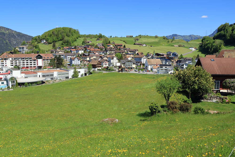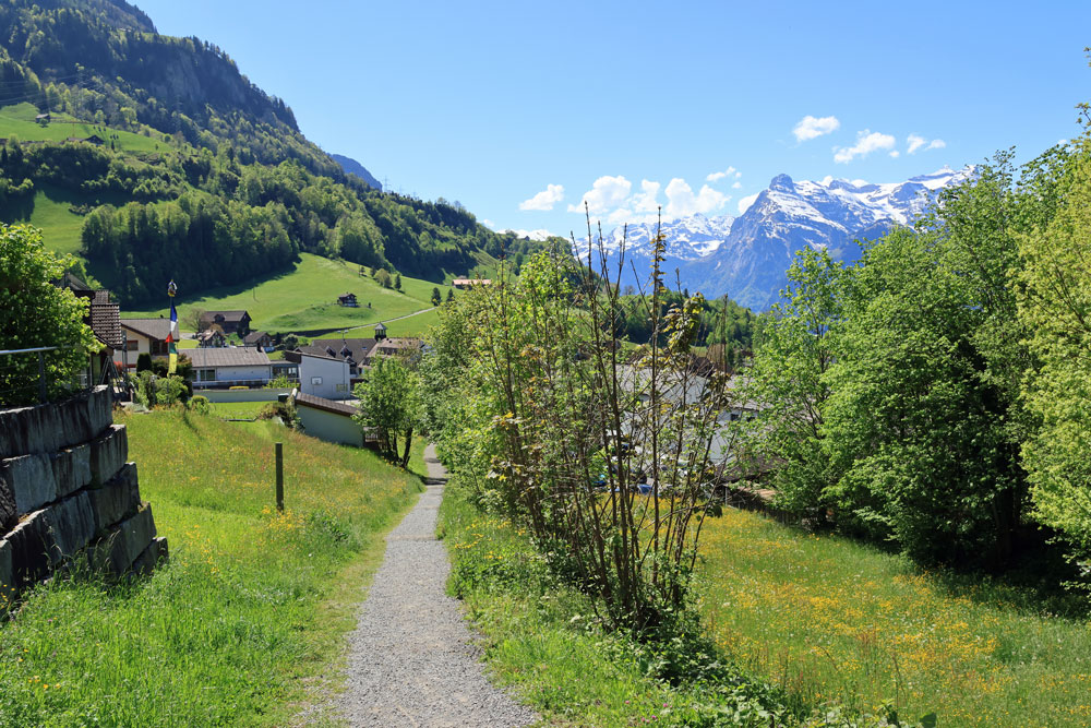 Na het uitkijkpunt Axenstein daal ik af naar Morschach. Ik laat voor nu even het bos achter me en steek de hoofdweg (Dorfstrasse) over. Hier lees ik wat informatieborden over de route en omgeving en ik ontdek dat Morschach al 800 jaar lang gebruikt wordt door reizigers en pelgrims om bij de Gotthardpas te komen om zo naar Italië te gaan. Ik passeer de kerk en sla daarna rechtsaf om zo al stijgend het dorp weer uit te gaan.