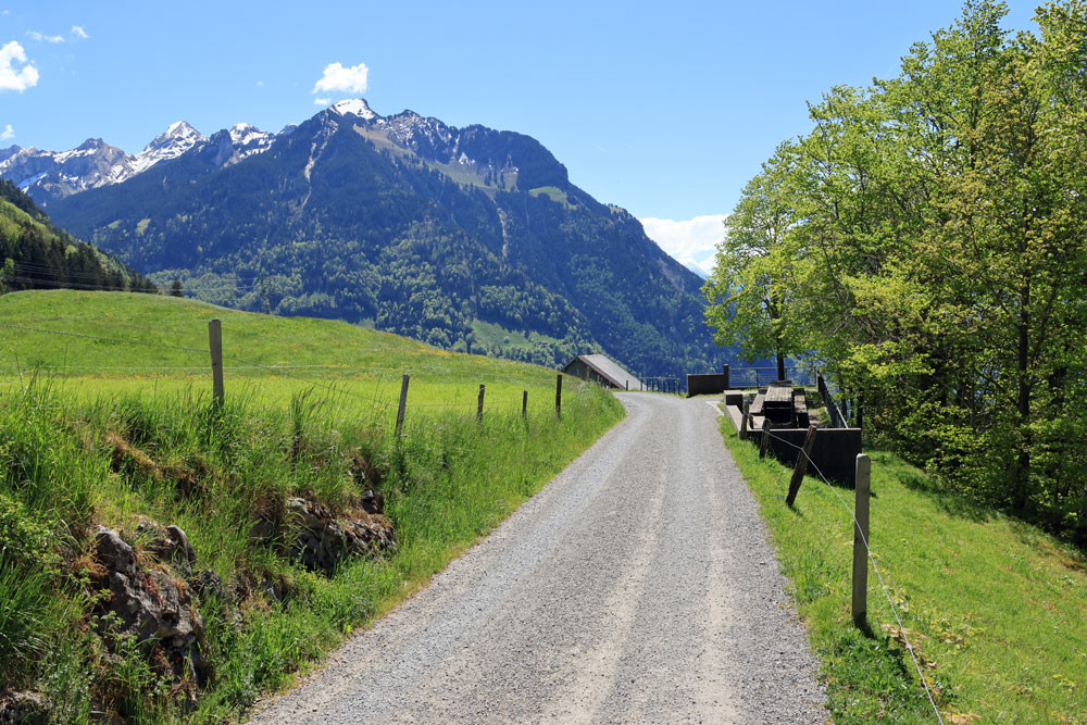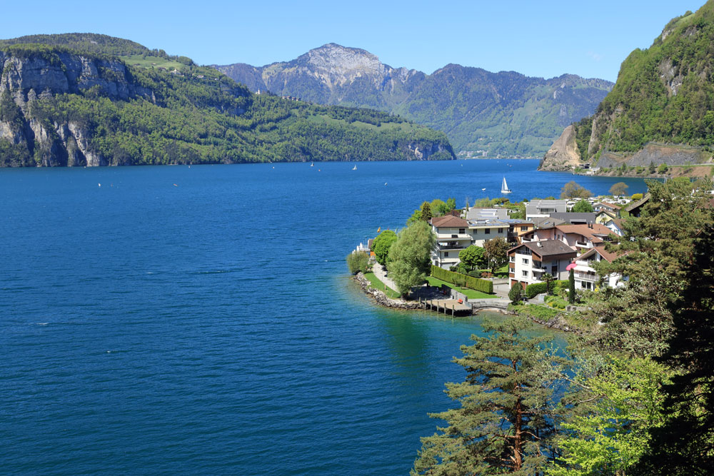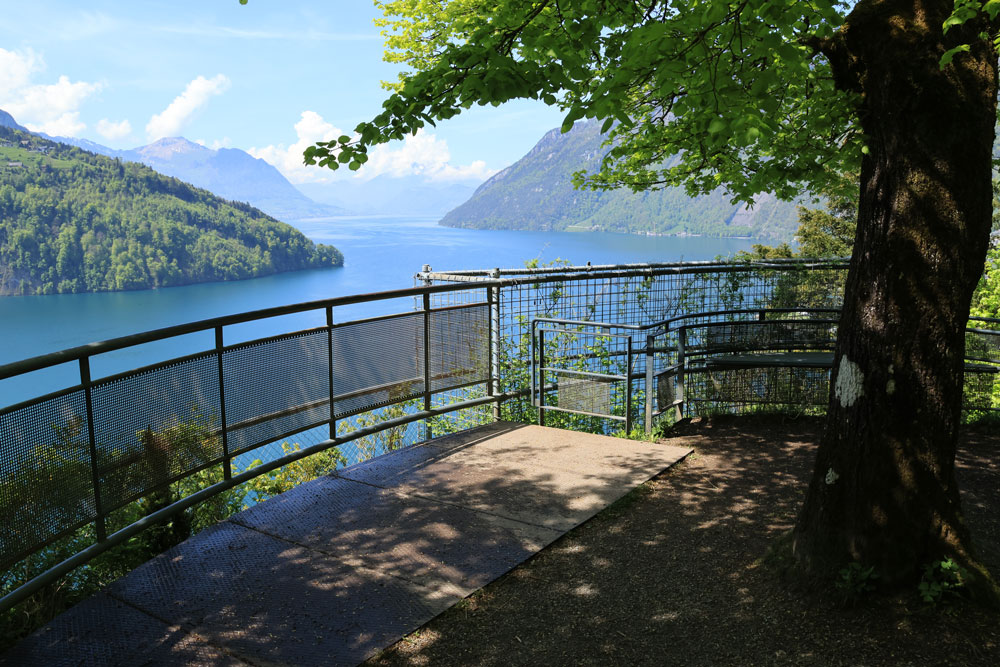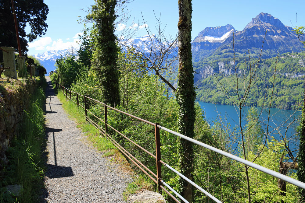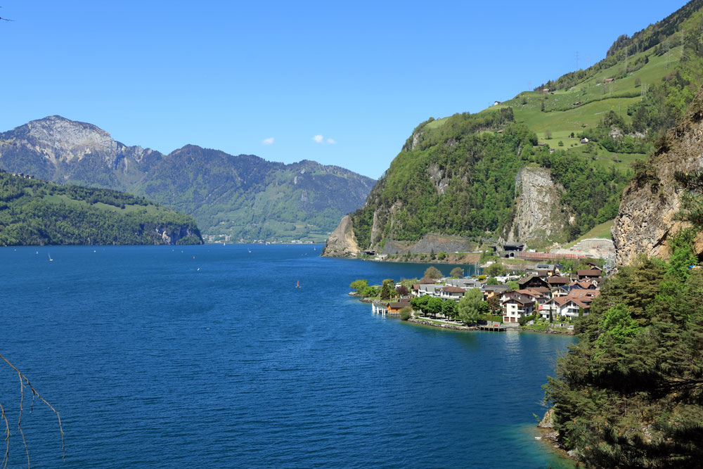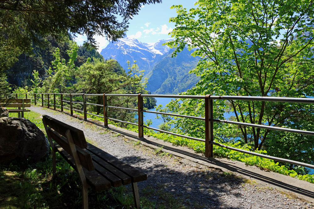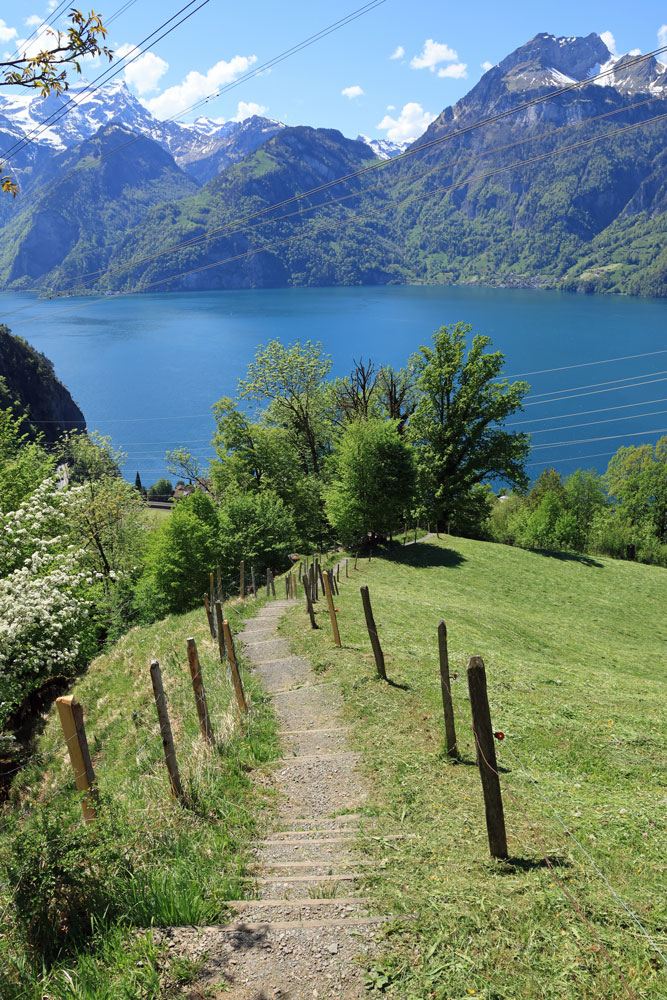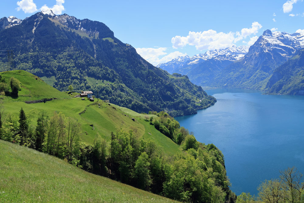Na Morschach volgt er een klim van 200 meter over een asfaltweg (2 kilometer). Gelukkig komt er bijna geen verkeer voorbij, dus ik kan alsnog rustig om me heen kijken tijdens het wandelen. De uitzichten hoog boven het meer zijn namelijk schitterend hier. Direct naast de weg liggen grote groene weilanden die prachtig afsteken tegen het blauwe meer en de (besneeuwde) bergen. Op een warme zomerdag zal dit gedeelte niet heel fijn zijn, want er is weinig beschutting te vinden. Aan het eind van de klim is een grote picknickplek naast de weg, waar ik in mijn eentje heerlijk geniet van mijn meegebrachte lunch. Daarna verandert de asfaltweg in een (breed) grindpad en begint de afdaling. Links van me zie ik de steile bergwanden van de Fronalpstock en rechts in de diepte zie ik Sisikon al liggen waar ik nu naartoe zal wandelen.