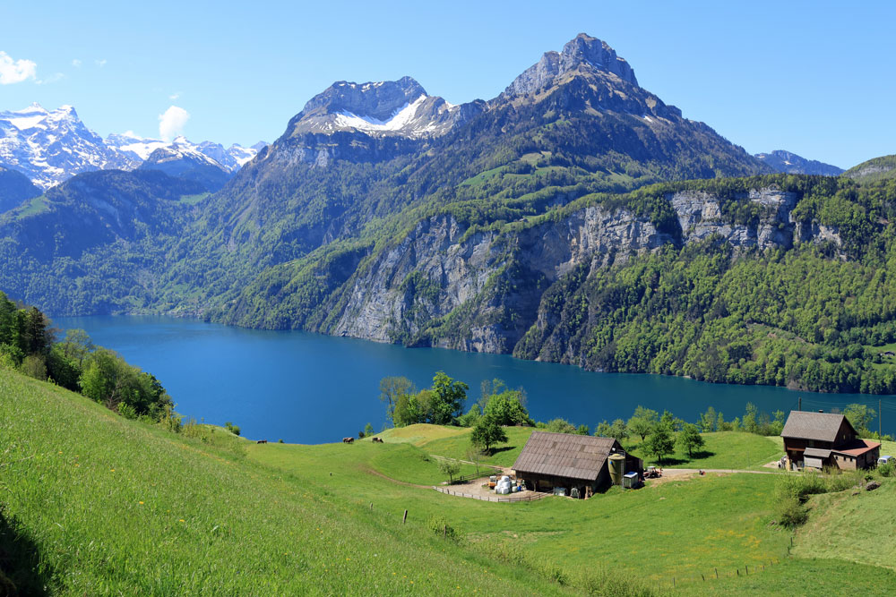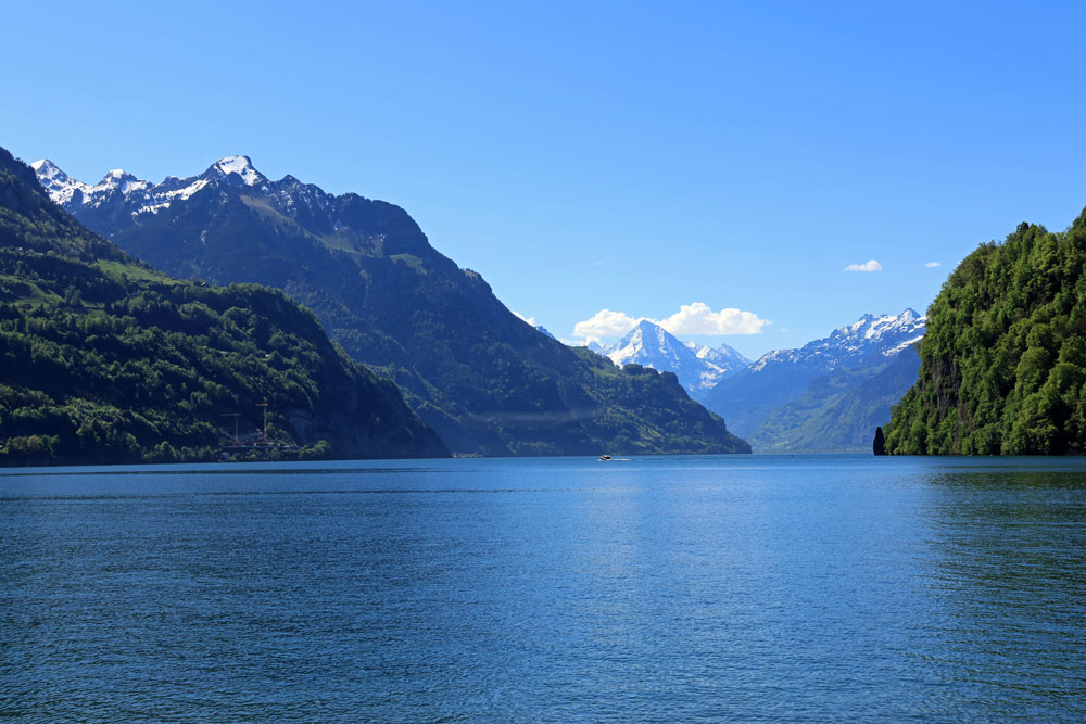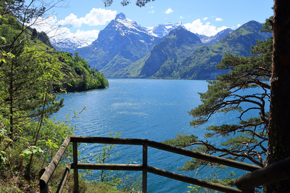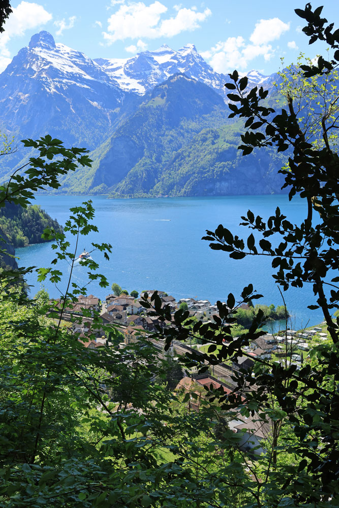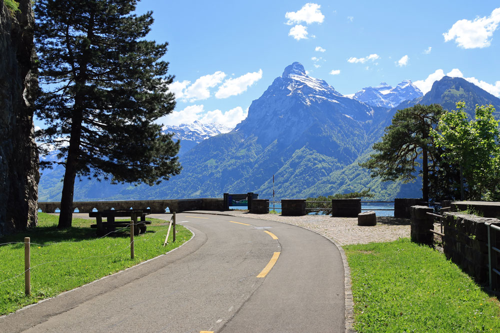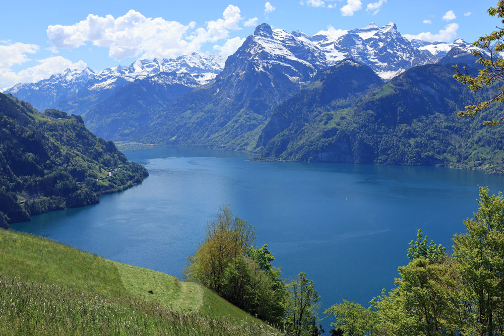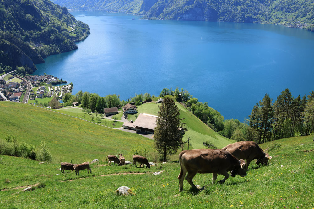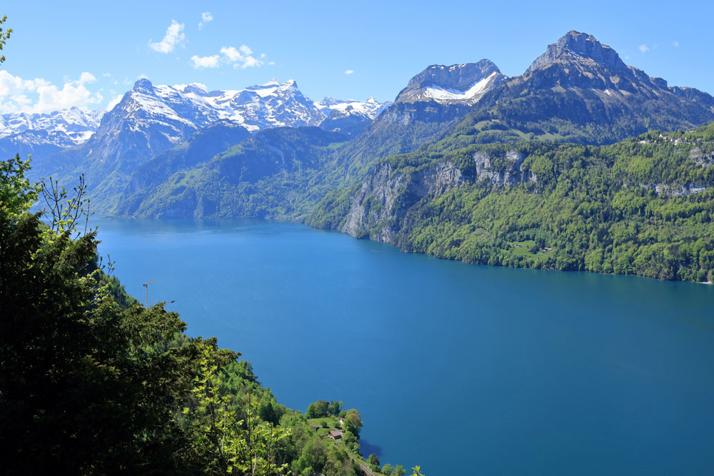 Na Morschach volgt er een klim van 200 meter over een asfaltweg (2 kilometer). Gelukkig komt er bijna geen verkeer voorbij, dus ik kan alsnog rustig om me heen kijken tijdens het wandelen. De uitzichten hoog boven het meer zijn namelijk schitterend hier. Direct naast de weg liggen grote groene weilanden die prachtig afsteken tegen het blauwe meer en de (besneeuwde) bergen. Op een warme zomerdag zal dit gedeelte niet heel fijn zijn, want er is weinig beschutting te vinden. Aan het eind van de klim is een grote picknickplek naast de weg, waar ik in mijn eentje heerlijk geniet van mijn meegebrachte lunch. Daarna verandert de asfaltweg in een (breed) grindpad en begint de afdaling. Links van me zie ik de steile bergwanden van de Fronalpstock en rechts in de diepte zie ik Sisikon al liggen waar ik nu naartoe zal wandelen.