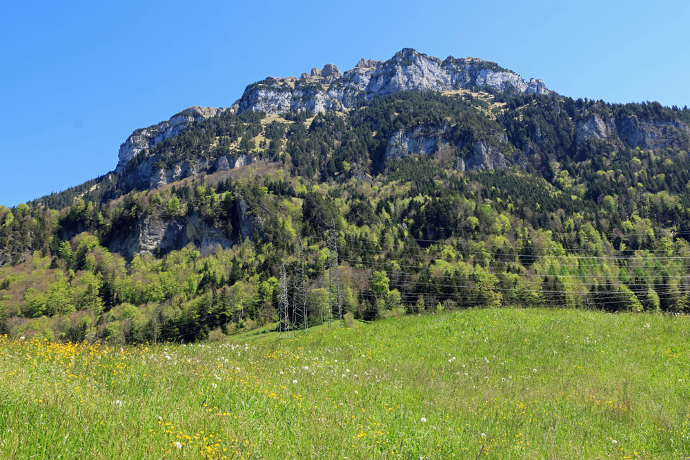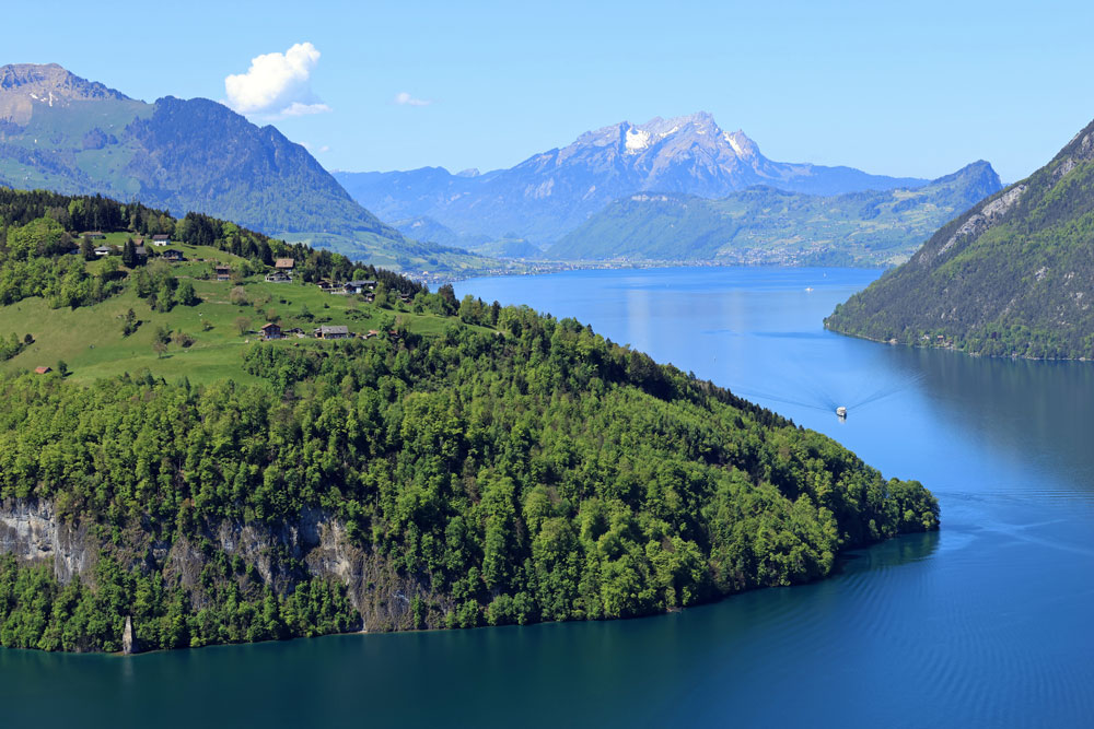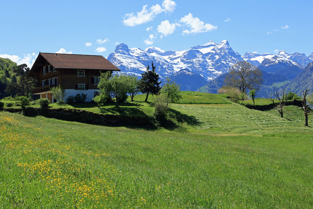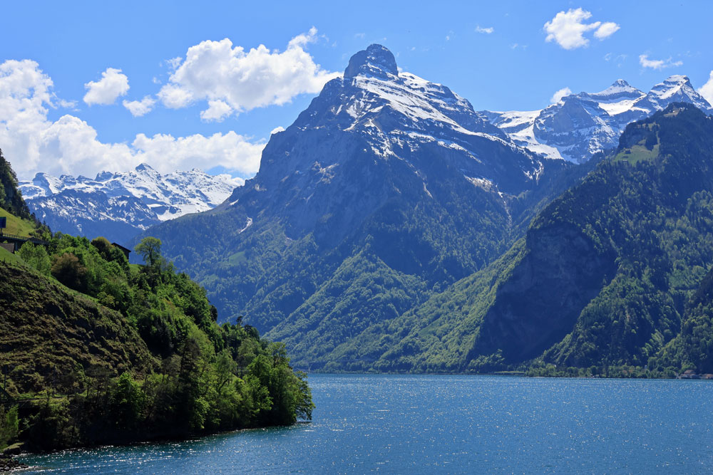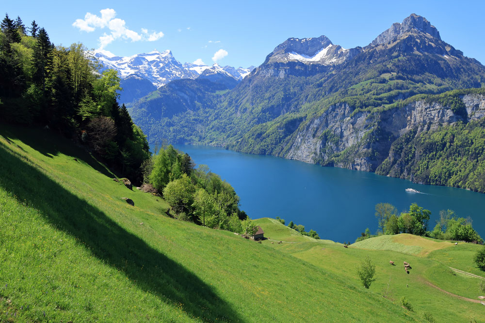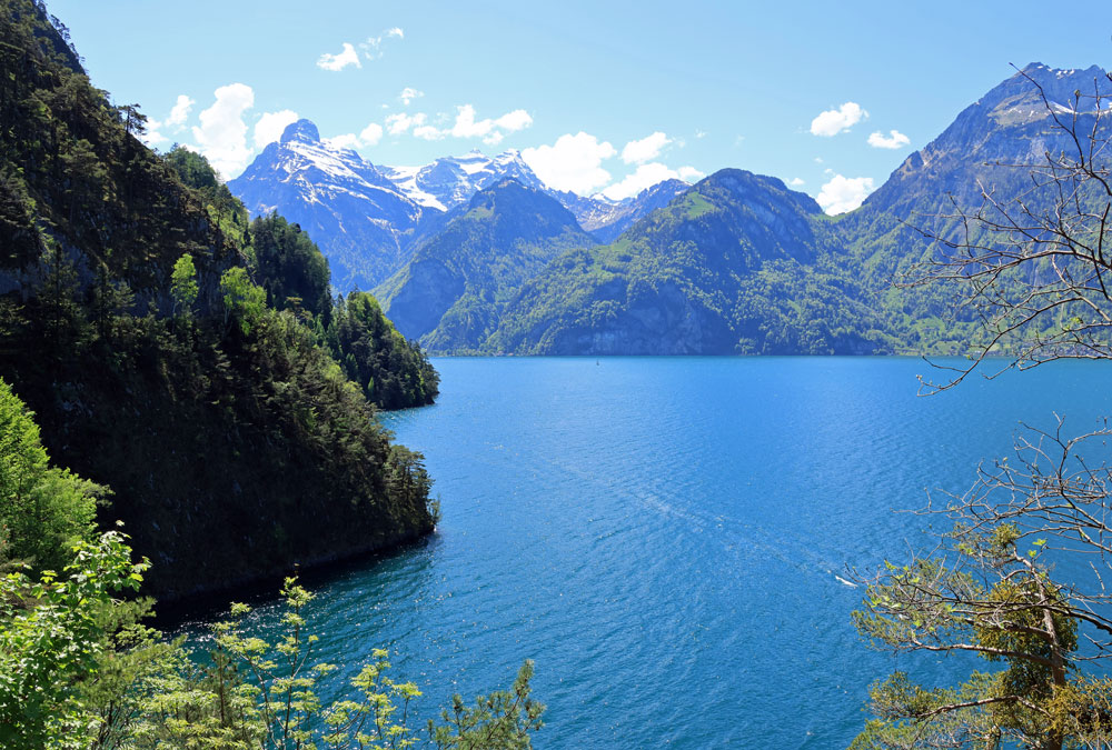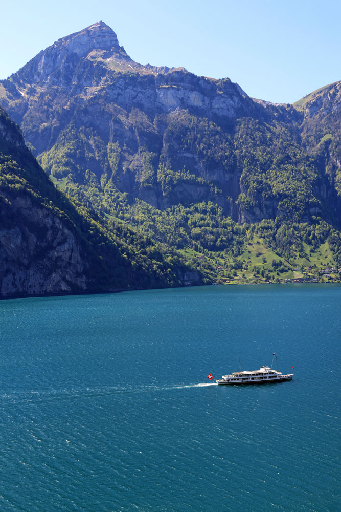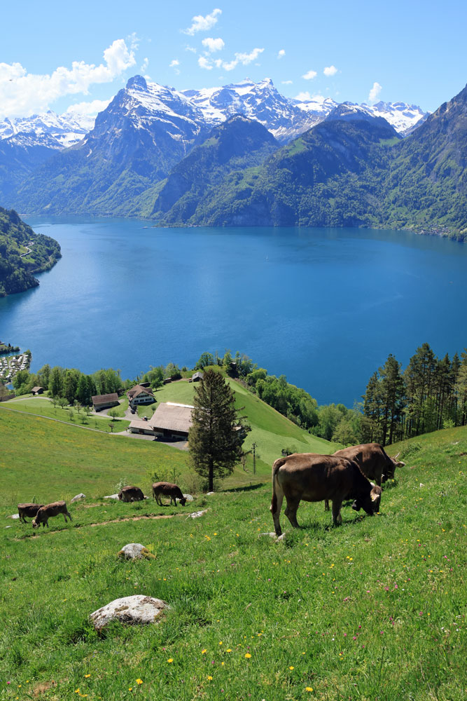 Na Morschach volgt er een klim van 200 meter over een asfaltweg (2 kilometer). Gelukkig komt er bijna geen verkeer voorbij, dus ik kan alsnog rustig om me heen kijken tijdens het wandelen. De uitzichten hoog boven het meer zijn namelijk schitterend hier. Direct naast de weg liggen grote groene weilanden die prachtig afsteken tegen het blauwe meer en de (besneeuwde) bergen. Op een warme zomerdag zal dit gedeelte niet heel fijn zijn, want er is weinig beschutting te vinden. Aan het eind van de klim is een grote picknickplek naast de weg, waar ik in mijn eentje heerlijk geniet van mijn meegebrachte lunch. Daarna verandert de asfaltweg in een (breed) grindpad en begint de afdaling. Links van me zie ik de steile bergwanden van de Fronalpstock en rechts in de diepte zie ik Sisikon al liggen waar ik nu naartoe zal wandelen.
