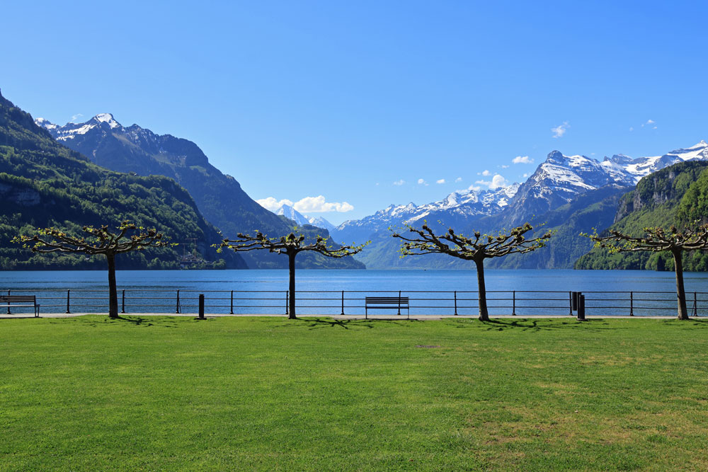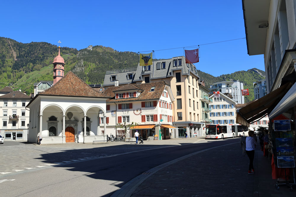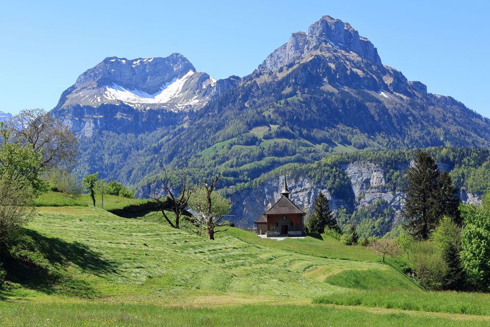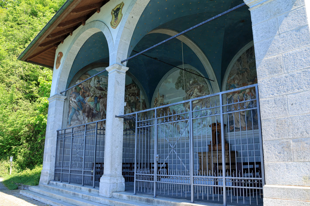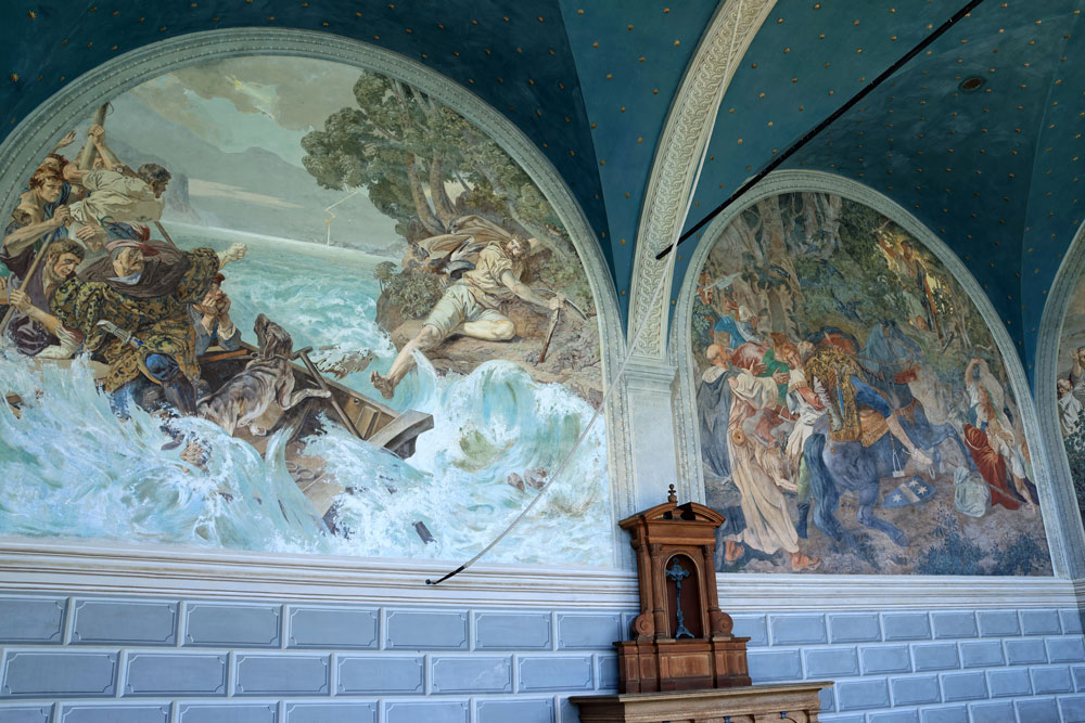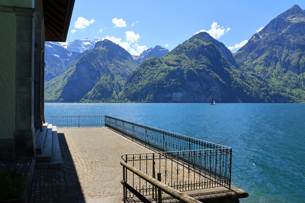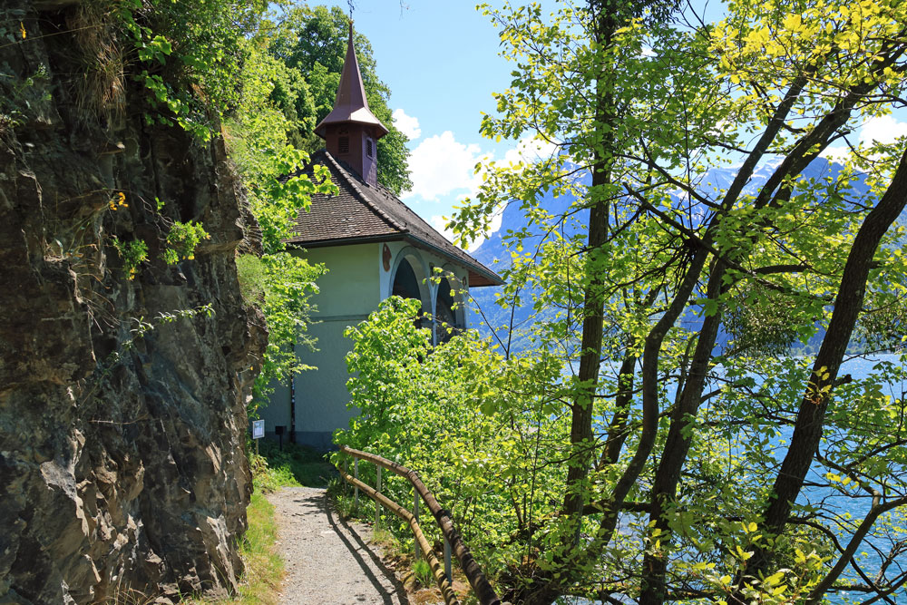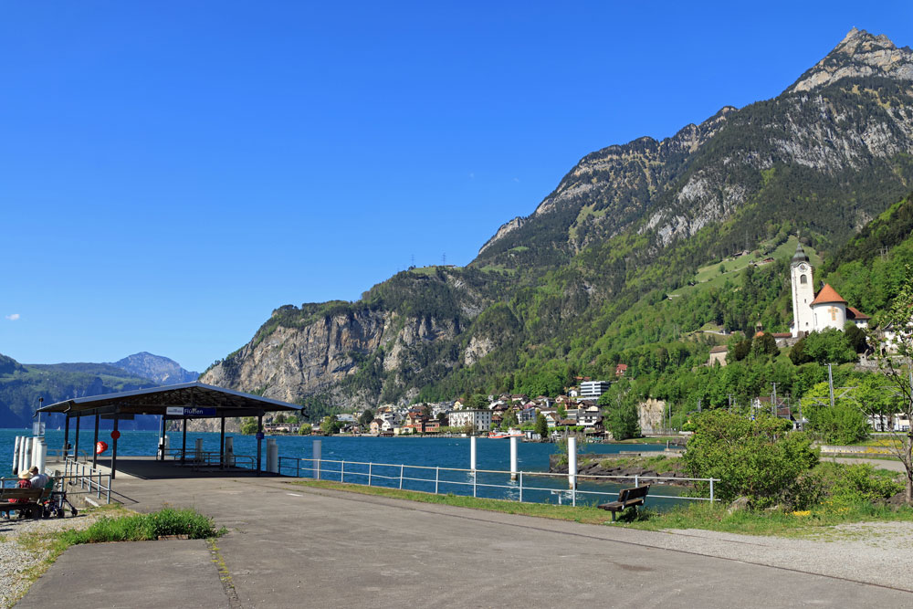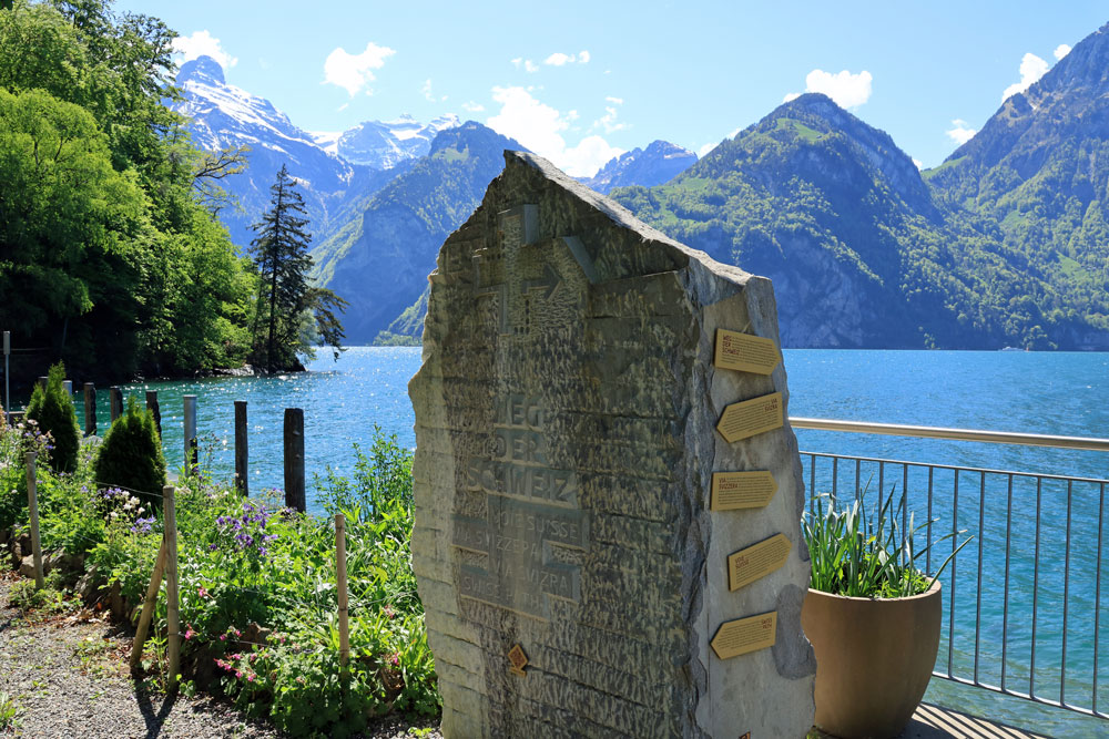 Bij Tellsplatte draait alles om de beroemde Wilhelm Tell. Volgens de legende sprong Tell hier tijdens een storm uit de boot van zijn gevangennemers waardoor hij kon ontsnappen. Daarna vermoordde hij de tiran Gessler en ontketende een opstand die leidde tot de oprichting van de Zwitserse Confederatie, de voorloper van de huidige staat Zwitserland. De Tellsplatte wordt al in 1470 vermeld in documenten. De huidige kapel die op deze plek staat, de Tellskapelle werd gebouwd in 1879 en is versierd met vier fresco’s met beelden uit het leven van Wilhelm Tell. In de zomer meert hier ook de veerboot aan en kun je er bijvoorbeeld waterfietsen. Nu kom ik helemaal niemand tegen. Als ik de kapel weer achter me laat kom ik vrij snel aan bij het grootste carillon van Zwitserland. Ieder uur, precies op het hele uur, speelt het carillon tien minuten lang een selectie van twintig bekende Zwitserse liederen. Je kan zelf kiezen wat je wilt horen en de muziek ‘bedienen’.