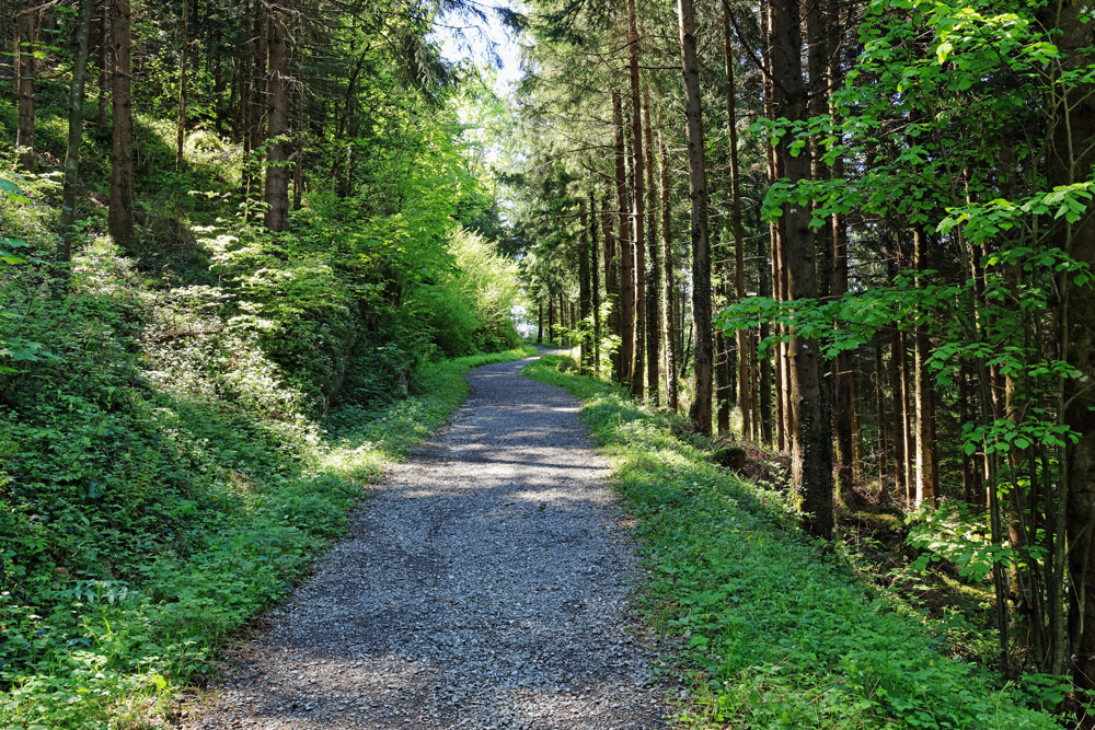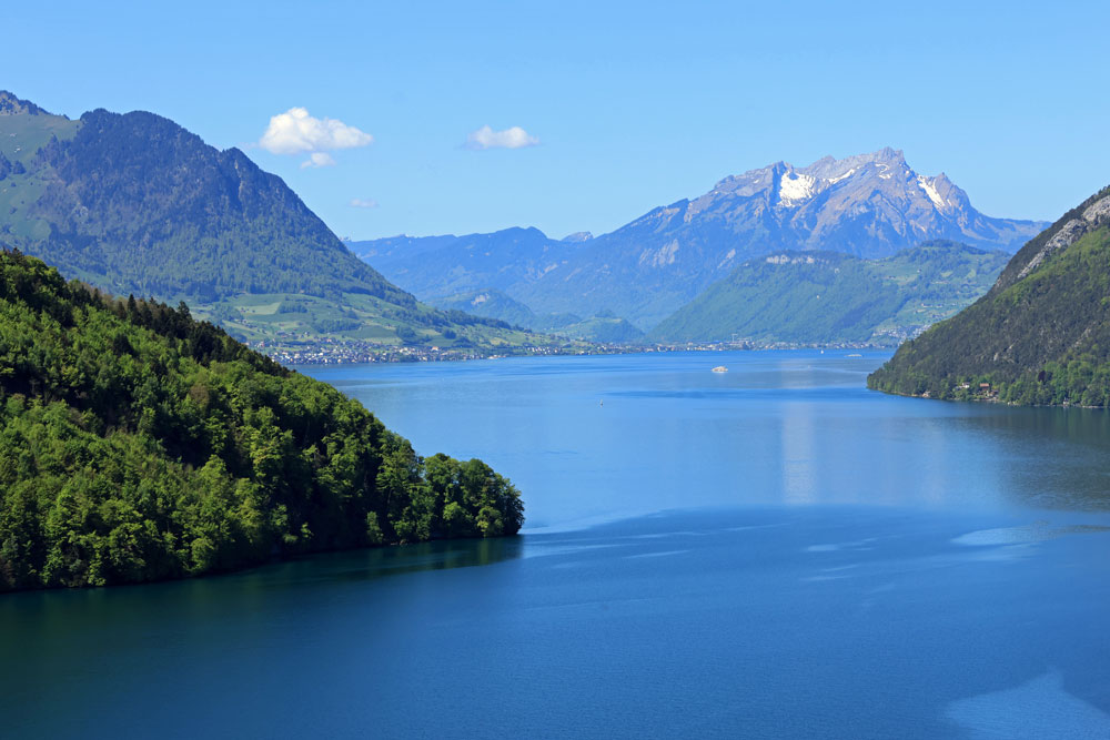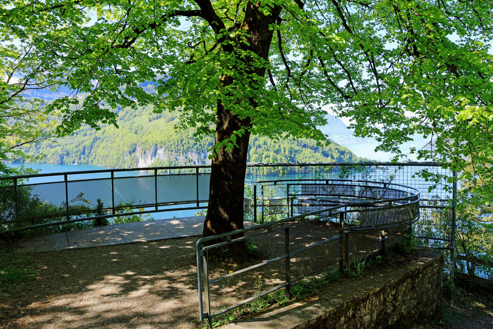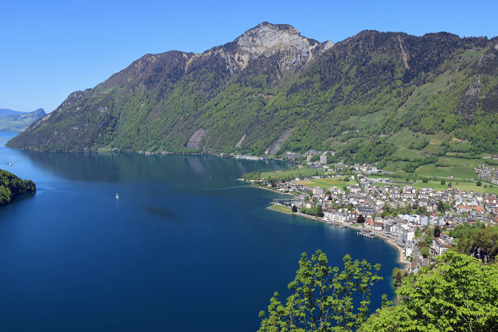 De route begint nu te stijgen. Via het wandelpad Gütschweg loop ik omhoog door Brunnen naar het bos. In het bos wandel ik via een onverhard wandelpaadje eerst naar het uitkijkpunt Chänzeli. Onderweg in het bos heb ik best wel wat wandelaars (en sporters) gezien, maar hier ben ik helemaal alleen. Het uitzicht vanaf Chänzeli is prachtig! Recht voor me ligt aan de andere kant van het Vierwoudstrekenmeer de Pilatus, de huisberg van Luzern. En ook links zie ik een prachtig panorama. Daarna loop ik verder door het bos omhoog richting het uitkijkplatform Axenstein. Ondanks dat het pad redelijk stijgt is het goed te doen. Het scheelt misschien ook dat ik hier een paar dagen geleden ook al liep, toen we rondom Morschach wandelden. Voor ik het weet ben ik bij het uitkijkplatform, waar ik nogmaals geniet van het uitzicht op het Vierwoudstrekenmeer. Ook zie ik rechts van me Brunnen liggen met daarachter de Rigi Hochflue.