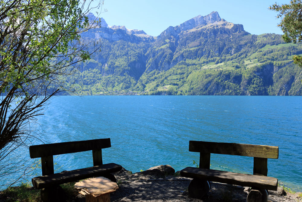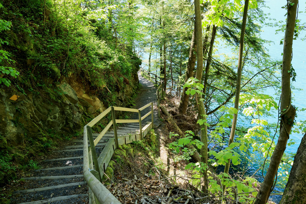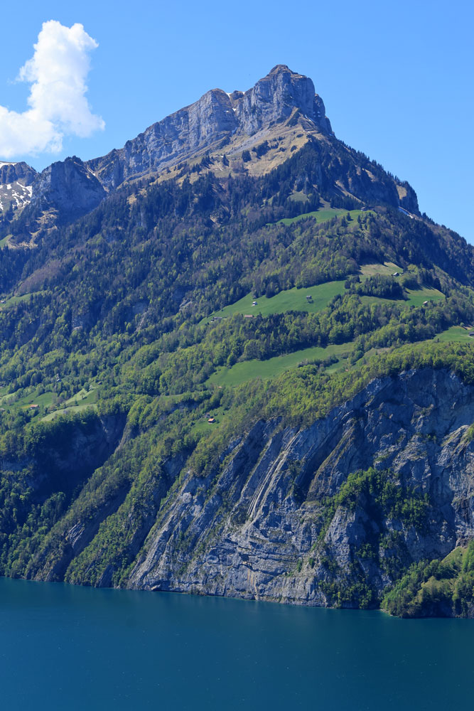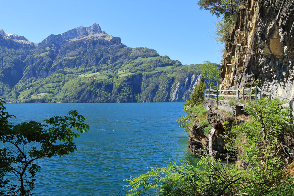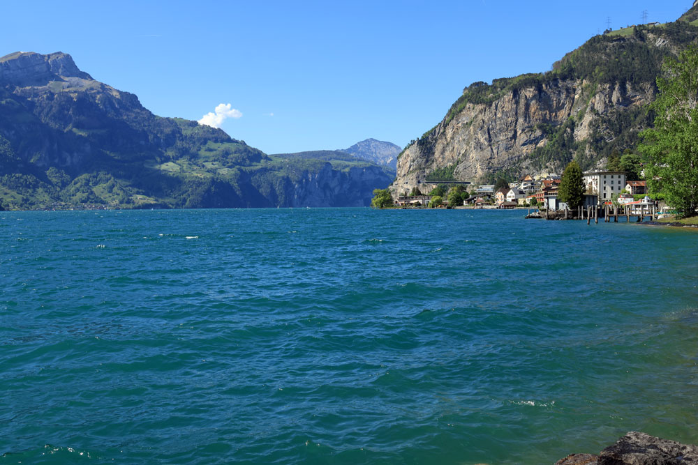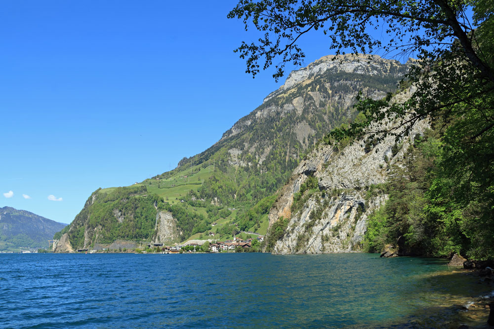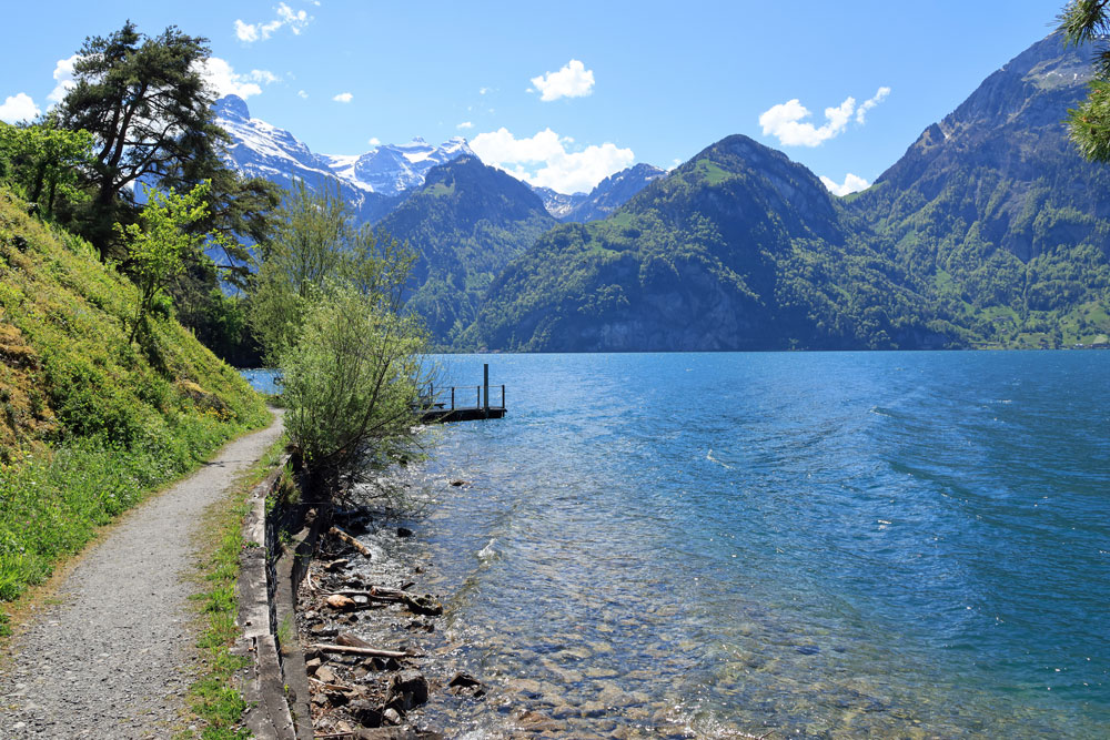 Via een zigzagpaadje daal ik enkele tientallen meters af waardoor ik vlak bij het water terechtkom. Je zou er bij wijze van spreken zelfs kunnen zwemmen. Heel tof om nu zo dichtbij het water te zien, waar ik net nog vele honderden meters boven wandelde. Achter me zie ik de weilanden waar ik zojuist doorheen wandelde toen ik over het grindpad met de afdaling naar Sisikon begon. En daarachter troont de hoge Fronalpstock. Het begin van deze etappe van de Weg der Schweiz is wat drukker dan de etappe tussen Morschach en Sisikon net. Maar dit is vooral omdat dit gedeelte vrij vlak is en nog vlakbij Sisikon ligt. Later wordt het steeds rustiger en kom ik nog maar af en toe iemand tegen. Dat is het voordeel van wandelen in het voorseizoen!