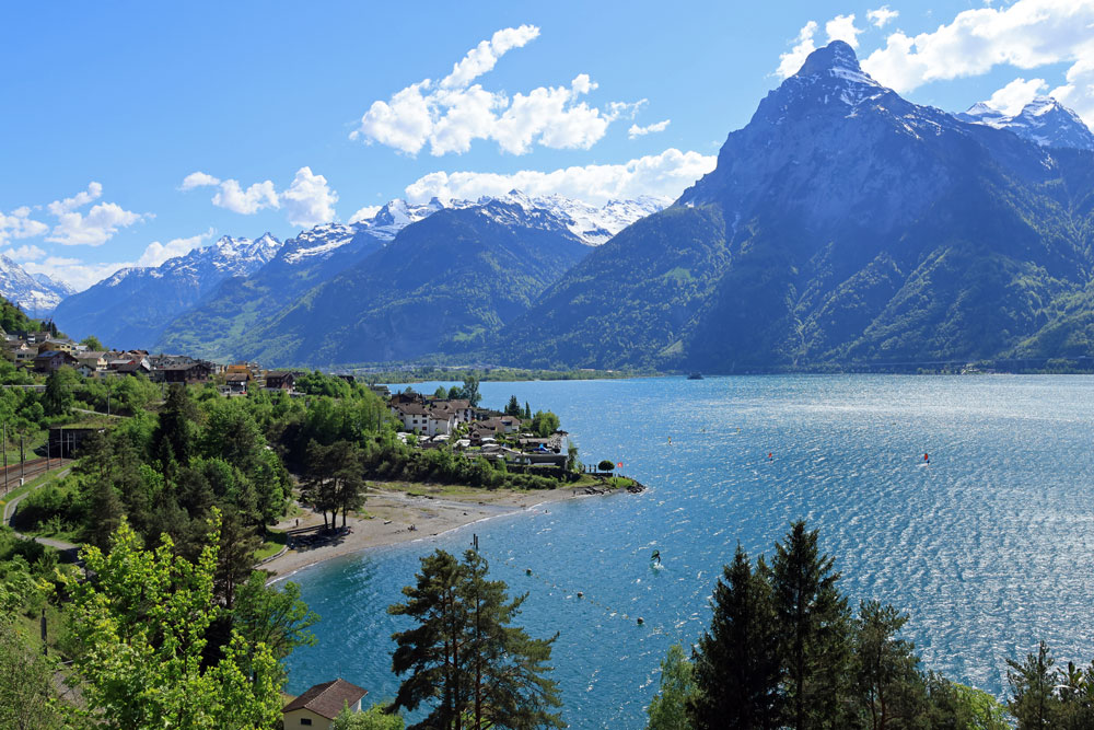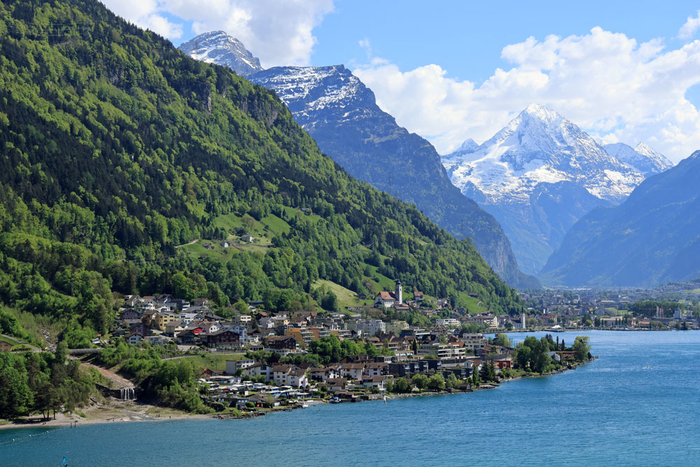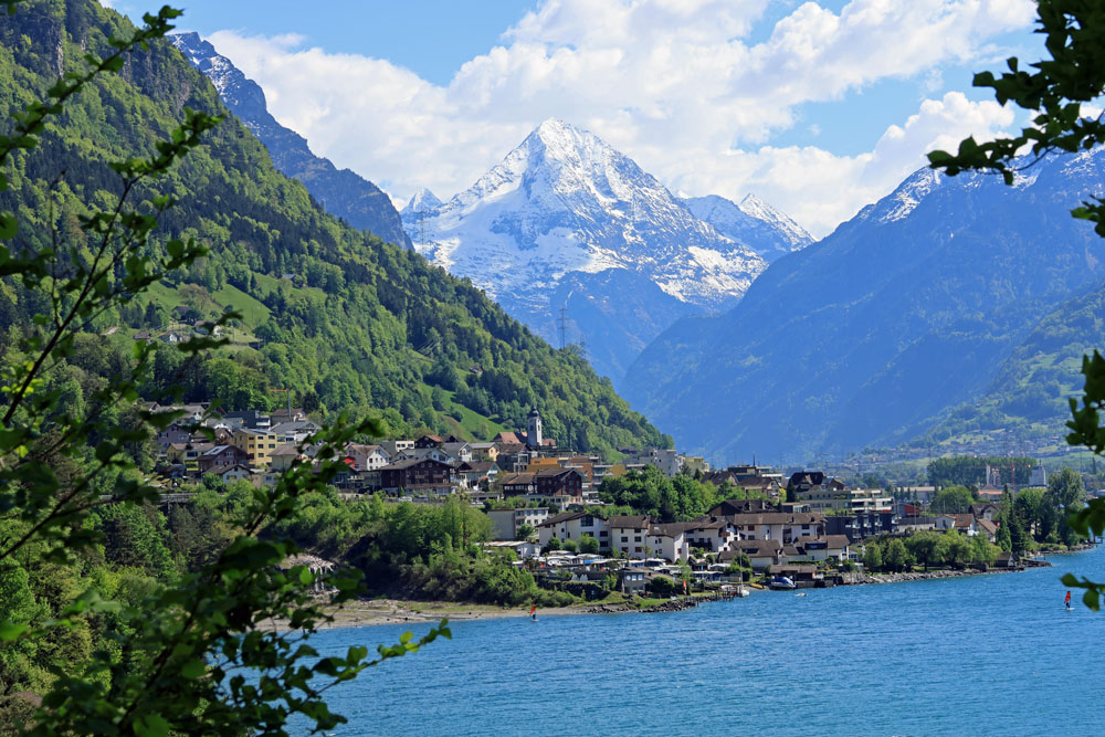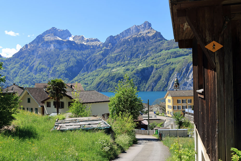 Als ik over de Bristenquai naar de haven van Brunnen loop zie ik voor me de Fronalpstock waar de bekende prachtige Stoos Ridge Hike gesitueerd is. Om me heen zie ik prachtige groene bossen, het knalblauwe meer en in de verte besneeuwde bergtoppen. Het is nu al ontzettend mooi. Brunnen is een heel toeristisch plaatsje bij het Vierwoudstrekenmeer, maar op deze laatste dag van april is de drukte nog goed te doen. Bij de opstapplaats voor de boot sla ik linksaf naar de Bahnhofstrasse, waar ik na 100 meter het eerste wegwijsbordje voor de Weg der Schweiz tegenkom. De hele route is goed gemarkeerd. Je kunt de plaatsnamen volgen waar je naar toe loopt (Morschach, Sisikon, Flüelen), maar ook de groene sticker met het cijfer 99 erop geeft de route van de Weg der Schweiz aan.