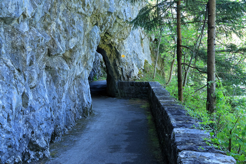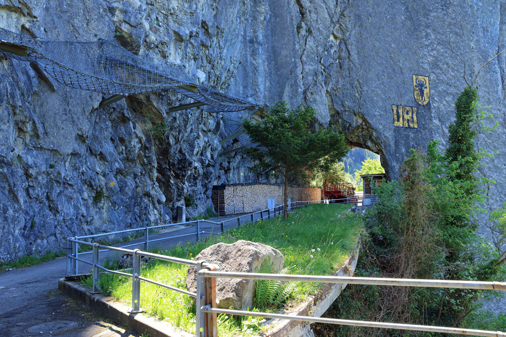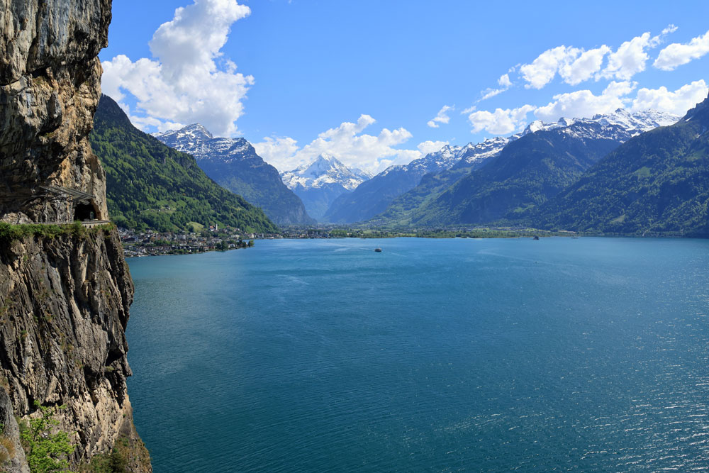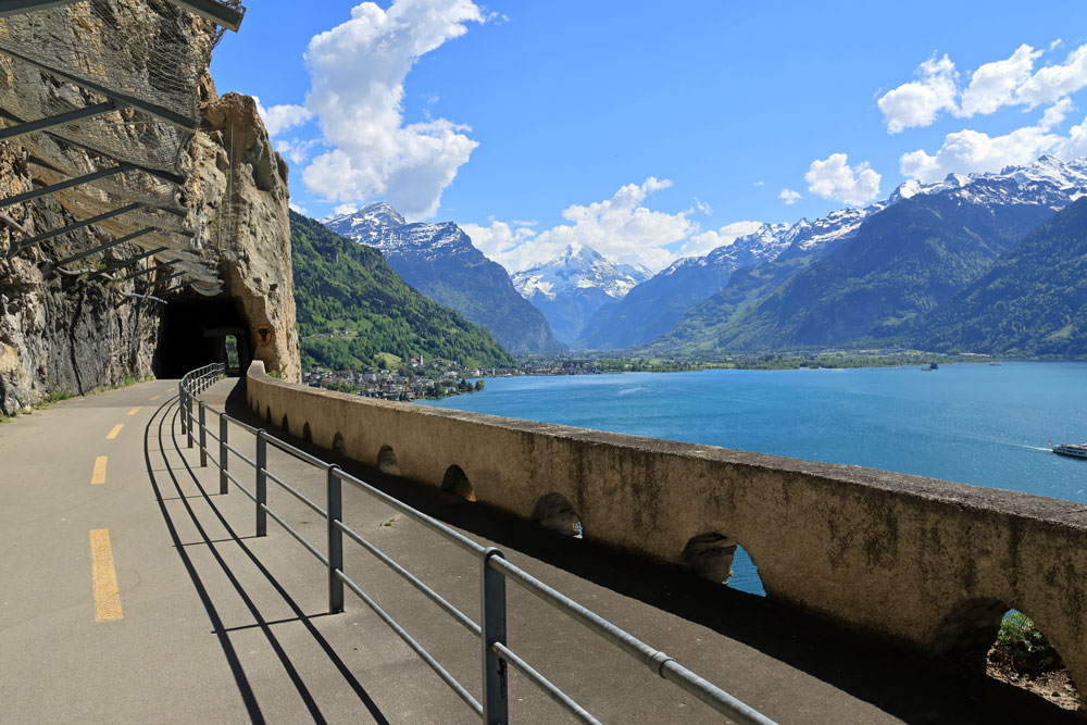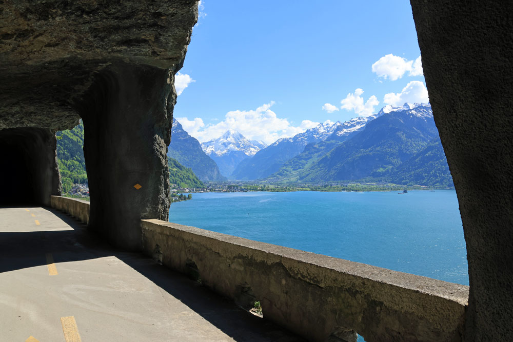 Na het klokkenspel loopt de route weer even langs het spoor om vervolgens naar de Axengalerie te gaan. Deze weg loopt rechts van de bergwand waar nu de tunnel doorheen loopt. Soms loop je een stukje door de tunnel, maar gelukkig gaat het wandelpad de meeste tijd buiten de tunnel om, waardoor je maar af en toe langs de auto’s komt. Het uitzicht op Flüelen, dat steeds dichtbij komt, is geweldig. Vooral de hoge besneeuwde berg erachter zorgt ervoor dat het een prachtig plaatje is.
