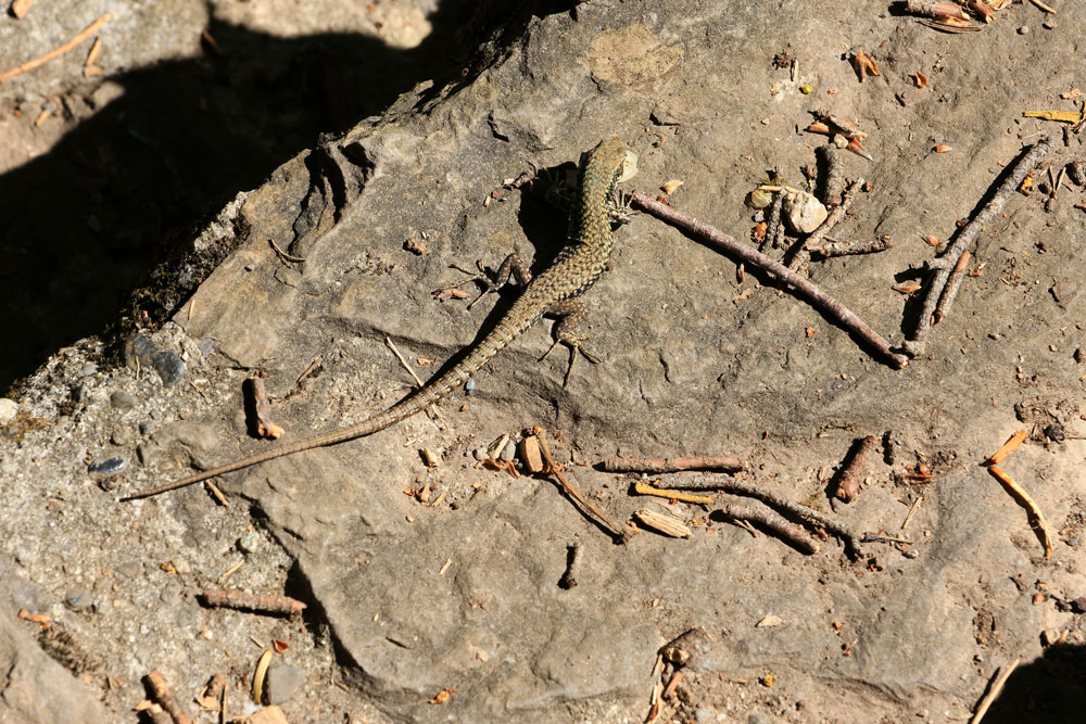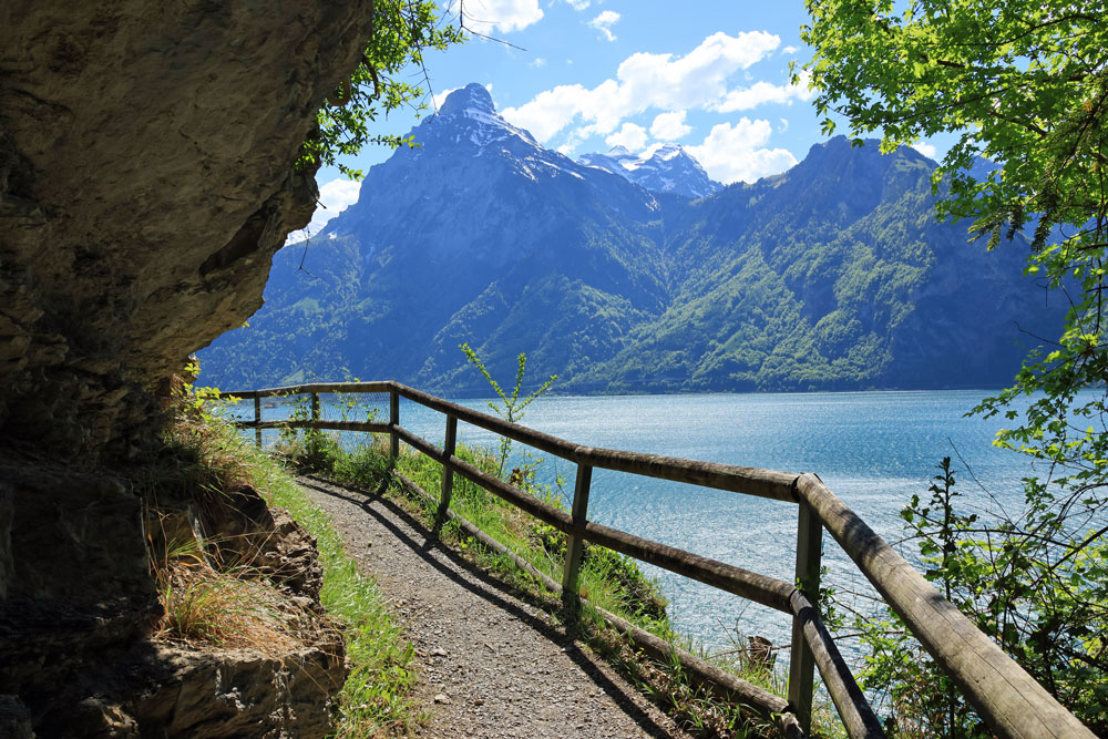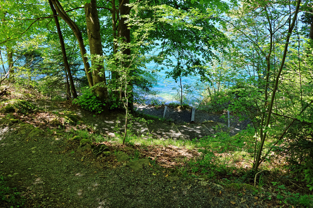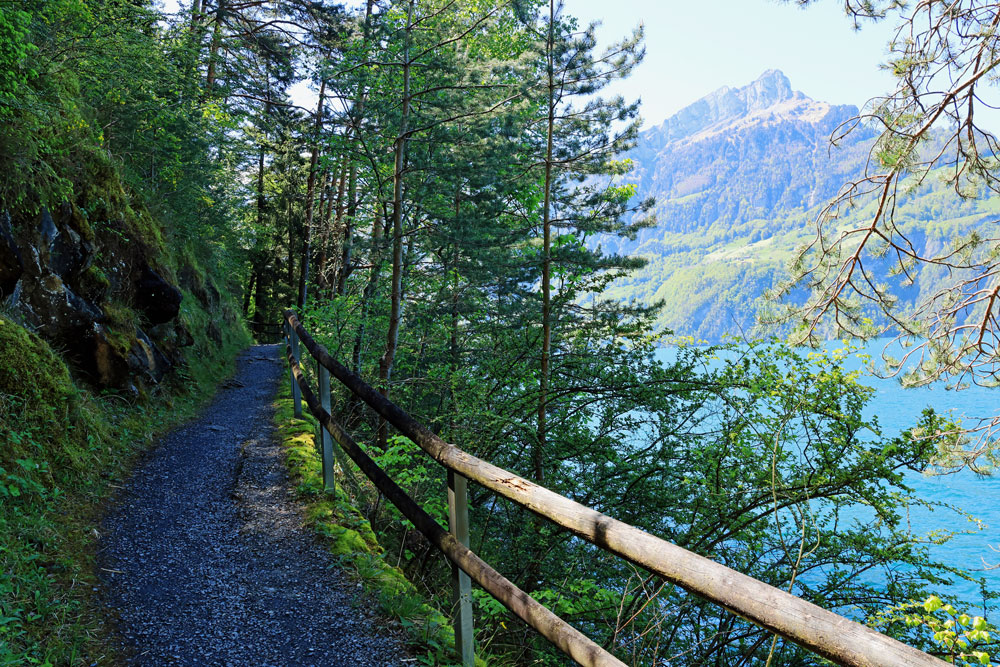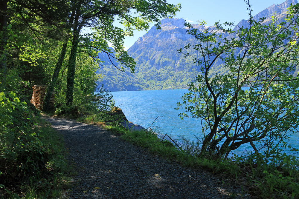 In Sisikon moet ik eerst onder het spoor doorlopen. Daar sla ik direct linksaf op het smalle wandelpad van grind. Ik had gelezen dat de etappe vanaf Sisikon vlak langs het water zou gaan, dus ik ben even in de war als het wandelpad een stuk boven het water blijft en zo nu en dan afbuigt en langs de autoweg loopt. Maar geen zorgen, het komt vanzelf goed en de rust blijkt straks weer terug te komen. Ik laat Sisikon verder achter me en wandel vlak langs een rotswand over het wandelpad. Zo nu en dan is het wandelpad ook even een fietspad, maar het fietspad buigt steeds weer af. Na een kilometer begint de afdaling naar het water dan echt.