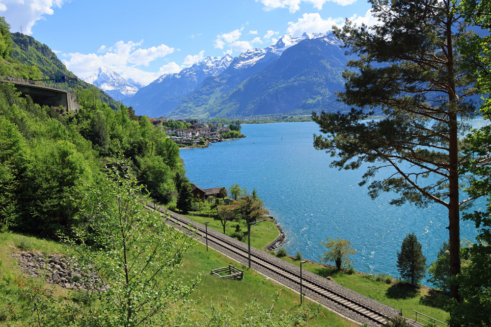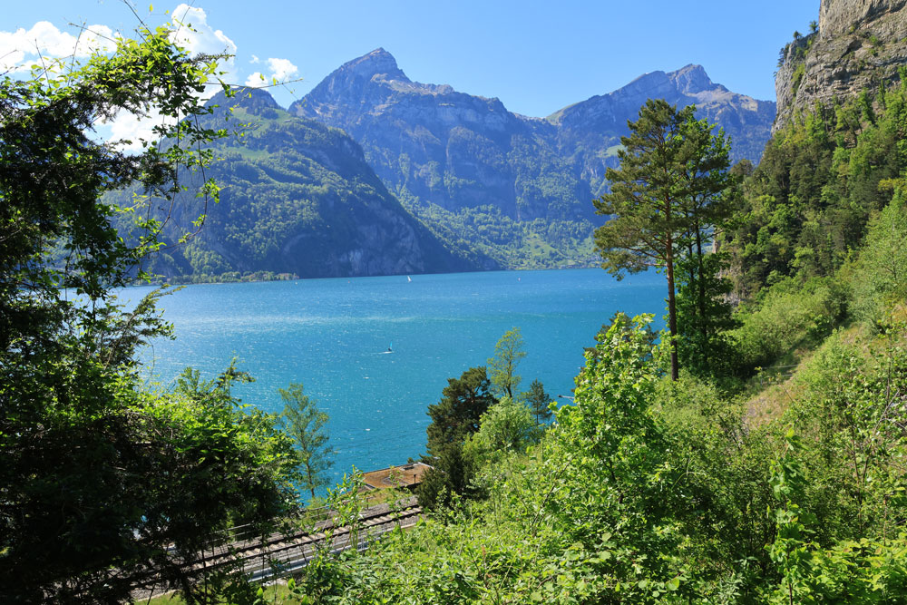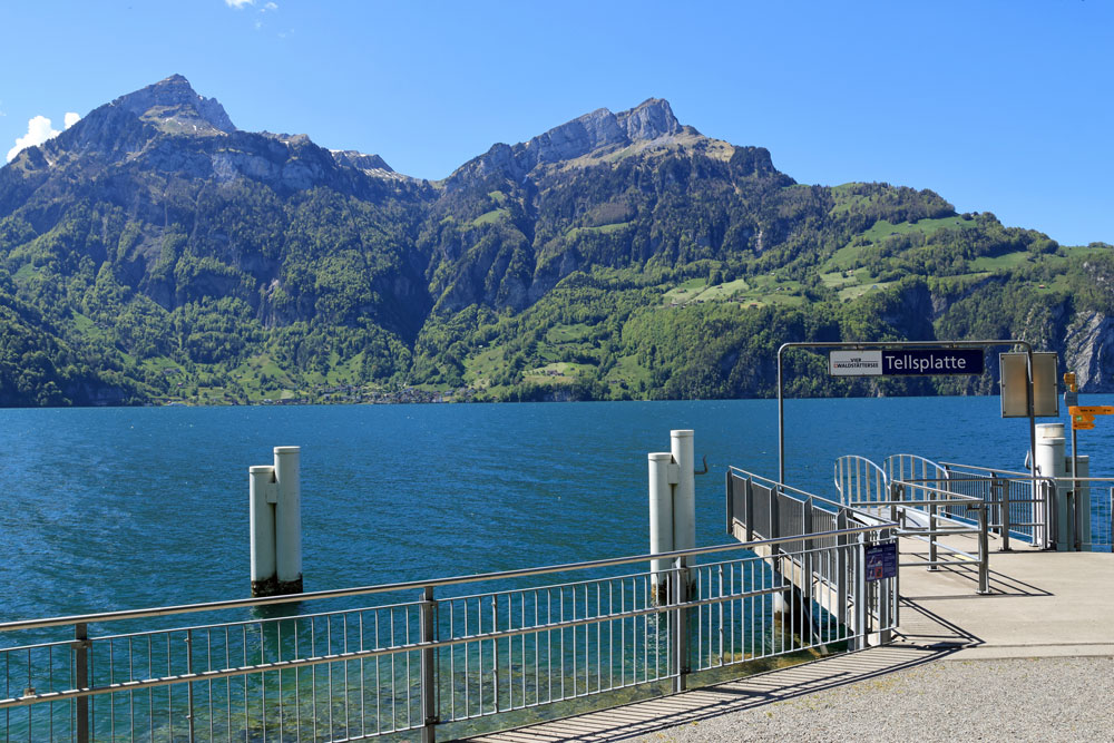 Het wandelpad ligt vanaf nu een heel stuk tussen het meer en het spoor in en ik hoor en zie de trein dan ook regelmatig voorbij komen. Ik ben weer blij dat we niet voor de camping in Sisikon hebben gekozen, want die camping ligt vlakbij het spoor en dan zou je dus meerdere keren per uur de denderende trein langs horen komen. De natuur is echter overweldigend mooi dit gedeelte. Het is een ongelofelijk mooie zonnige dag, waardoor het water zo knalblauw lijkt! Je zou er bijna zin van krijgen om te gaan zwemmen. Tweeënhalf kilometer nadat ik Sisikon verlaten heb kom ik aan bij de Tellsplatte.